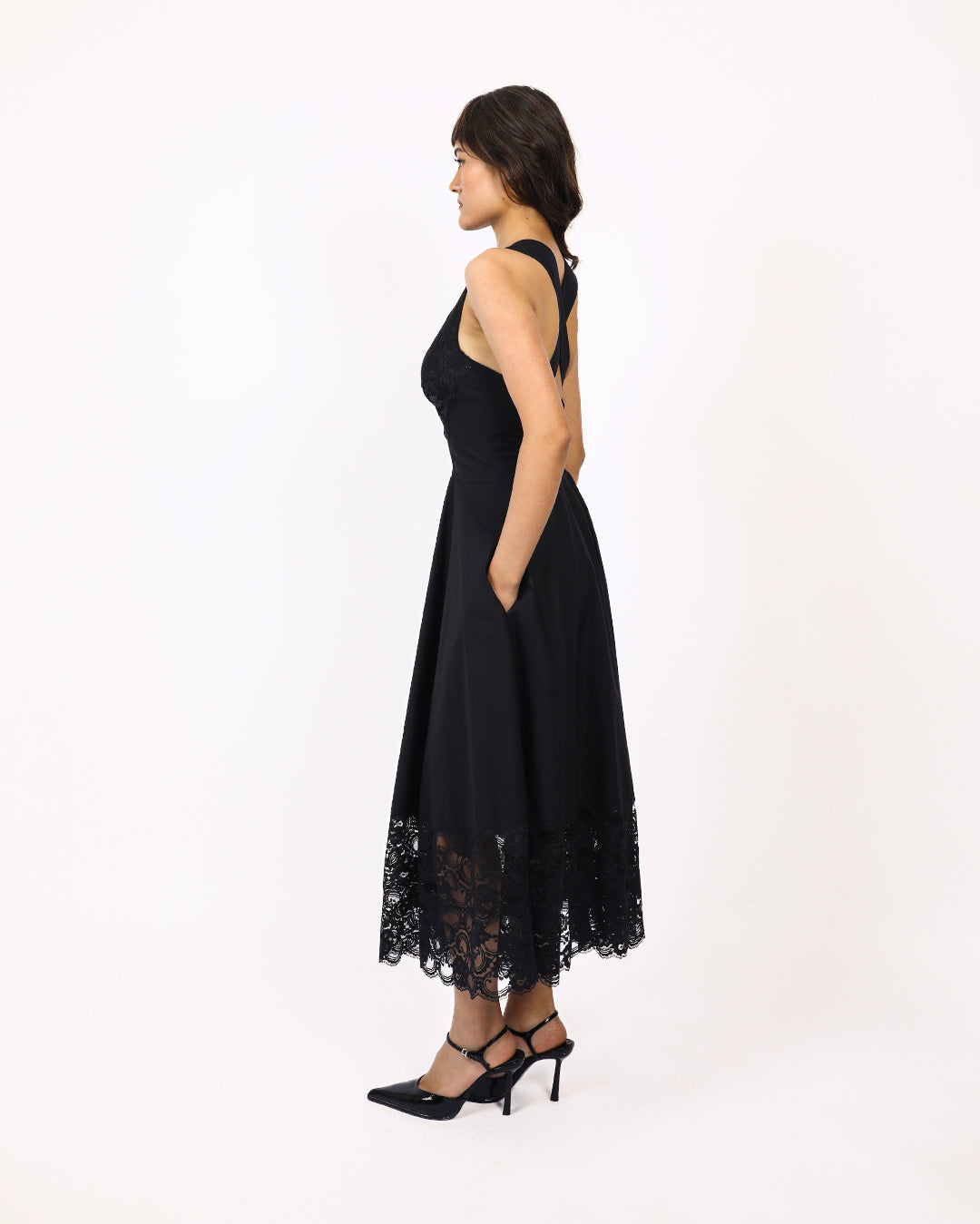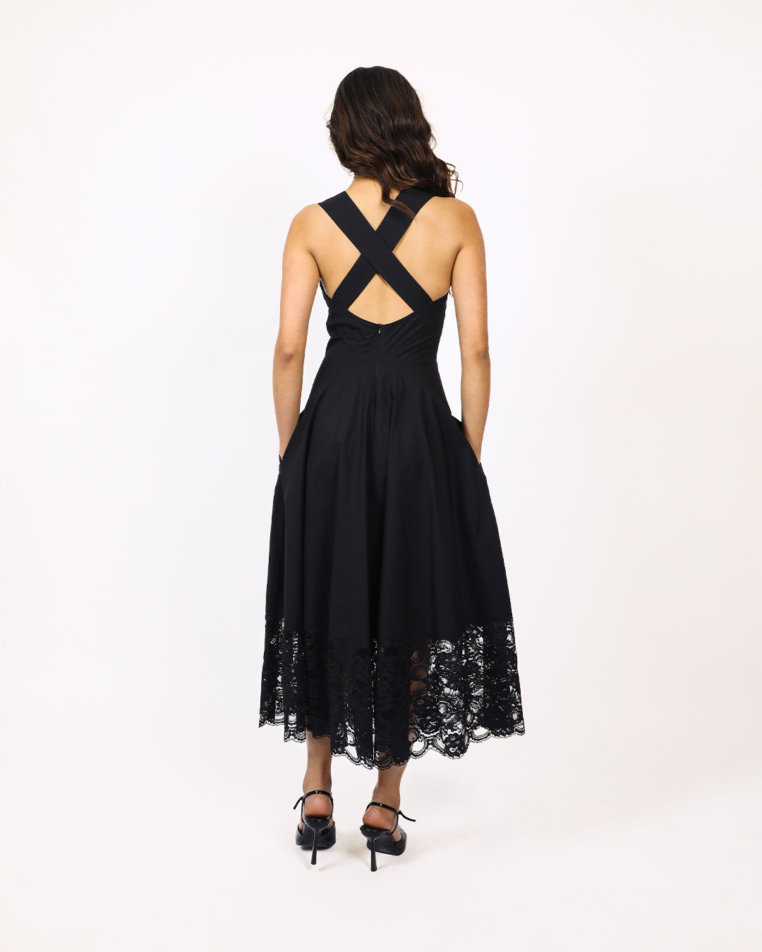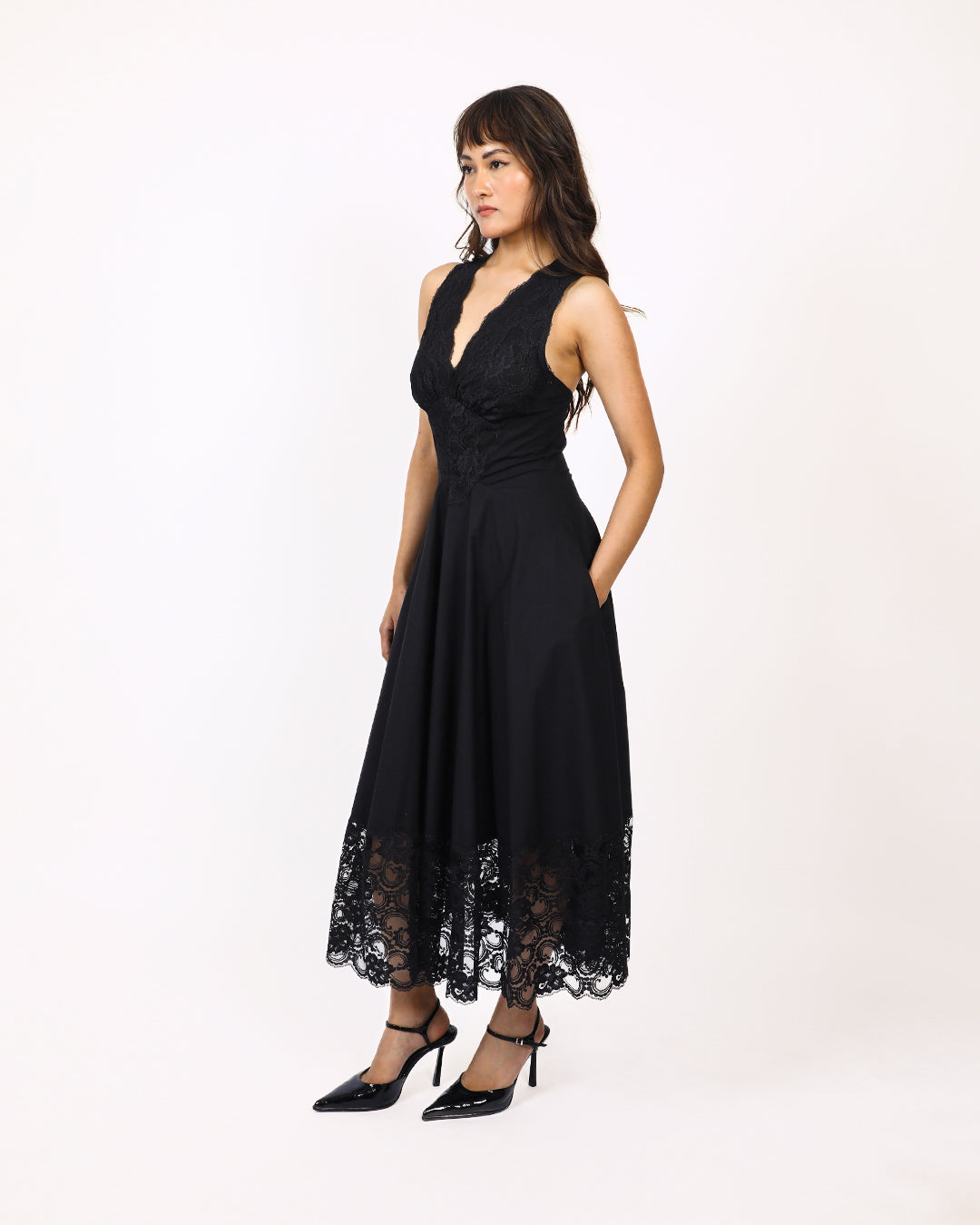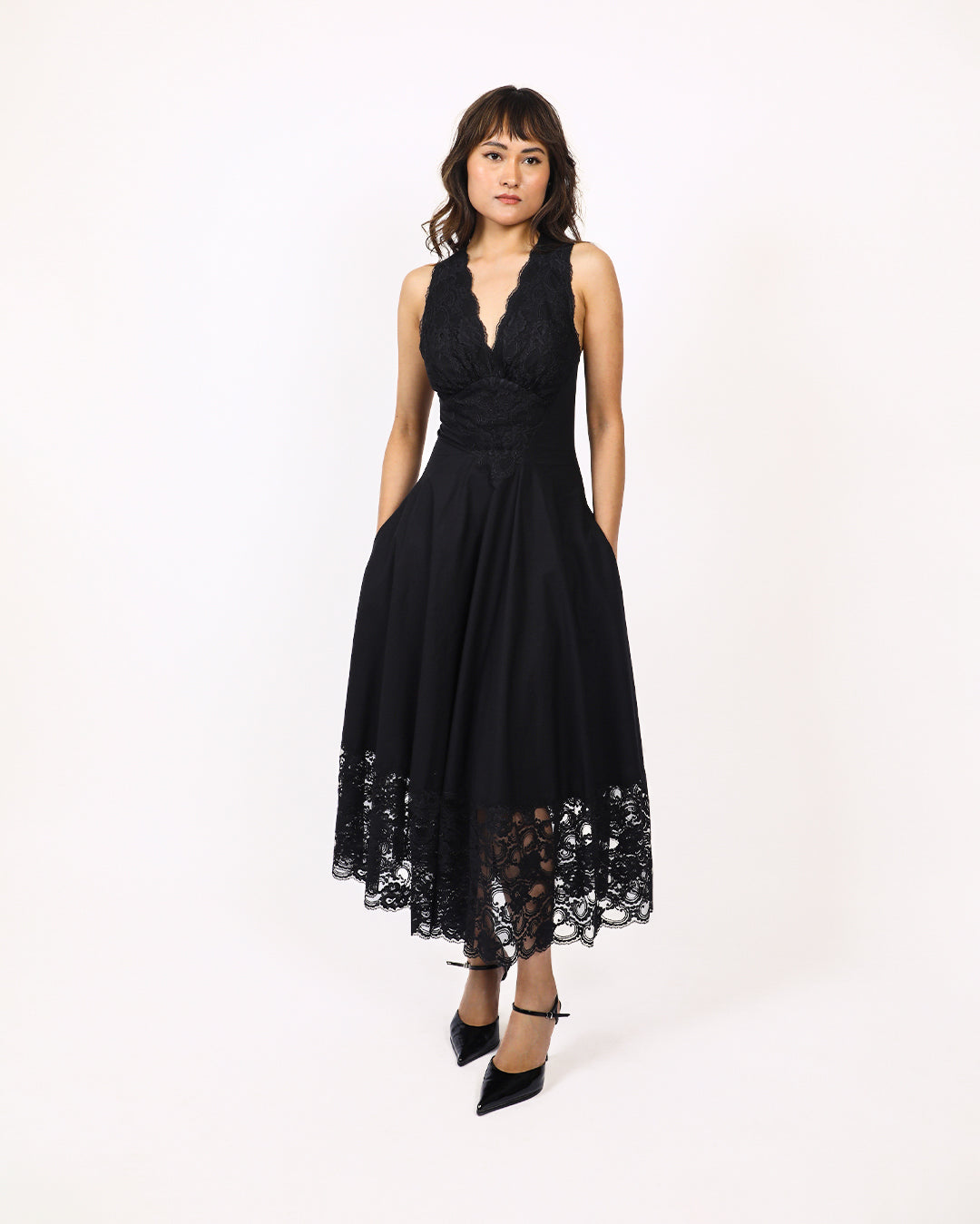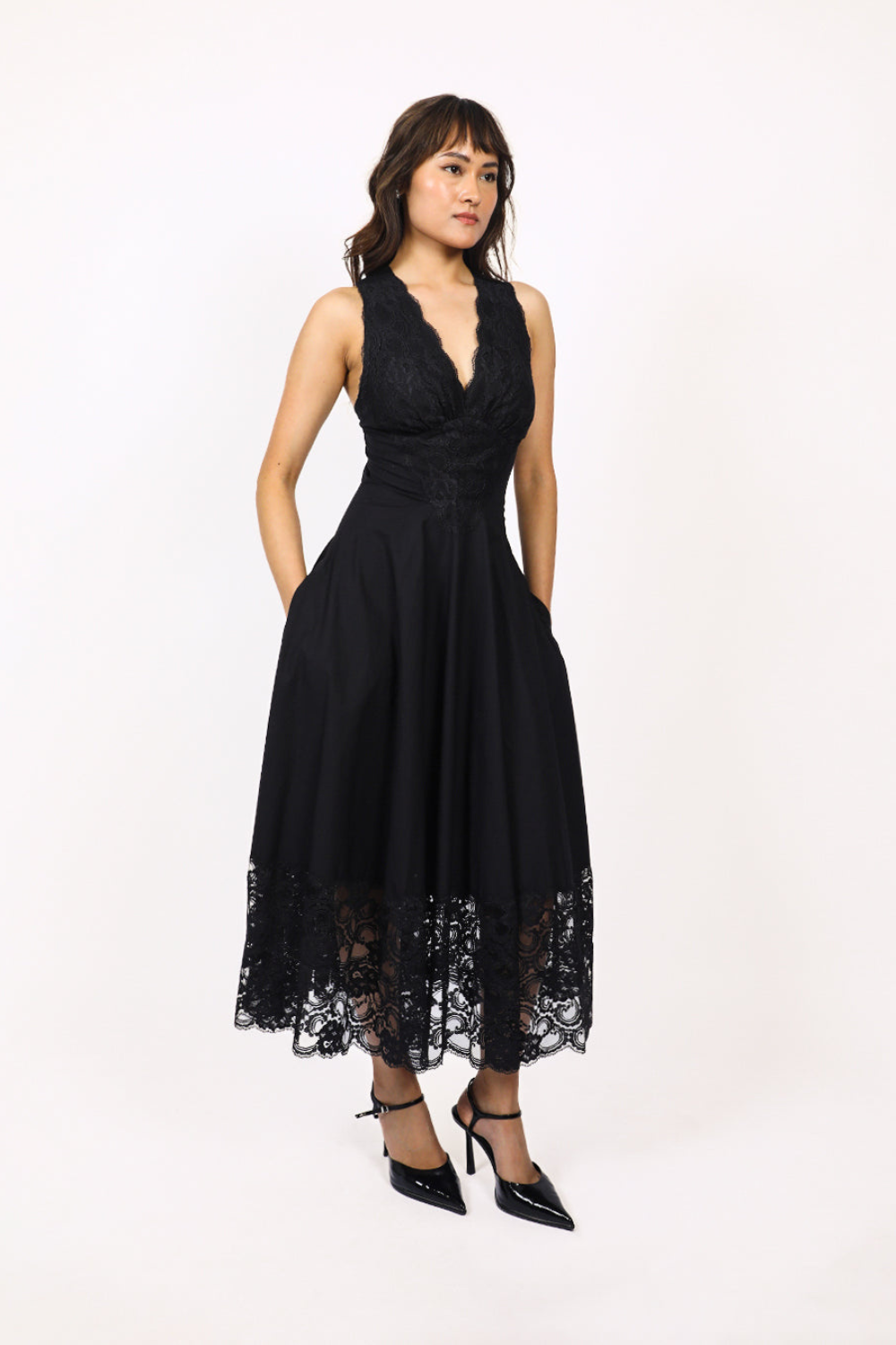 Fitted at waist and circular at bottom this romantic midi length dress is made in 100% cotton fabric and lace featuring plunging neckline with lace cutouts at the bust and V-shaped midriff to fit and flatter, with strap detailing at back, finished off with intricate lace panels at bottom skirt with scalloped edge. Model height is 5'8" Model wear size S garment length is 50"