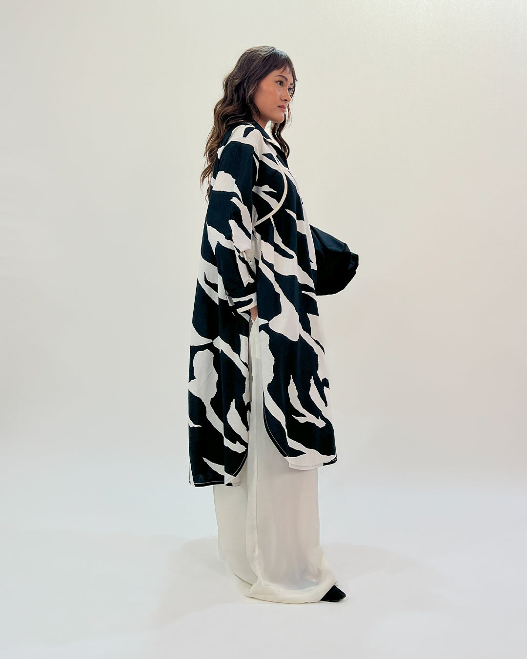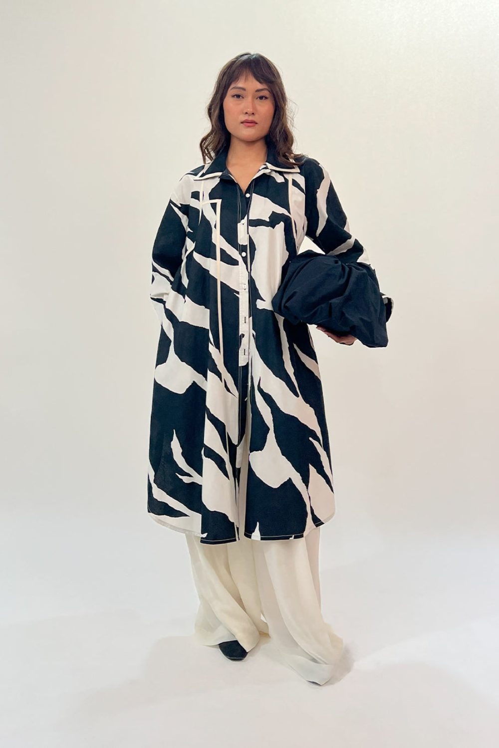 This long shirt dress combines clean lines with subtle design details for a refined look. It features side plackets that create a sleek, functional detail, with curved hemline. The contrast curved tapes with slight gathers that introduce a relaxed, comfortable element. Enhancing the overalll look with contrast tapes on the collar and cuffs, offering a crisp, polished finish. Model wear size S model height is 5'8 garment length is 45"