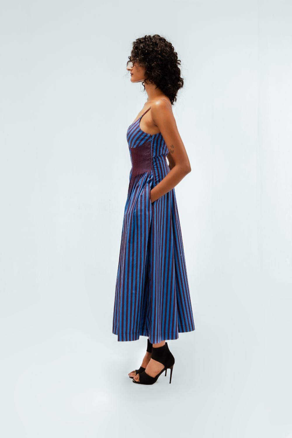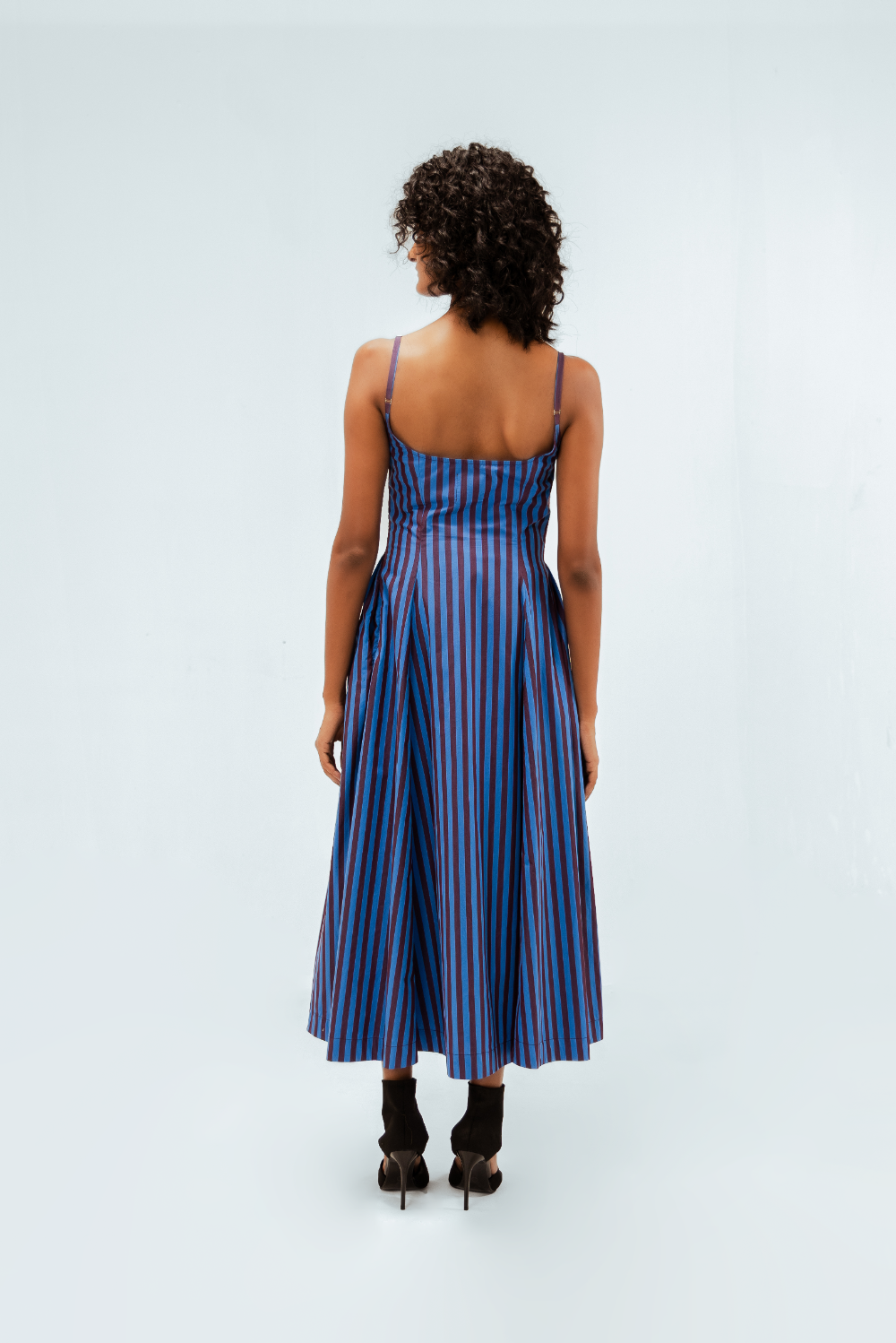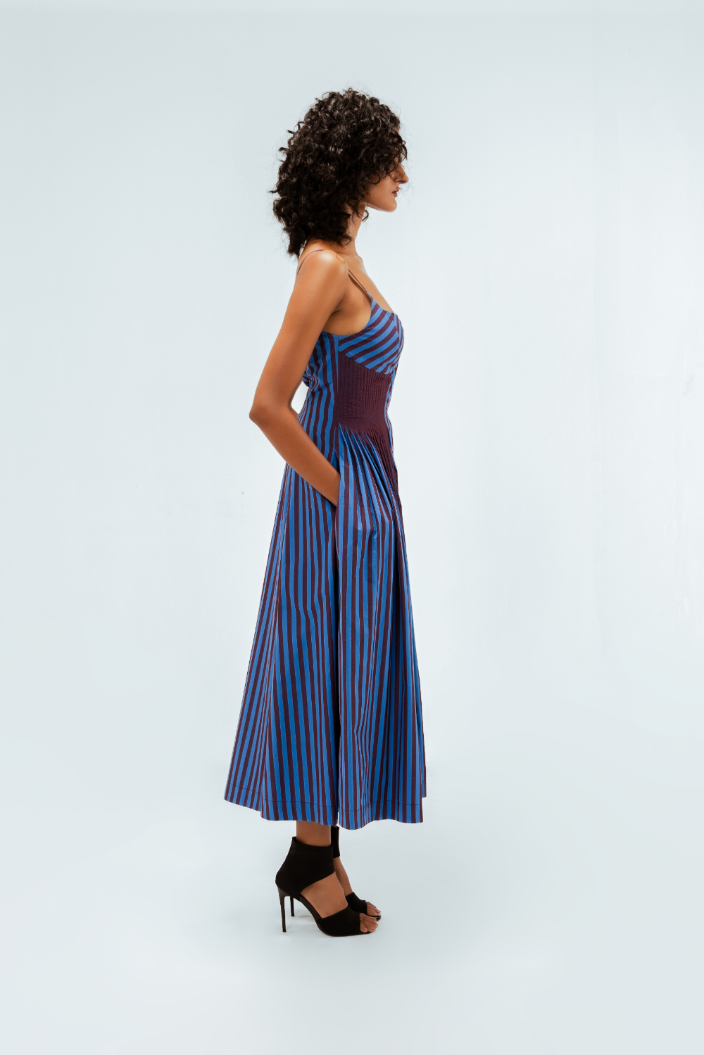 This striped cotton midi dress features a sculpted bodice with fine strap detailing and directional stripe placement that accentuates the bust. The waist is defined with pleated side panels, creating controlled volume. Model Height is 5'9". Model wears size S. Garment length is 50"