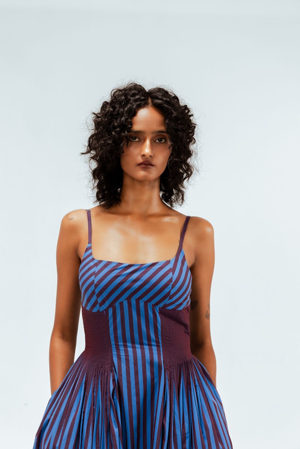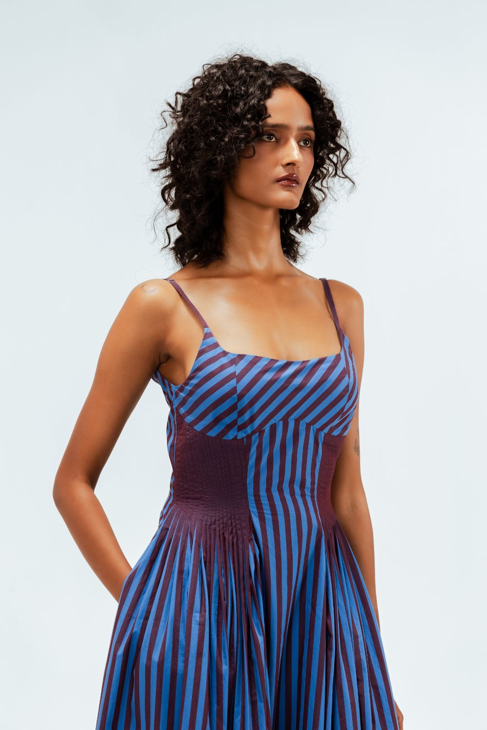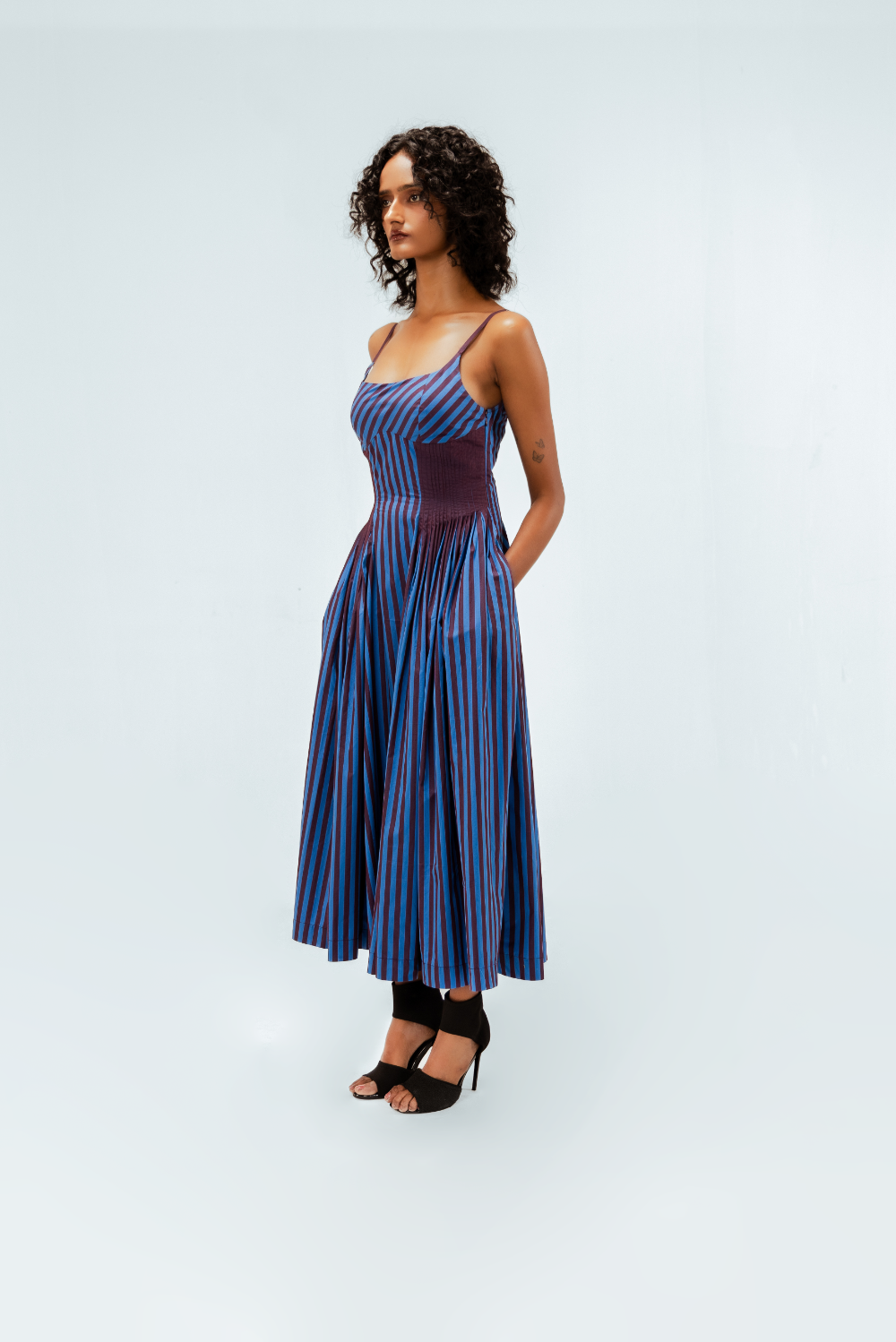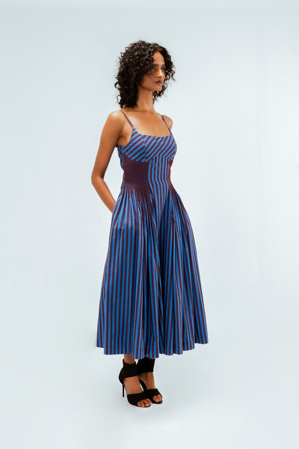 This striped cotton midi dress features a sculpted bodice with fine strap detailing and directional stripe placement that accentuates the bust. The waist is defined with pleated side panels, creating controlled volume. Model Height is 5'9". Model wears size S. Garment length is 50"
