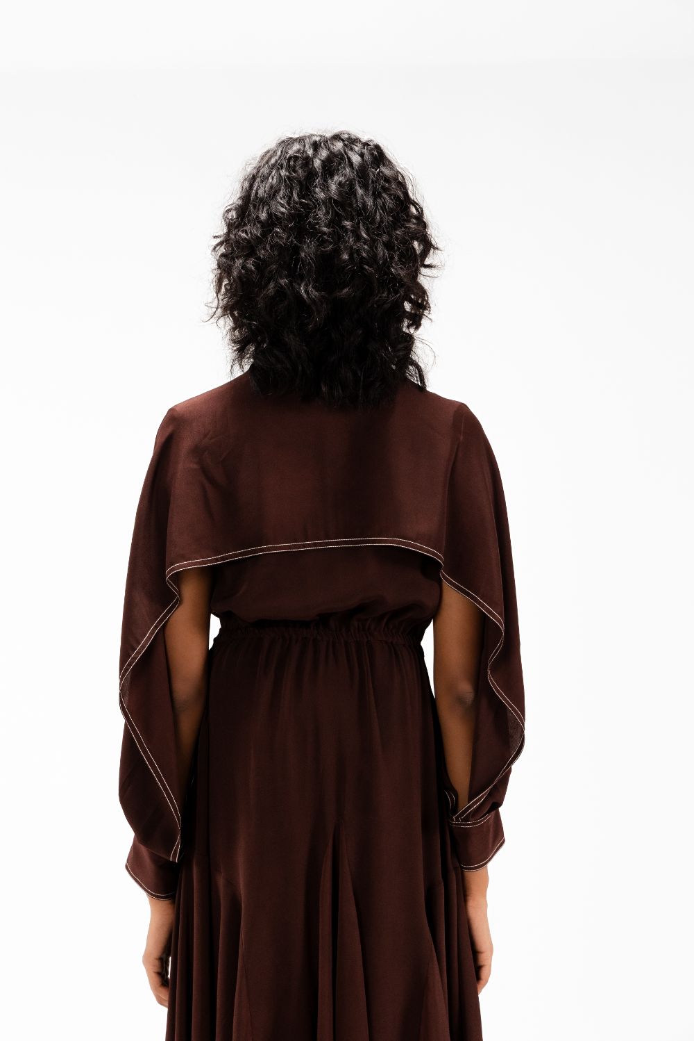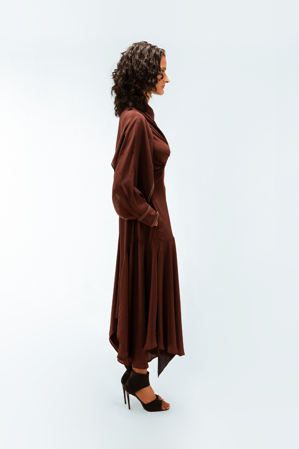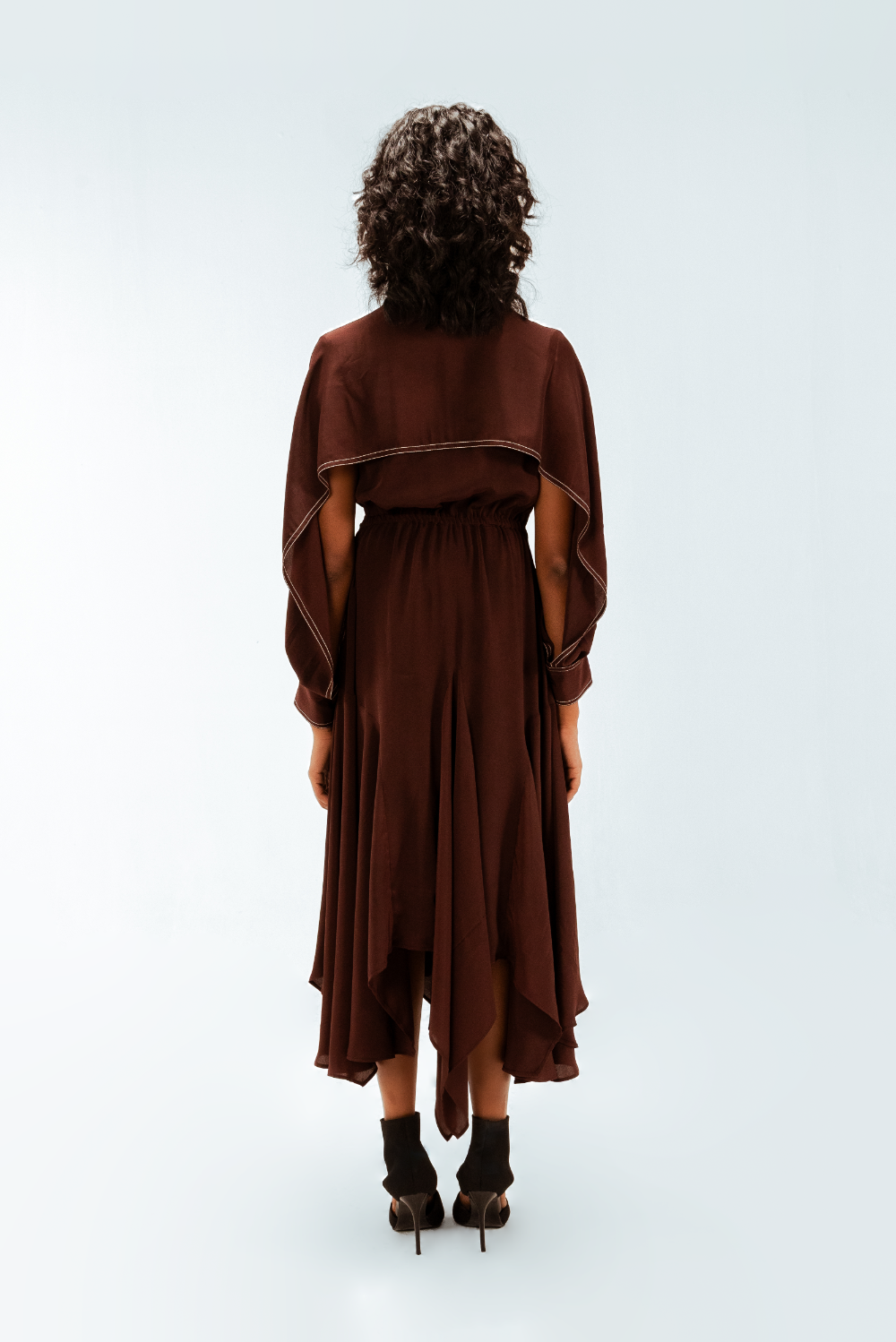 Tailored in fluid crepe, this midi dress features a precisely engineered center curved panel that sculpts the silhouette with subtle definition. Open-yoked sleeves fall into controlled, flowy drapes, adding a refined softness to the structured form. Finished with an asymmetric handkerchief hem and sharp contrast stitch detailing. Model Height is 5'9". Model wears size S. Garment length is 55"