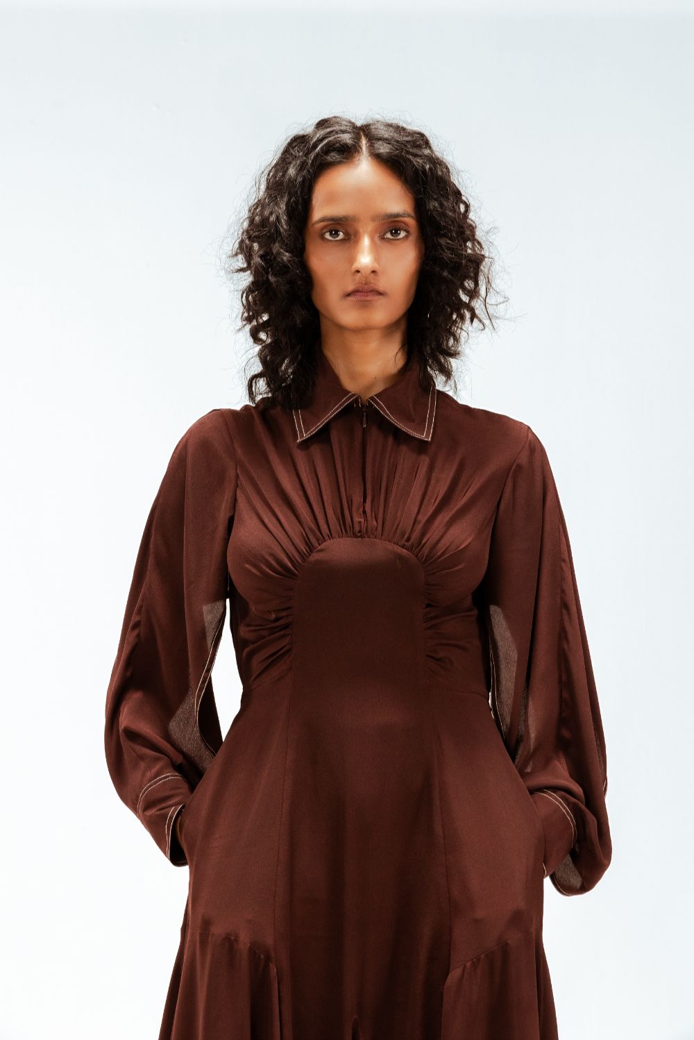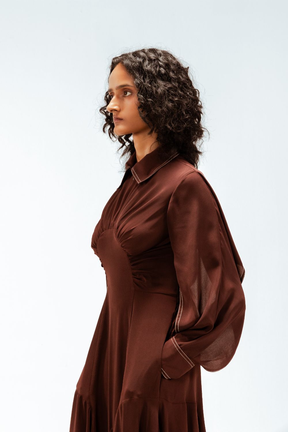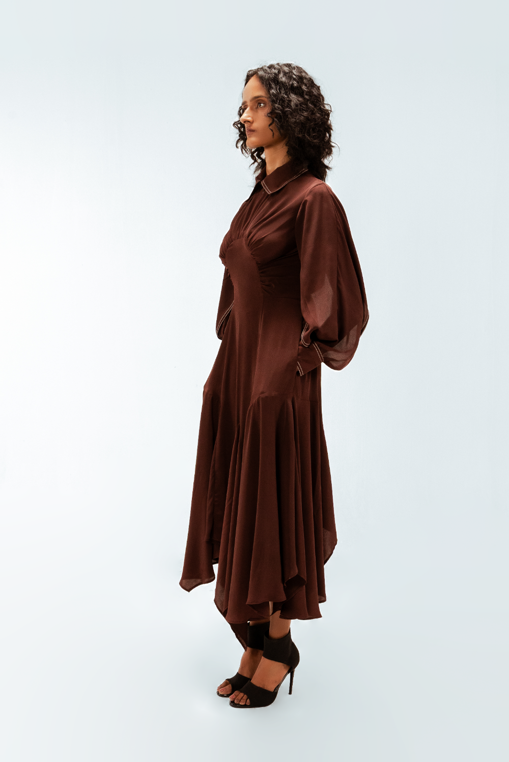 Tailored in fluid crepe, this midi dress features a precisely engineered center curved panel that sculpts the silhouette with subtle definition. Open-yoked sleeves fall into controlled, flowy drapes, adding a refined softness to the structured form. Finished with an asymmetric handkerchief hem and sharp contrast stitch detailing. Model Height is 5'9". Model wears size S. Garment length is 55"