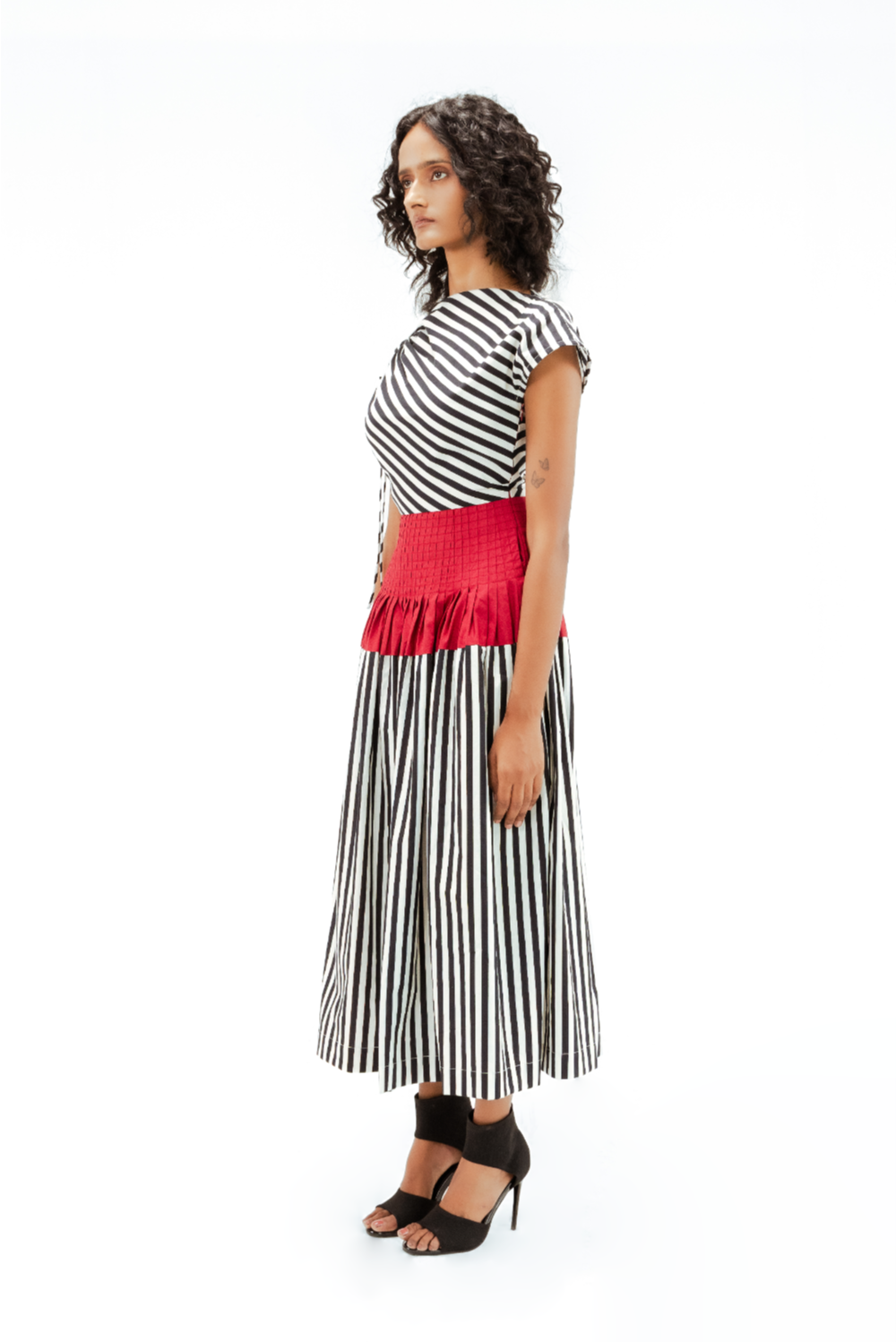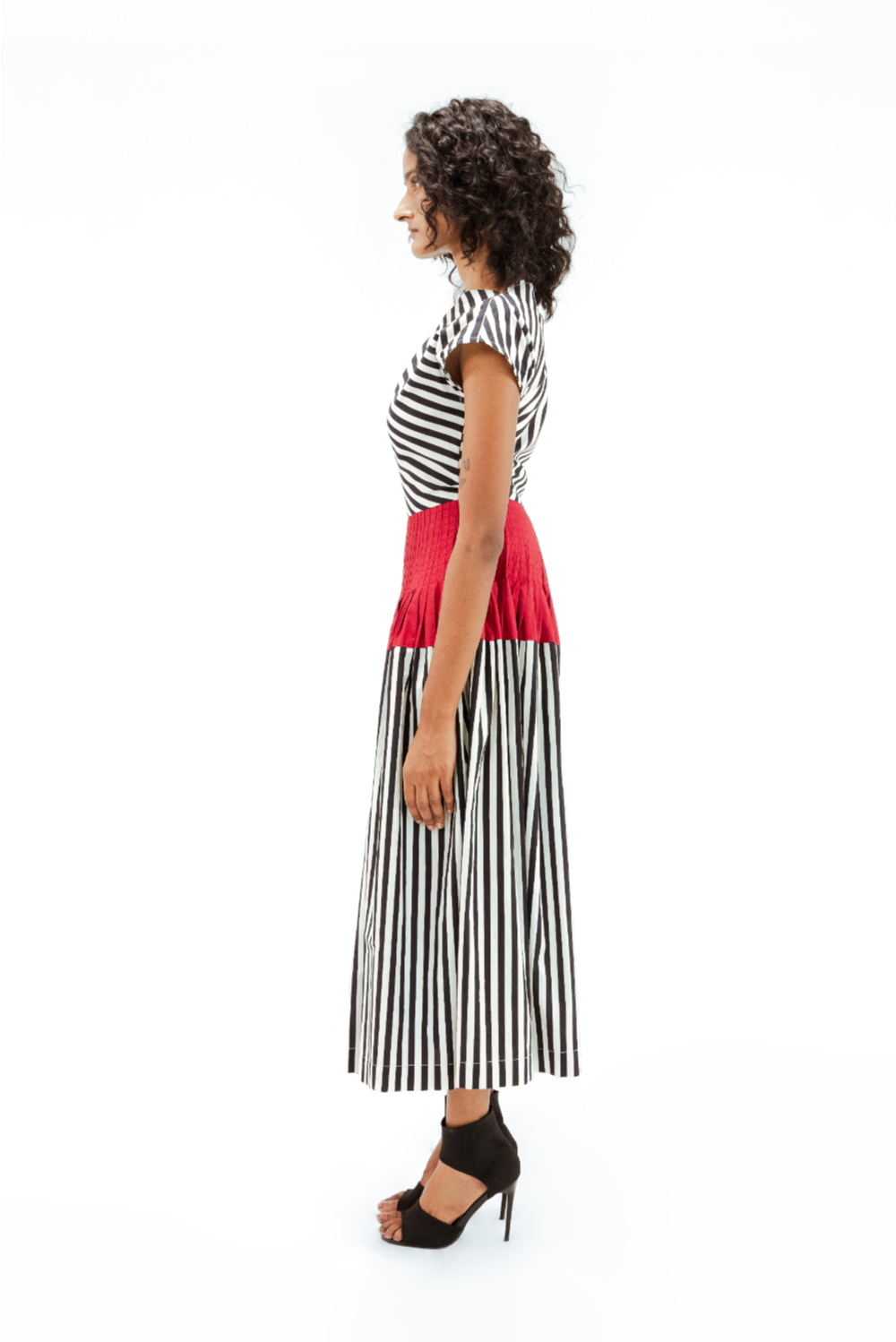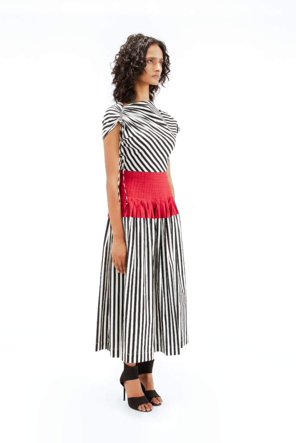 Crafted in striped cotton, this midi dress features an artful play of structure and fluidity with an asymmetric neckline ruched and draped on one side, the other a relaxed drop shoulder. The contrast waist panel is cinched with soft pleats and elevated by topstitch detailing, creating a silhouette that feels both sculptural and effortless. Model Height is 5'9". Model wears size S. Garment length is 50"