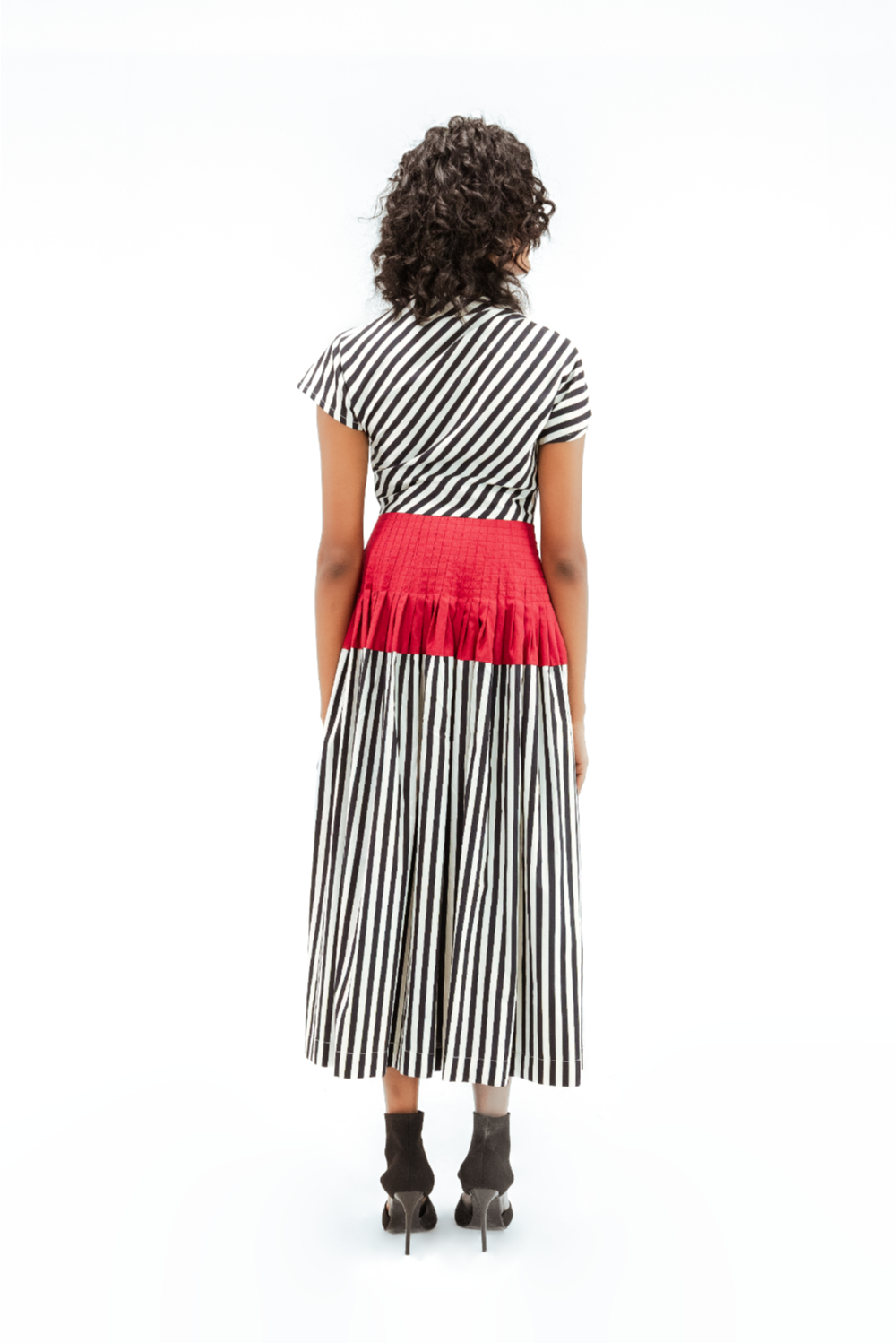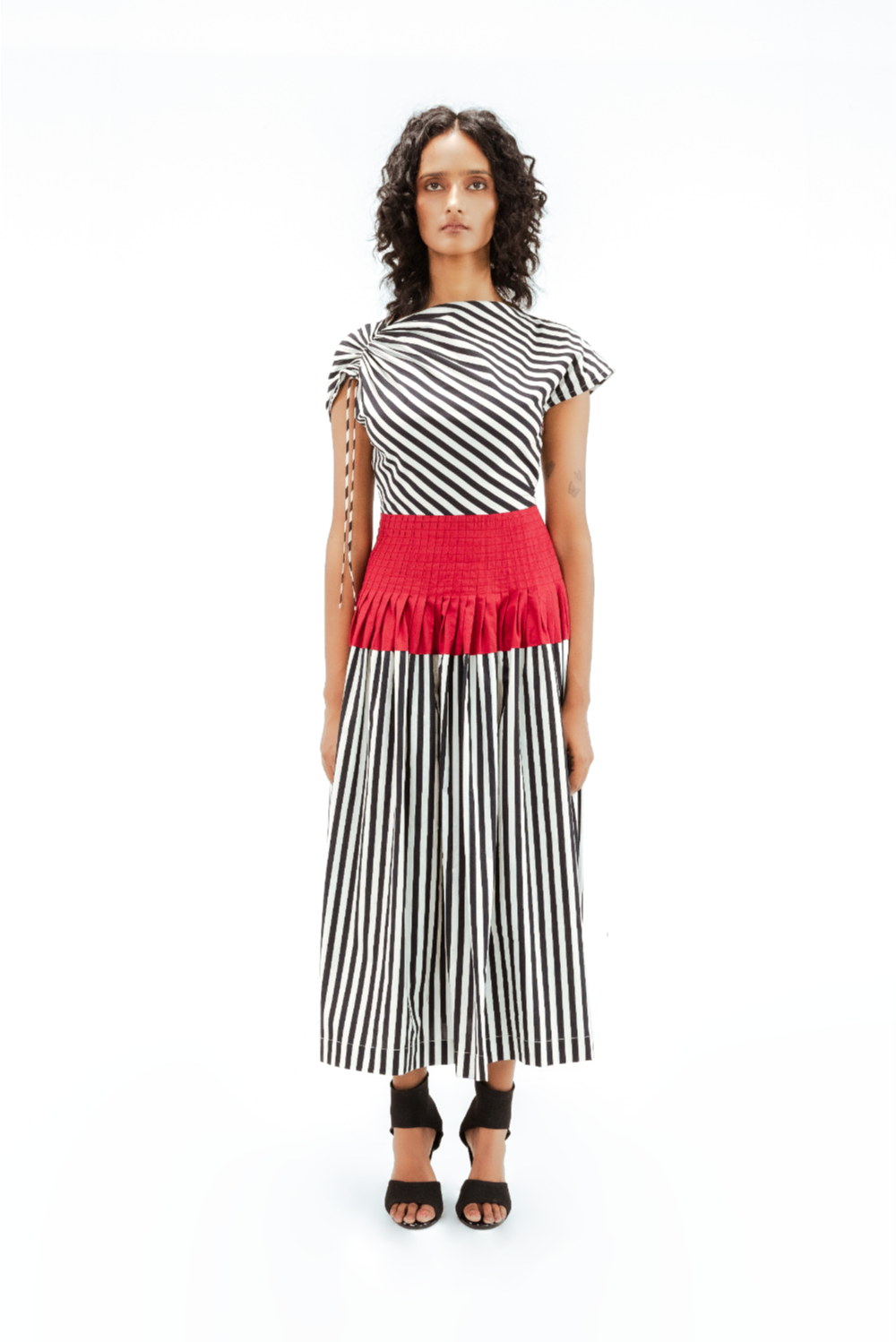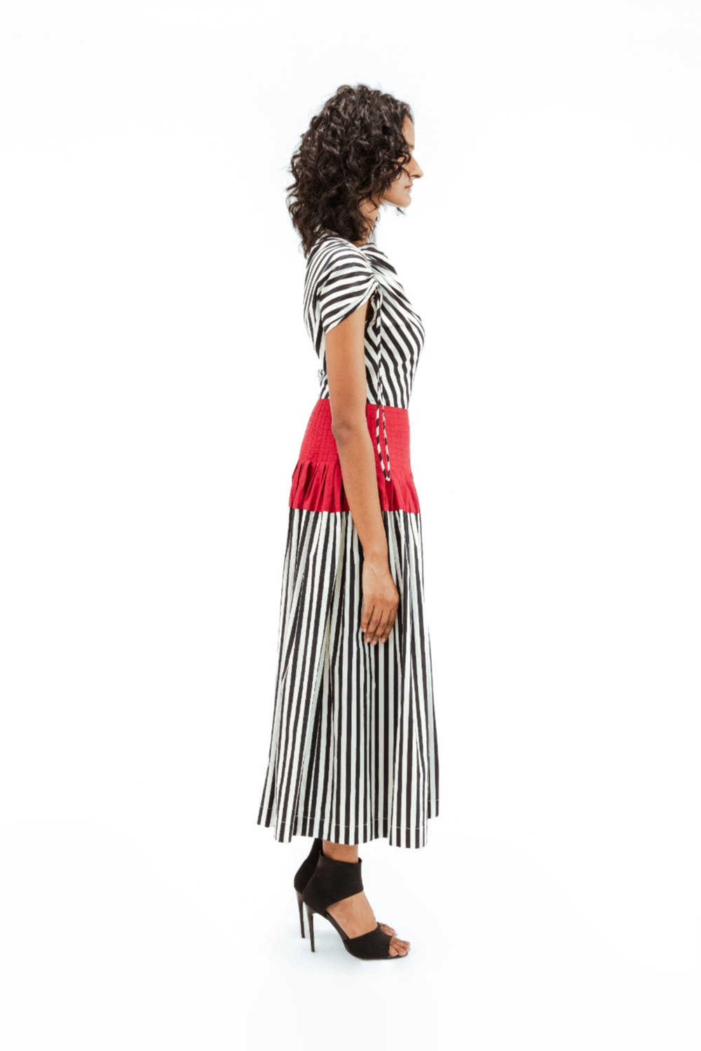 Crafted in striped cotton, this midi dress features an artful play of structure and fluidity with an asymmetric neckline ruched and draped on one side, the other a relaxed drop shoulder. The contrast waist panel is cinched with soft pleats and elevated by topstitch detailing, creating a silhouette that feels both sculptural and effortless. Model Height is 5'9". Model wears size S. Garment length is 50"