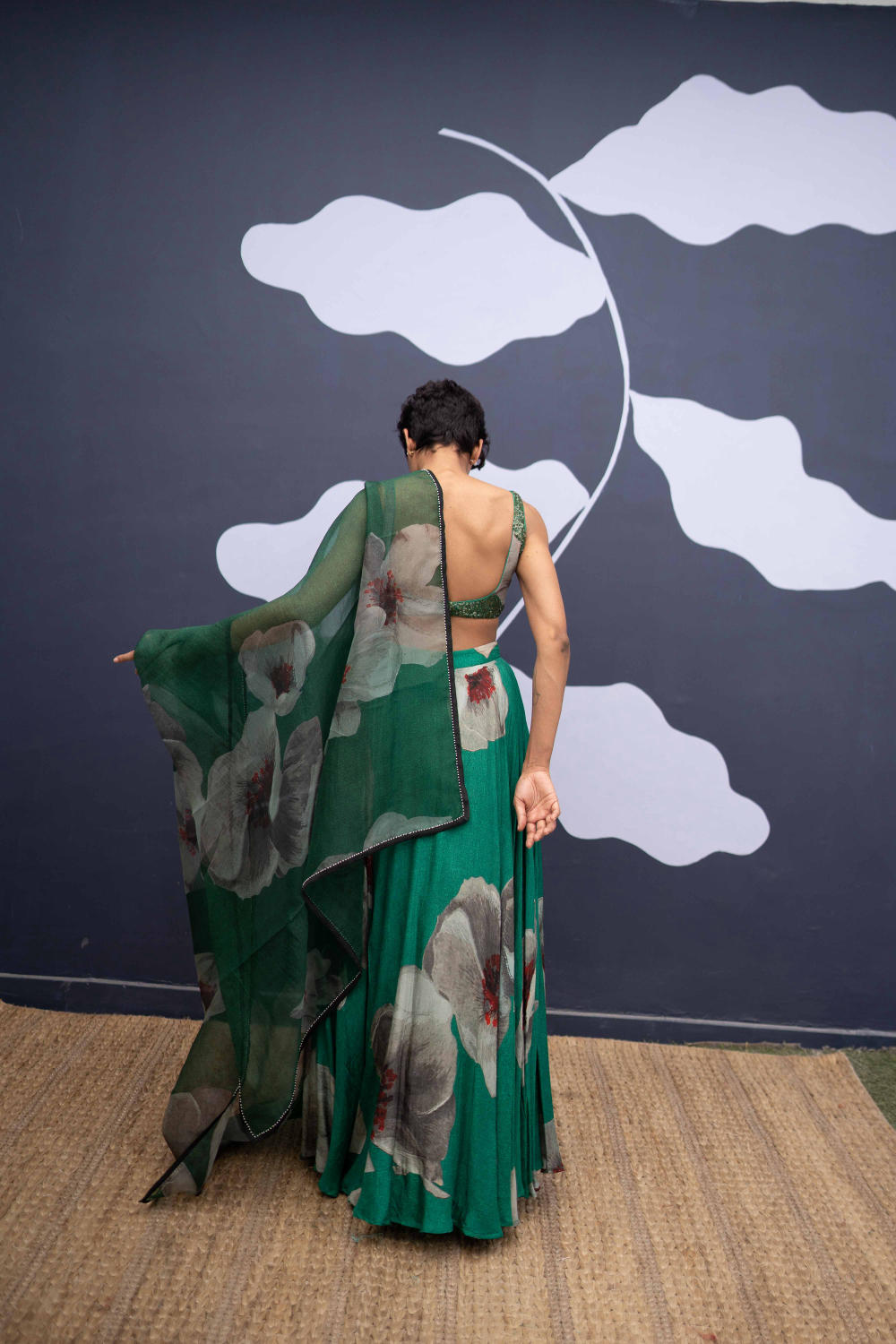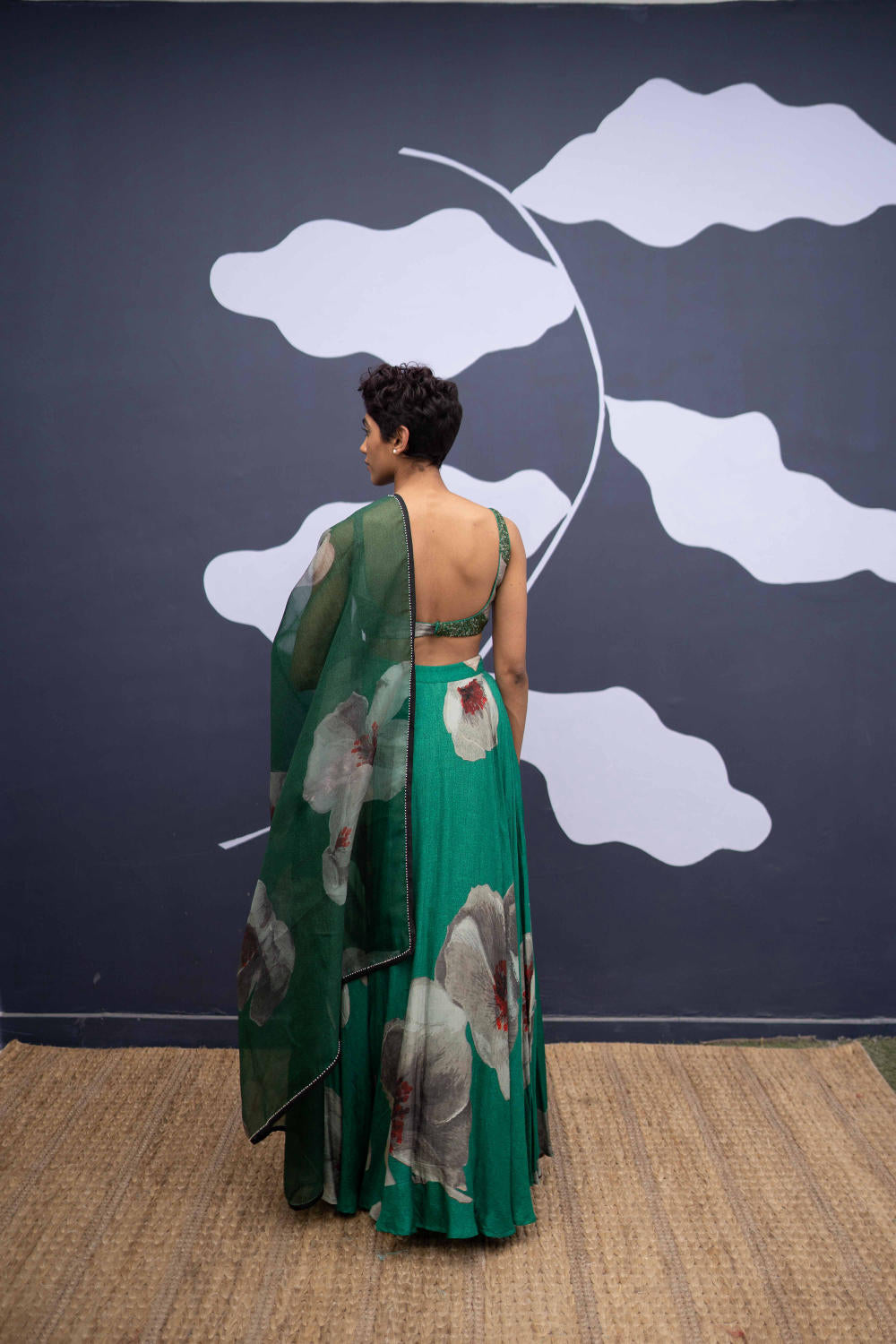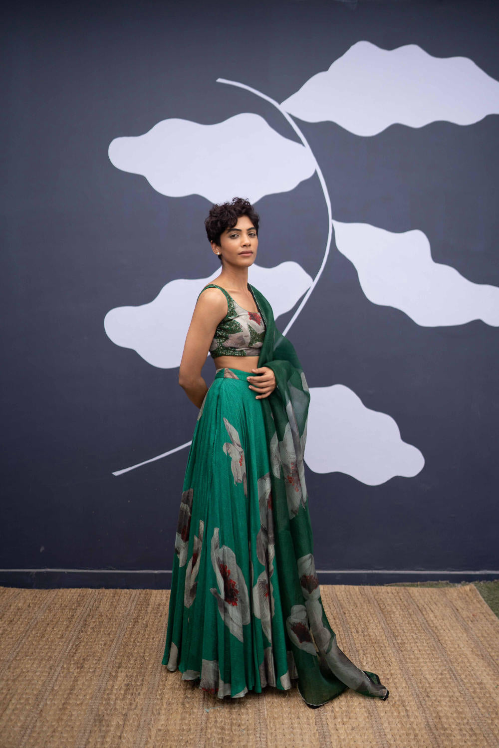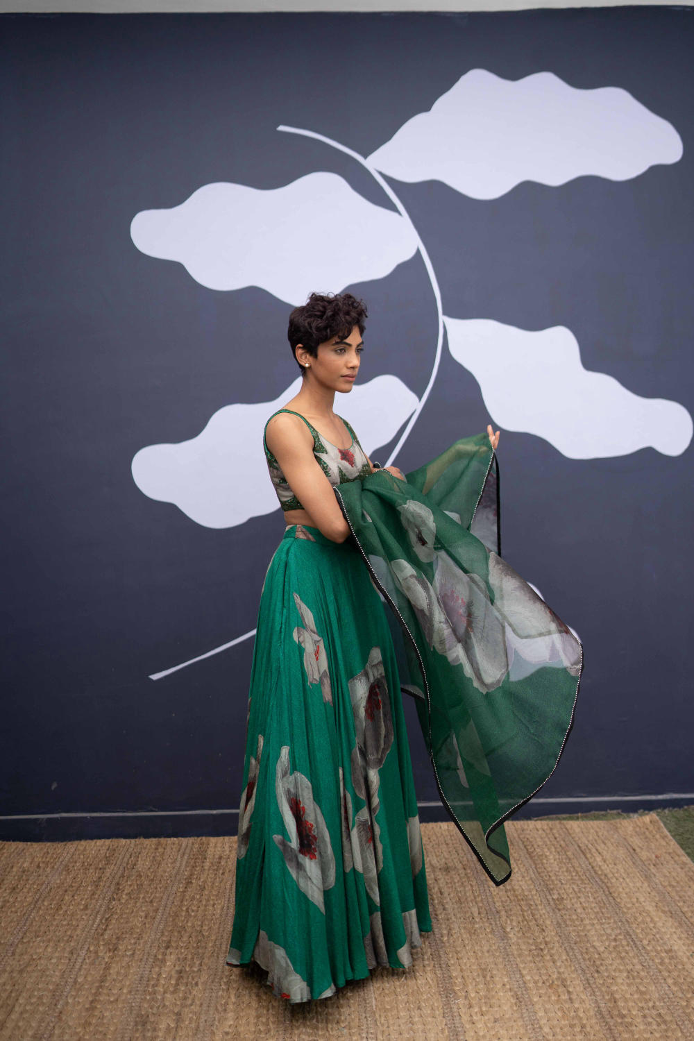 "The Lehenga is crafted in a unique green color with massive white poppies carefully printed on luxe pure silk organza.