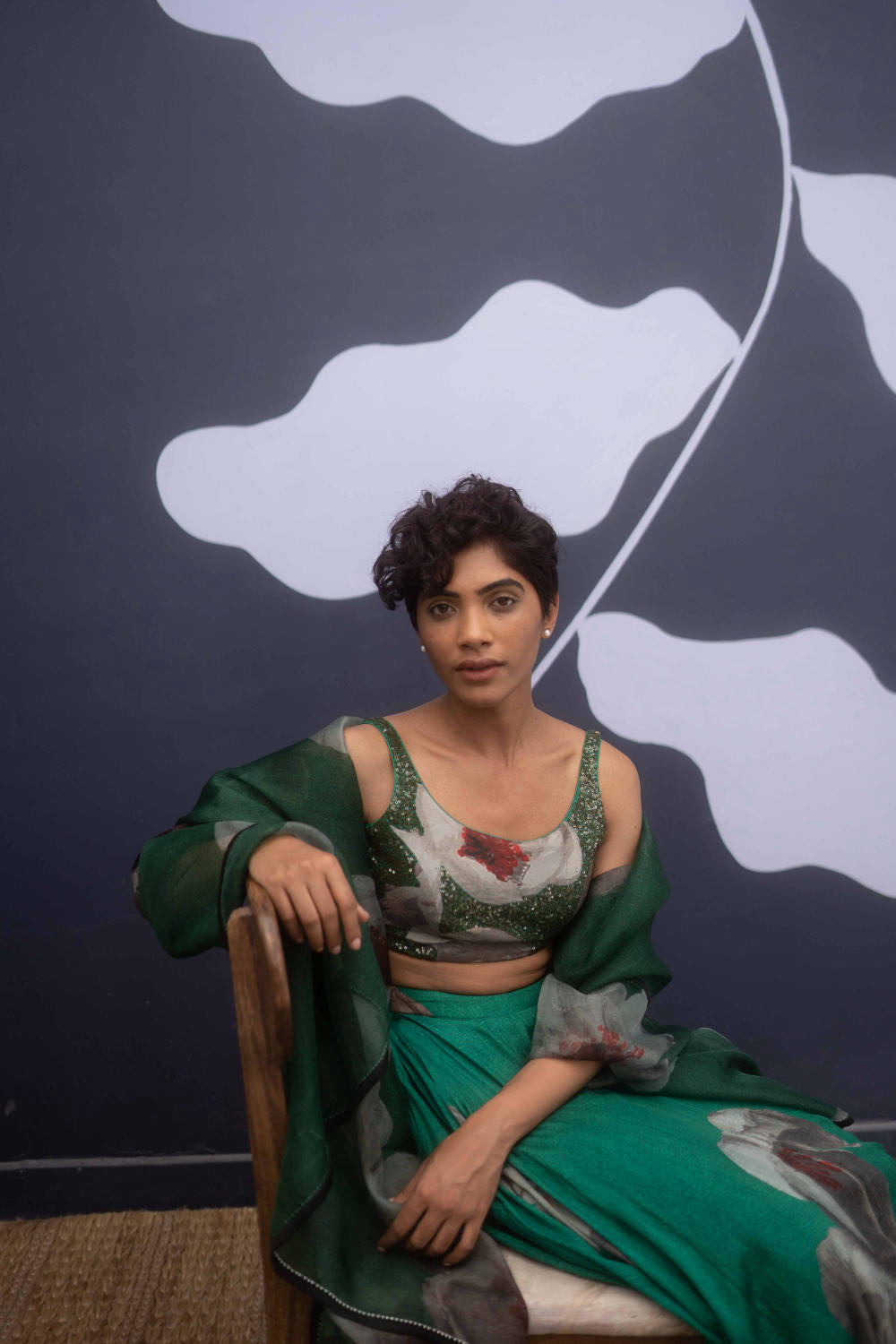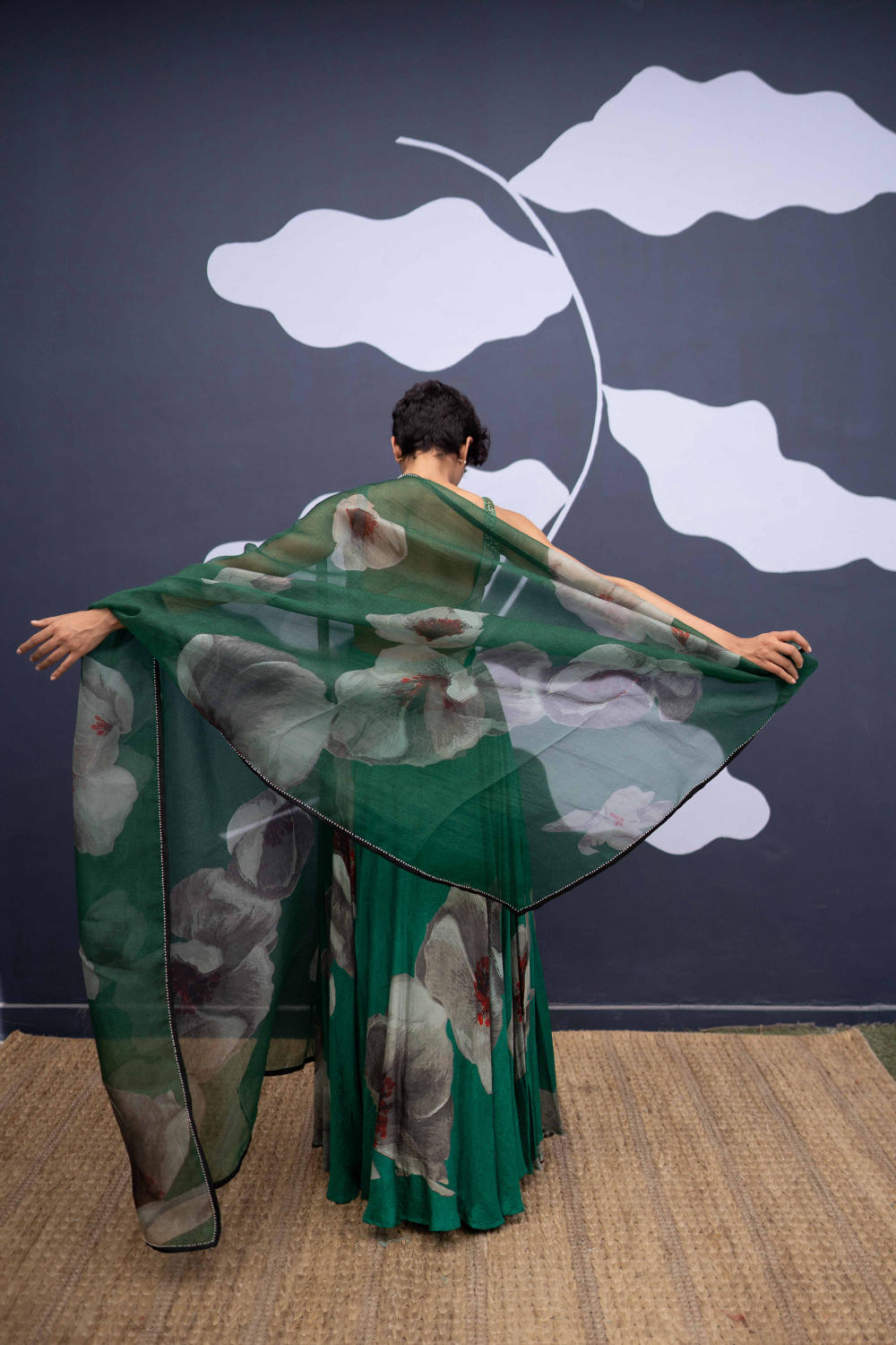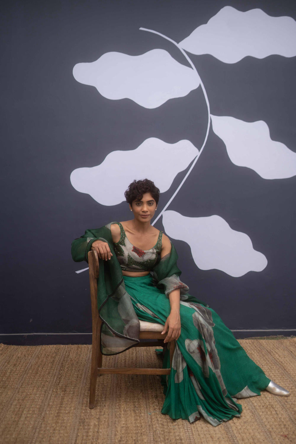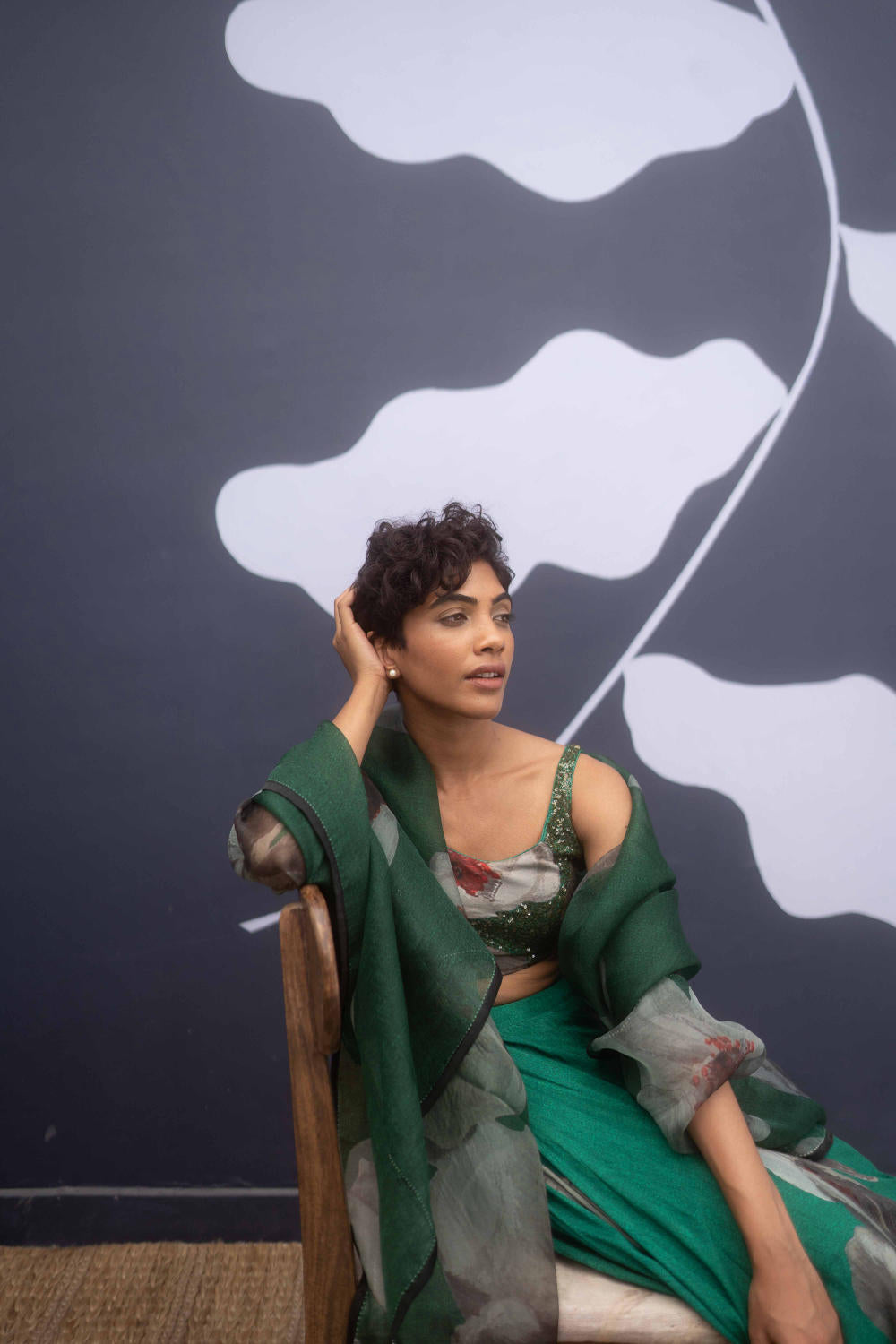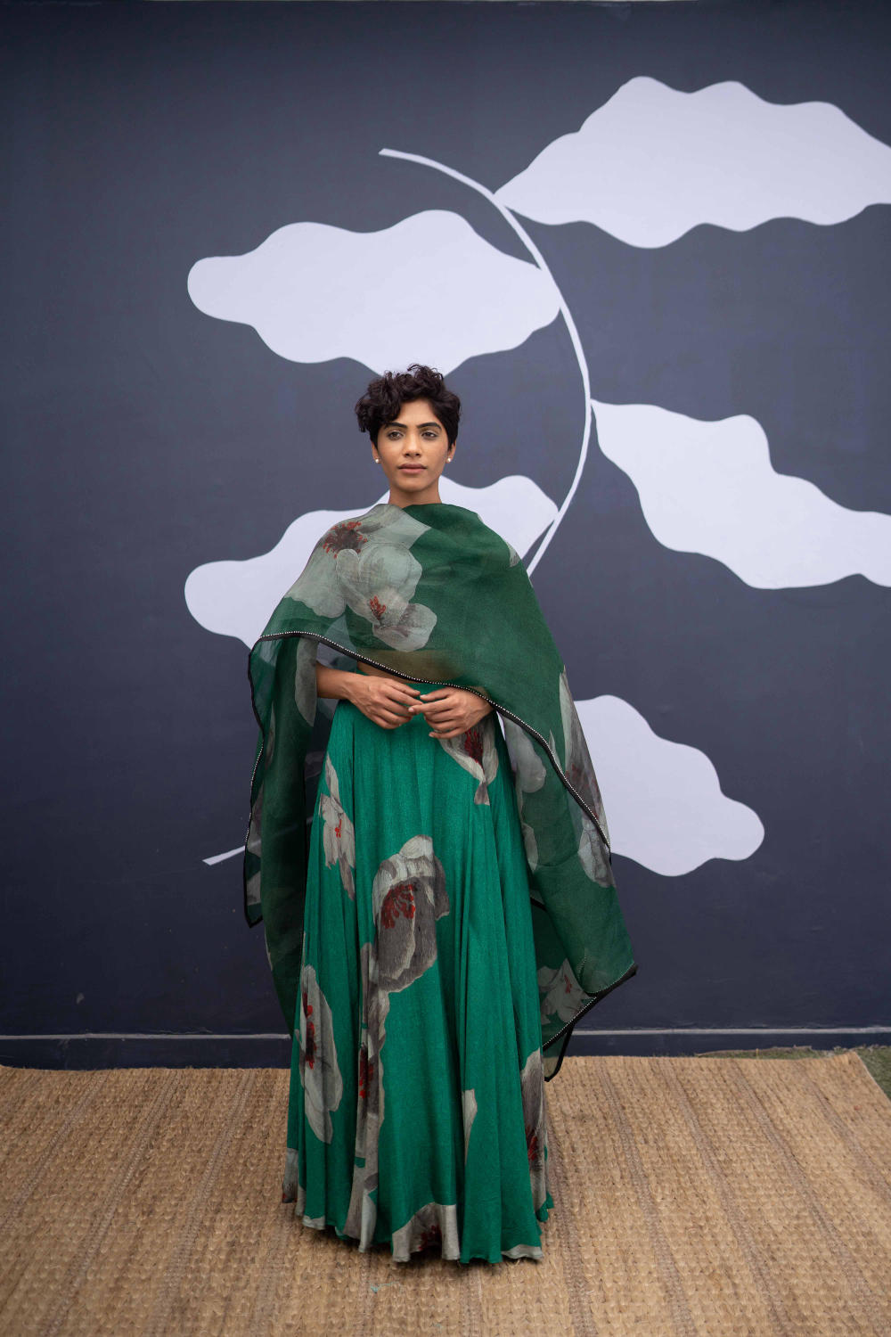"The Lehenga is crafted in a unique green color with massive white poppies carefully printed on luxe pure silk organza.