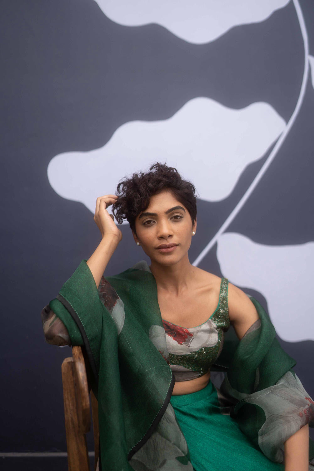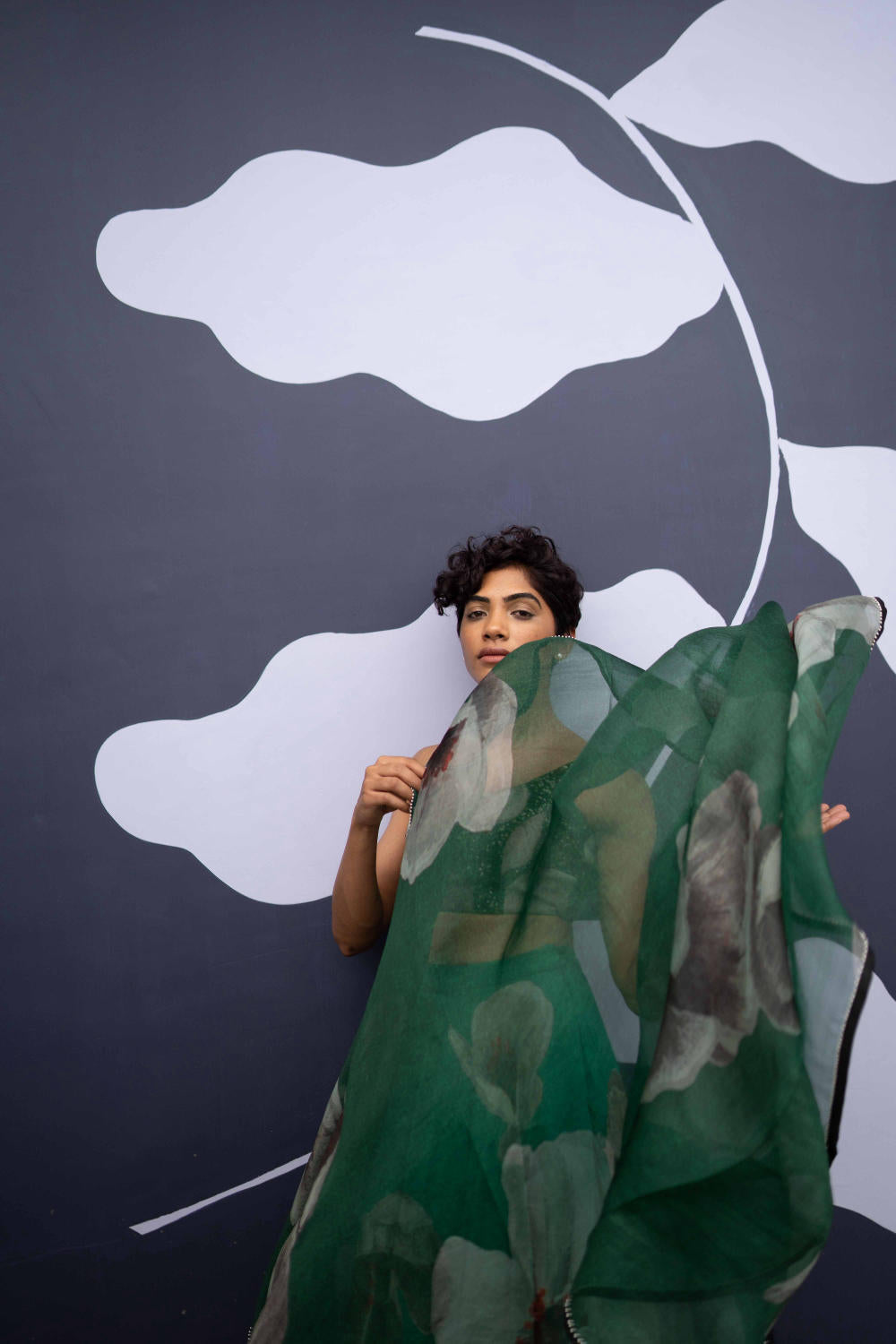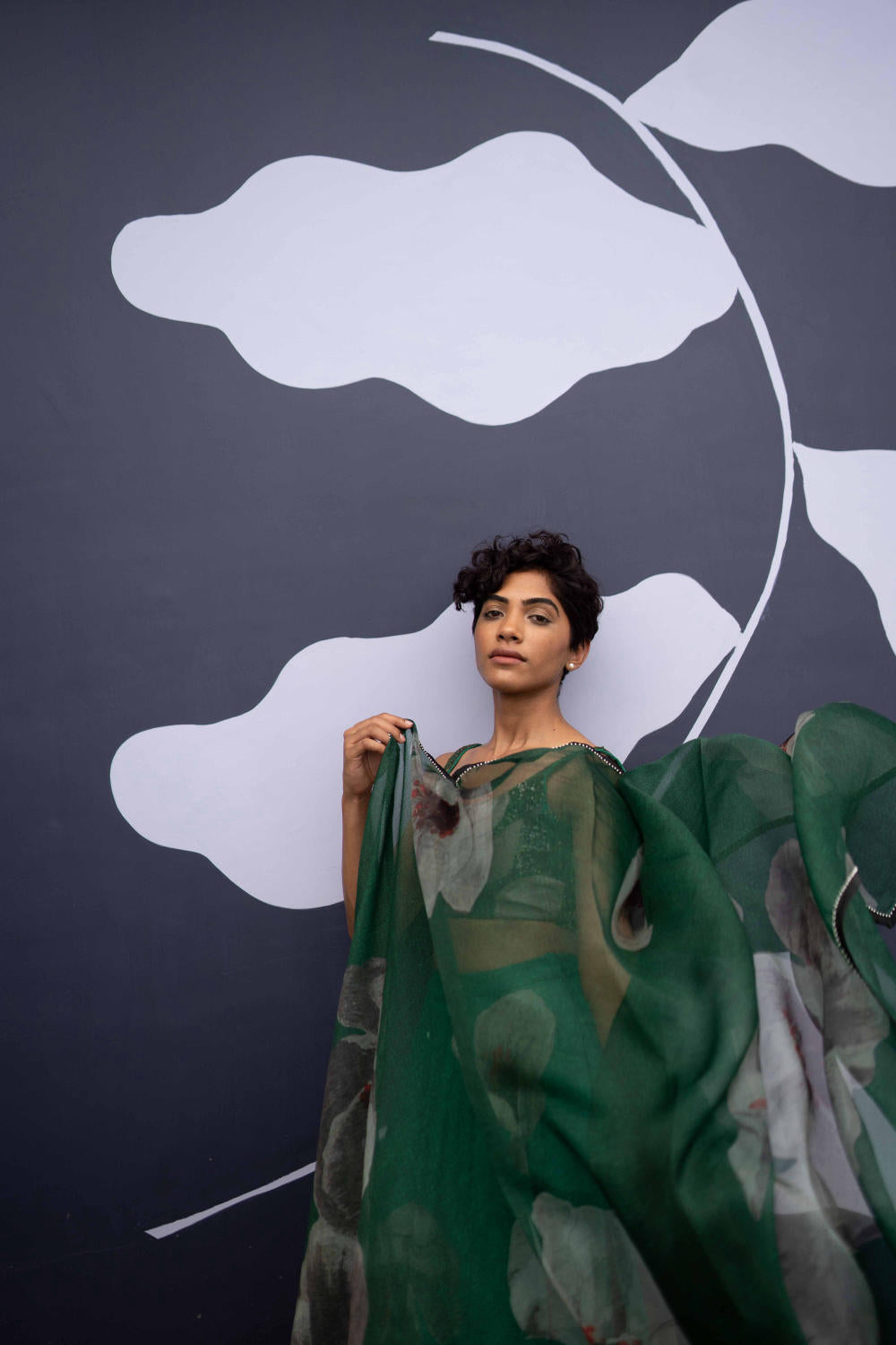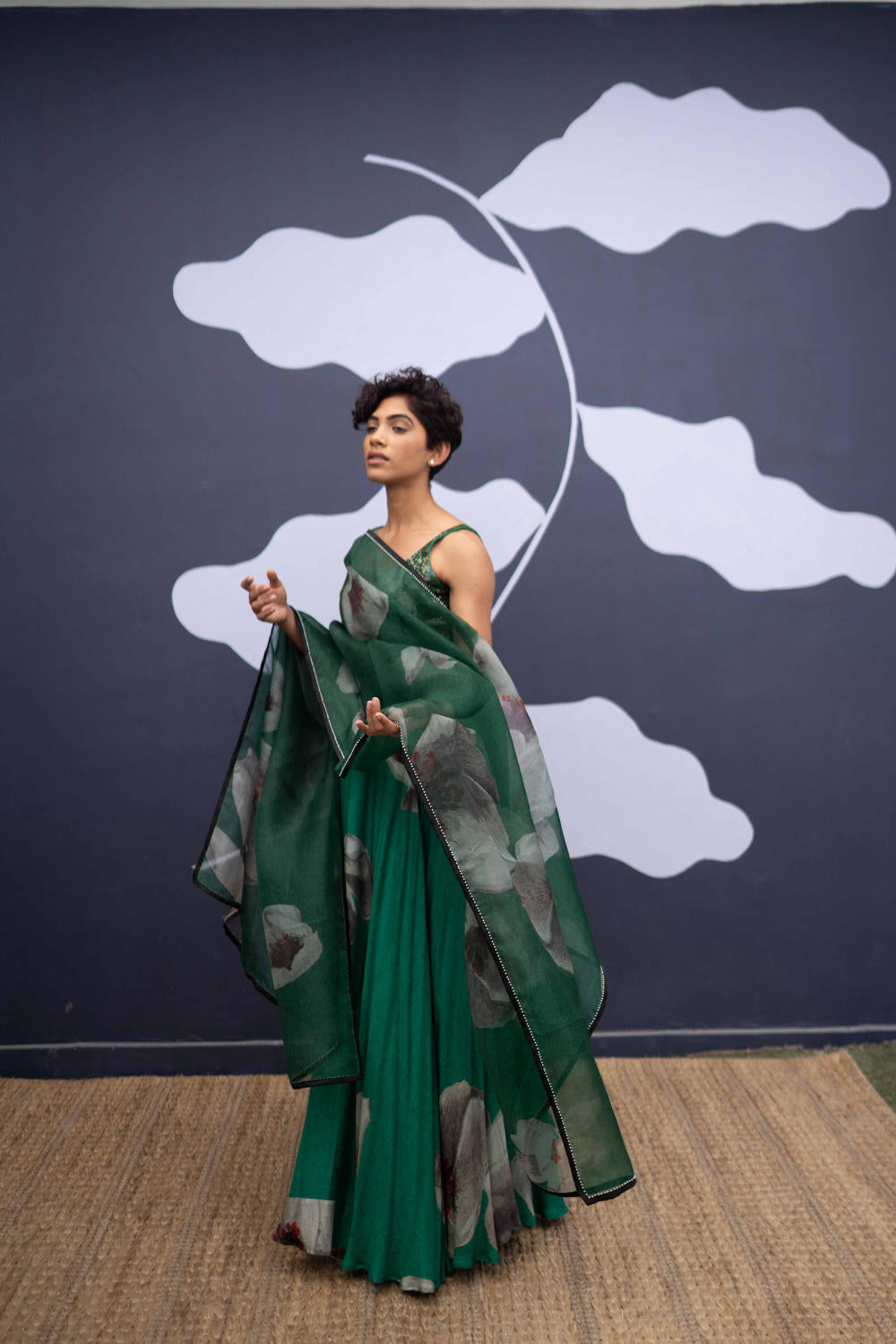 "The Lehenga is crafted in a unique green color with massive white poppies carefully printed on luxe pure silk organza.