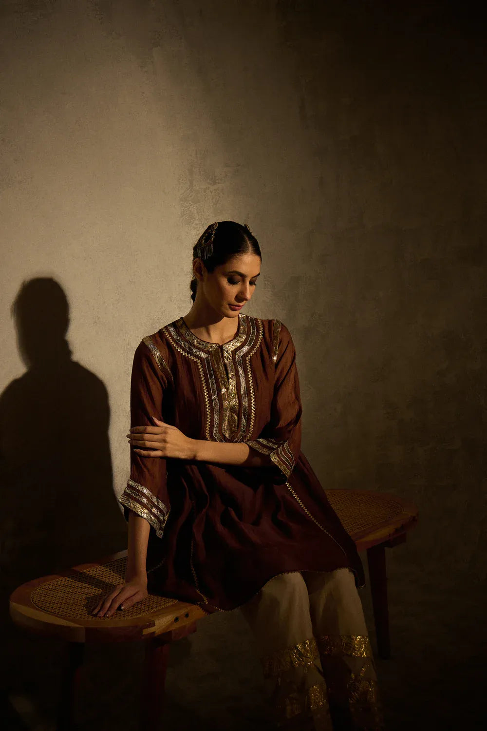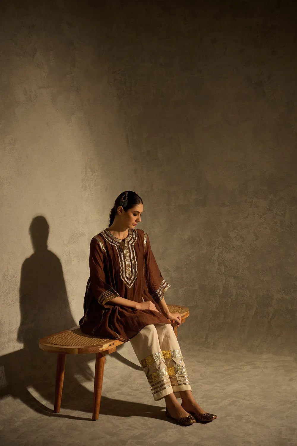 A beautiful brown kalidaar kurta crafted with delicate sucha gota work, blending classic cuts with modern refinement. The kurta features clean lines and thoughtful detailing, paired with our timeless gota salwar highlighted with artistic gota patterns.