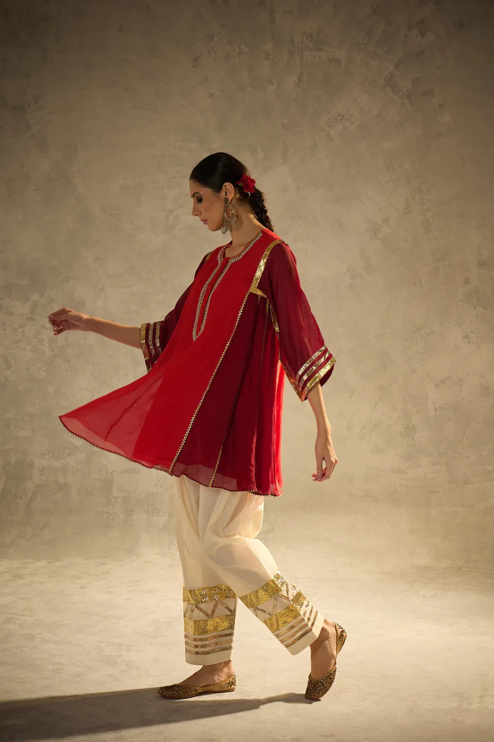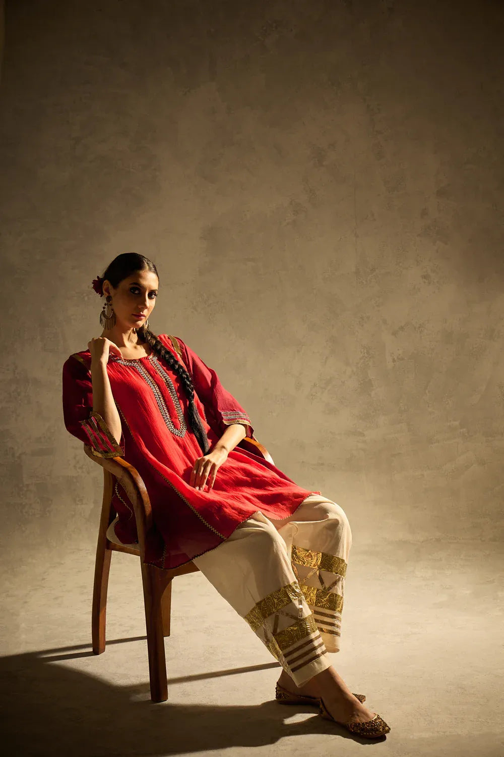 A vibrant red kalidaar kurta crafted with delicate sucha gota work, blending classic cuts with modern refinement. The kurta features clean lines and thoughtful detailing, paired with our timeless gota salwar highlighted with artistic gota patterns.