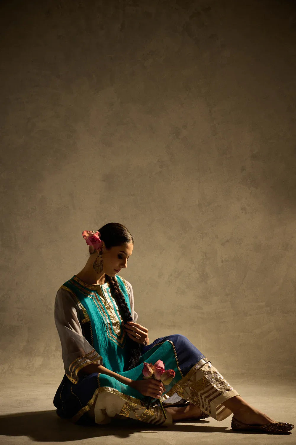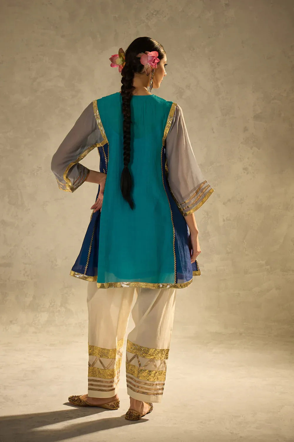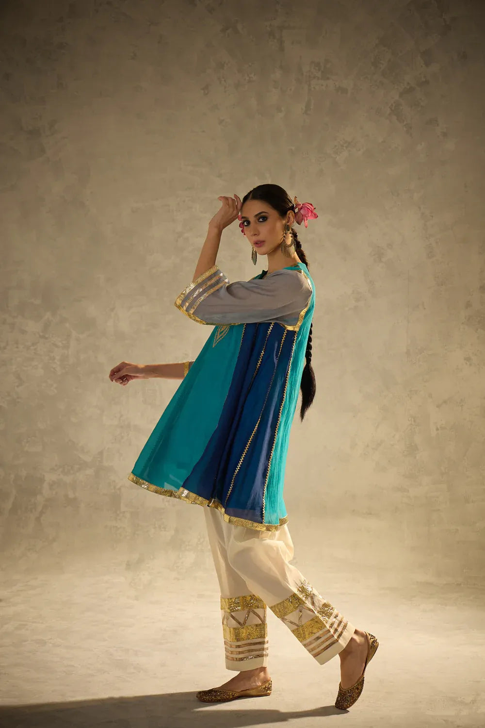 A vibrant blue kalidaar kurta crafted with delicate sucha gota work, blending classic cuts with modern refinement. The kurta features clean lines and thoughtful detailing, paired with our timeless gota salwar highlighted with artistic gota patterns.