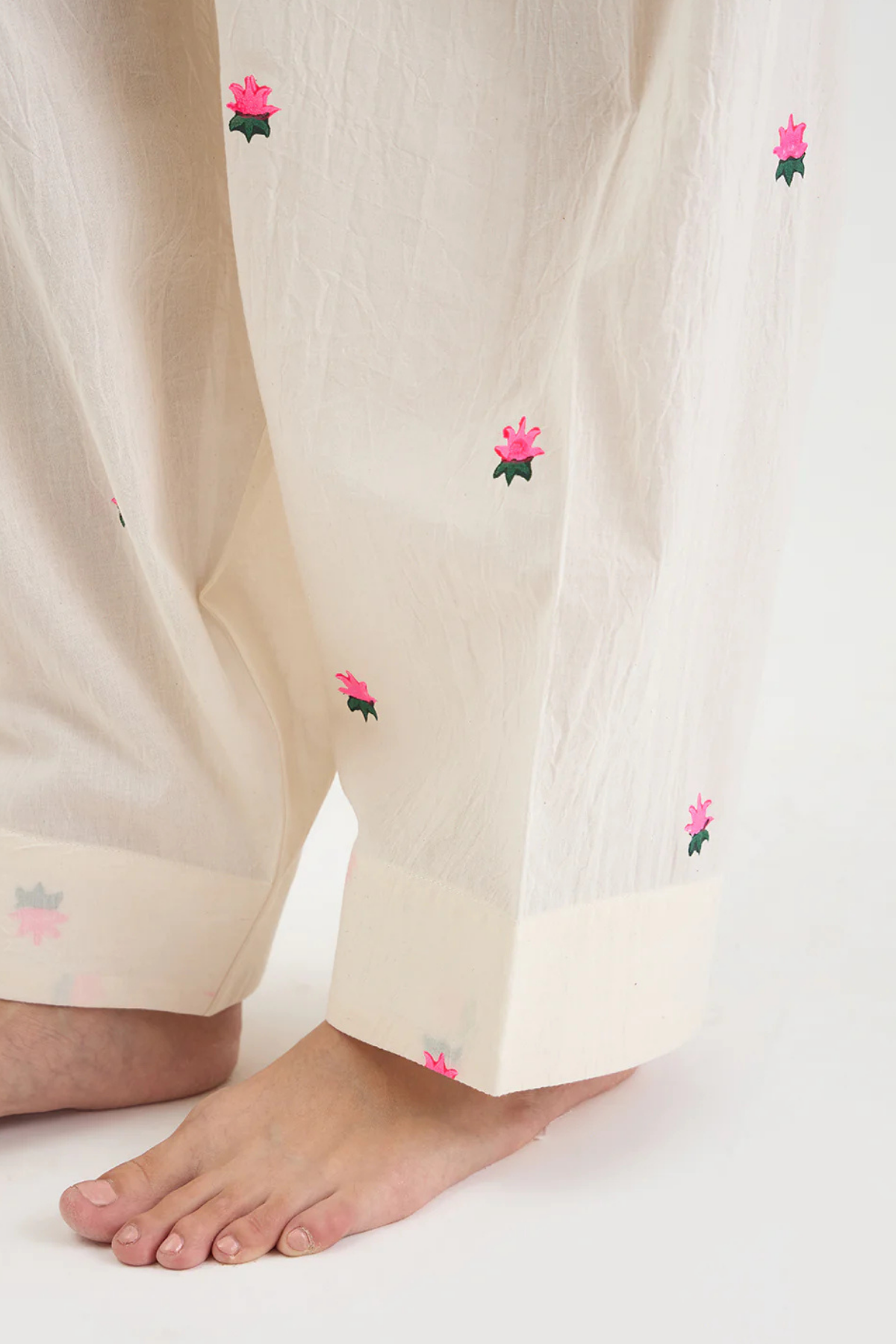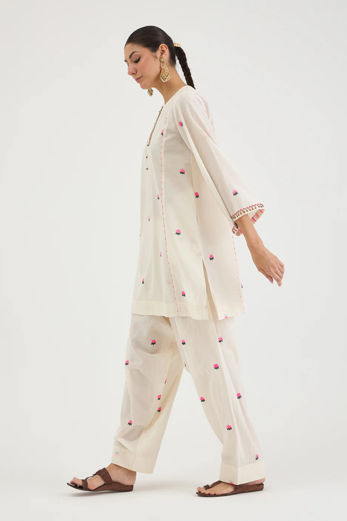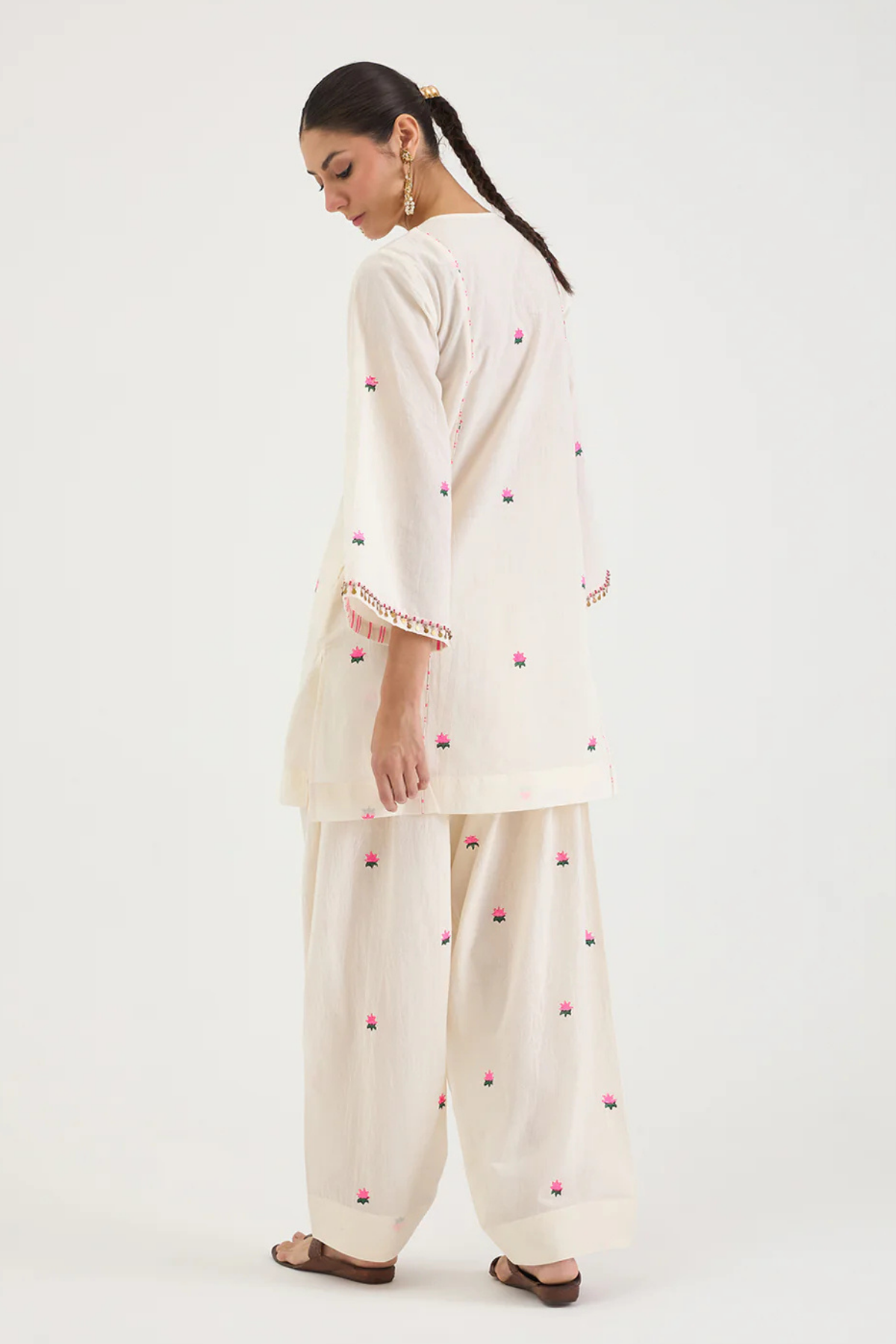 Kalidaar short kurta emblished with gota on the kali, intricate hand embroidery paired up with printed farsi pant.