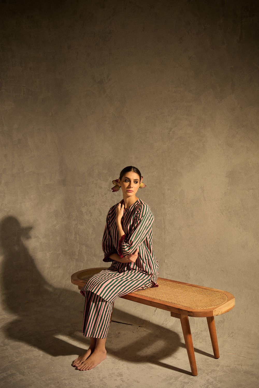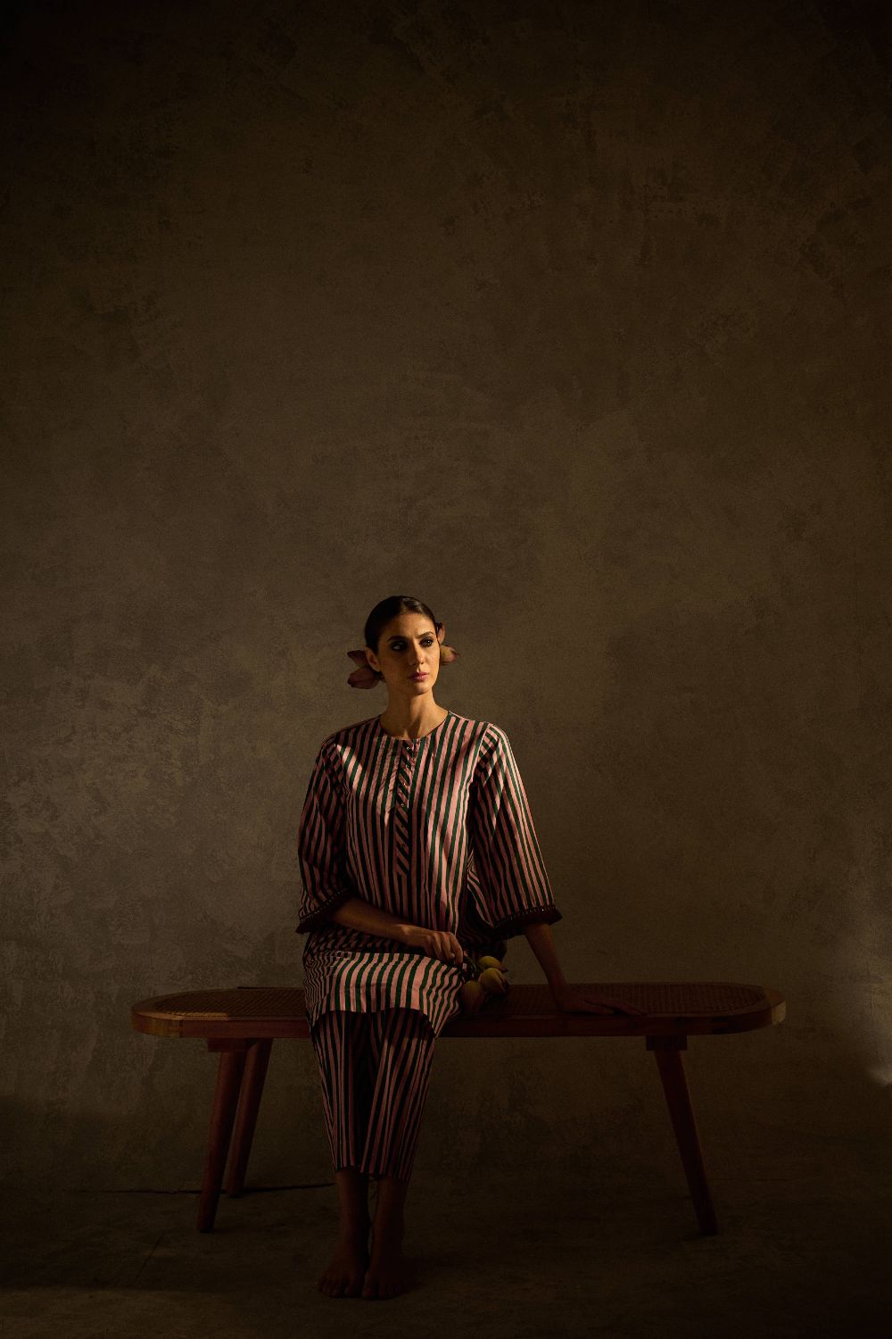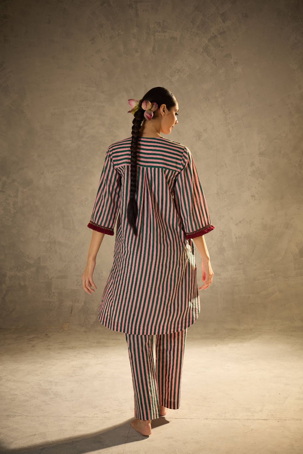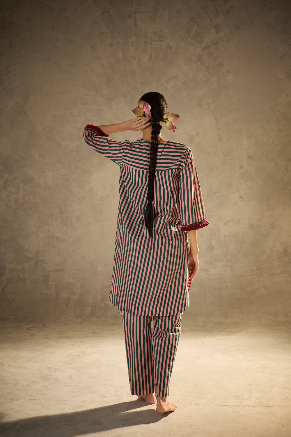 The kurta features block-printed stripes and handmade thread tassels on the sleeves, adding subtle handcrafted detailing. Paired with matching striped bottoms