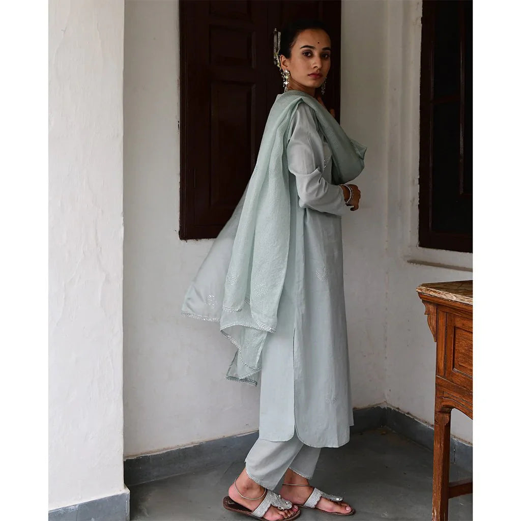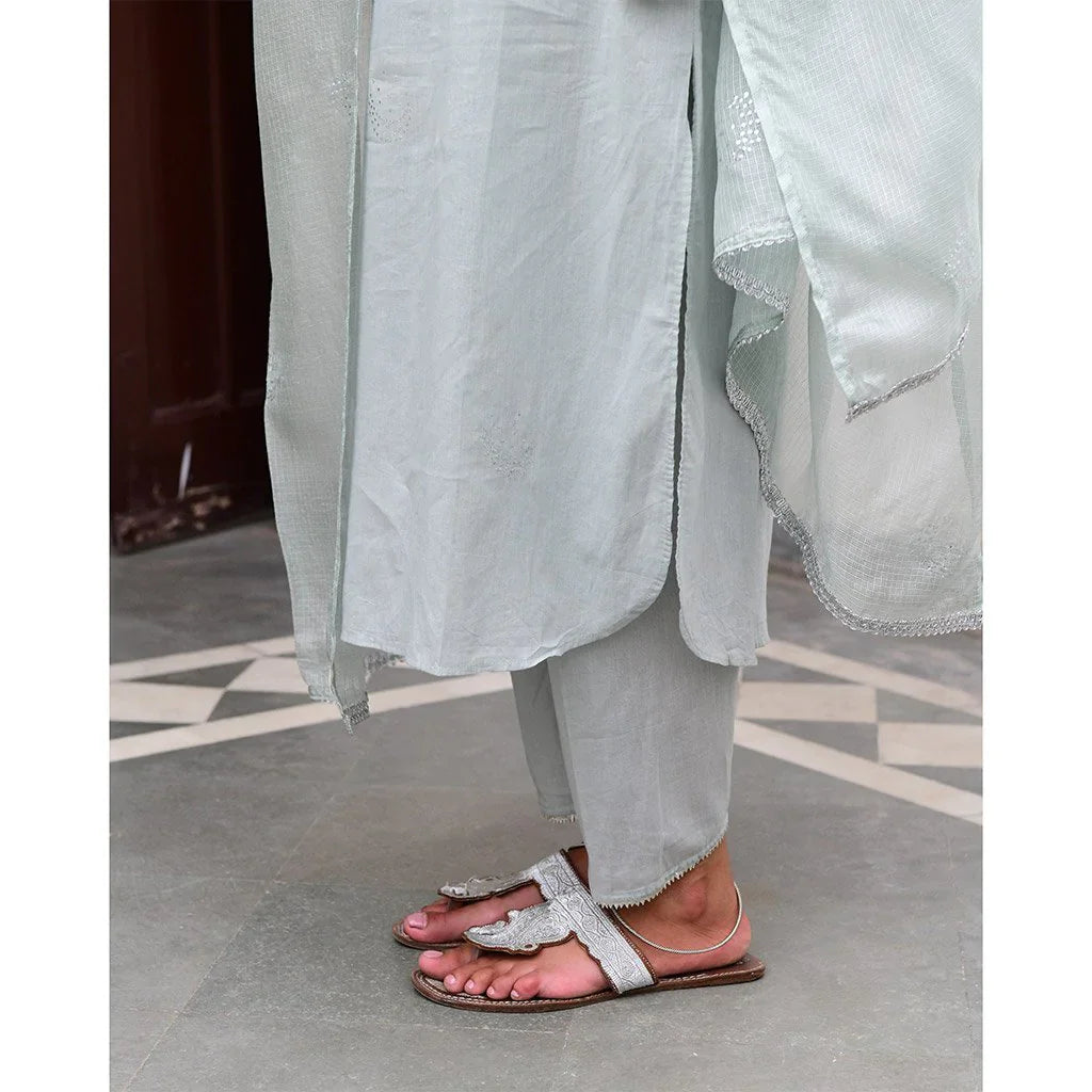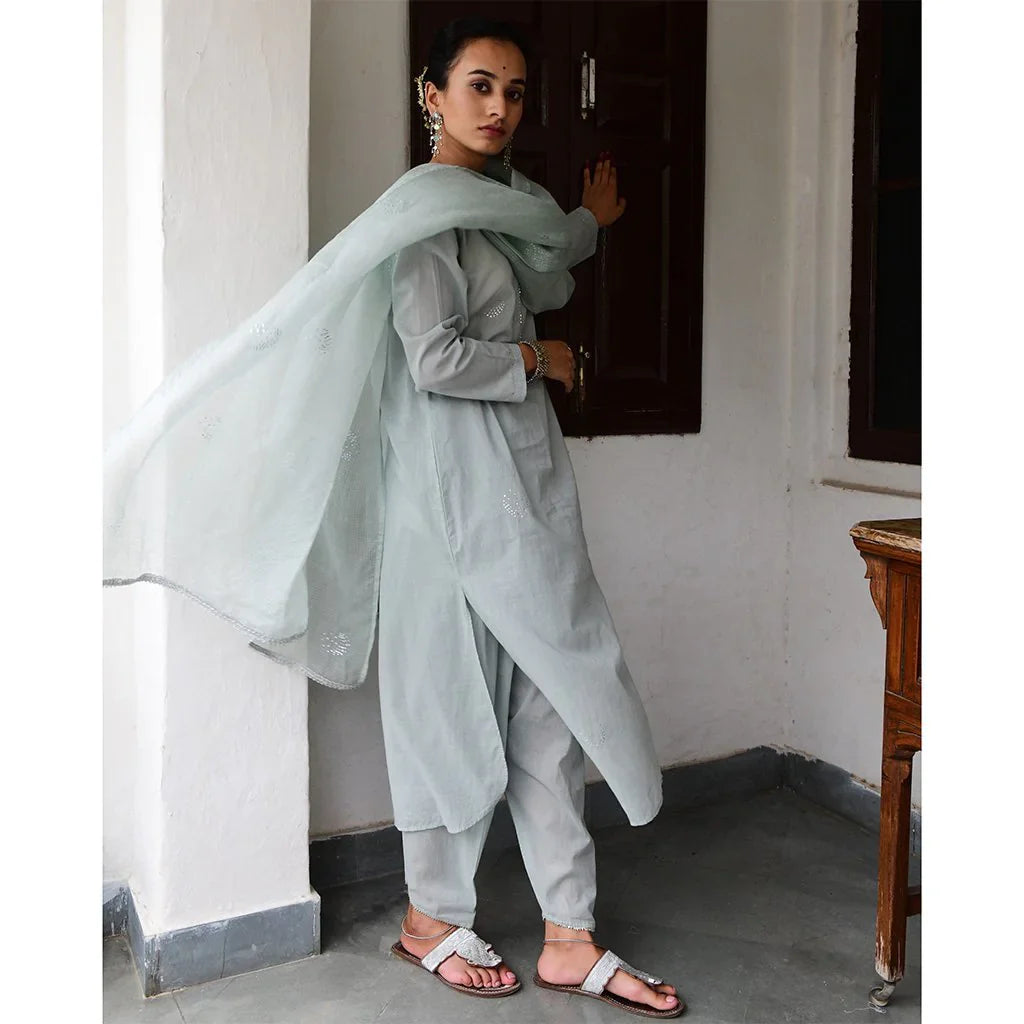 Cotton mulmul straight kurta with a mukaish work yolk and hand block printed pipings. Straight pants with elastic and drawstring tie are embroidered by hand with silver gota in a tradtional Mughal pattern, and kota silk dupatta embroidered with sequins and thread tassels, with delicate silver ties.
