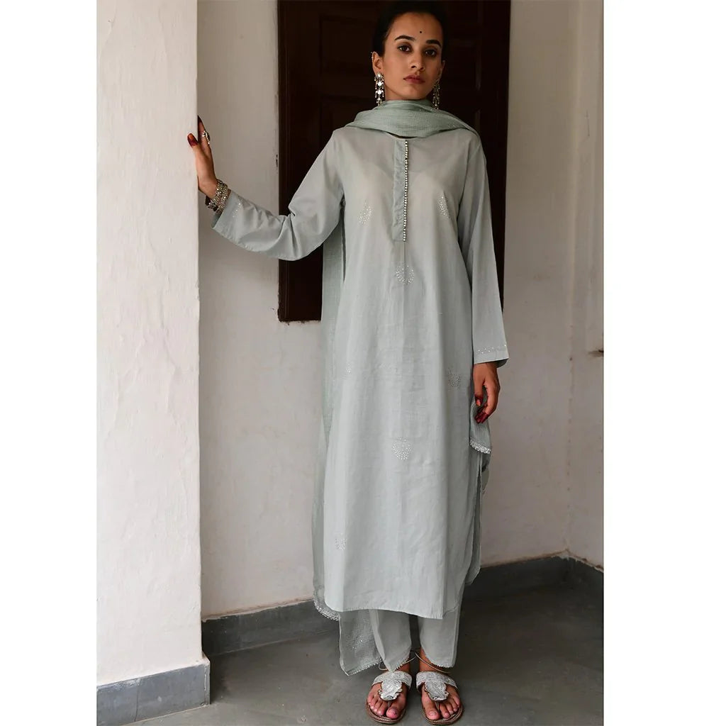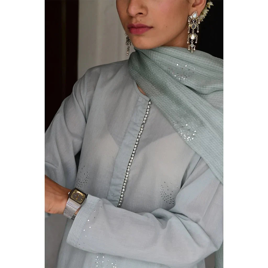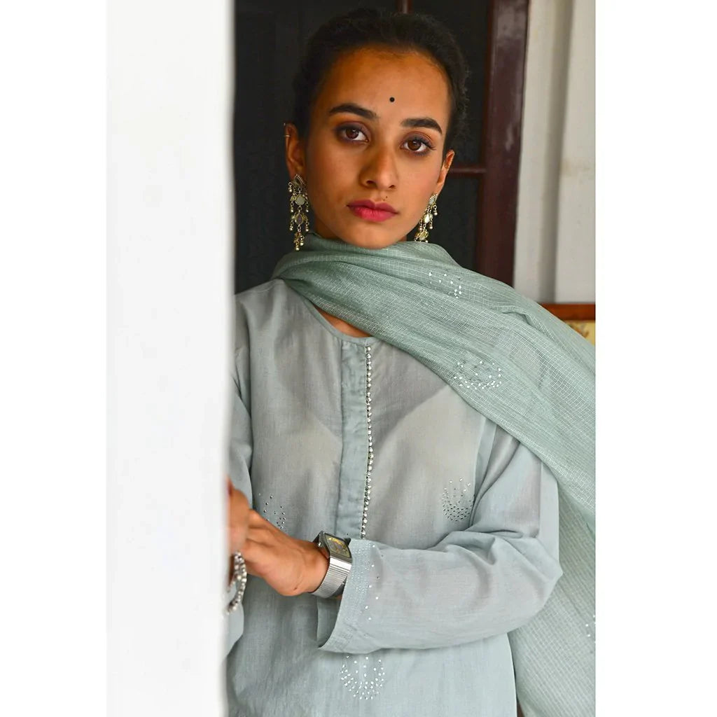 Cotton mulmul straight kurta with a mukaish work yolk and hand block printed pipings. Straight pants with elastic and drawstring tie are embroidered by hand with silver gota in a tradtional Mughal pattern, and kota silk dupatta embroidered with sequins and thread tassels, with delicate silver ties.
