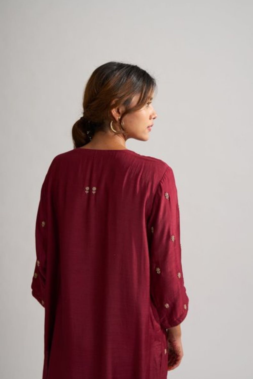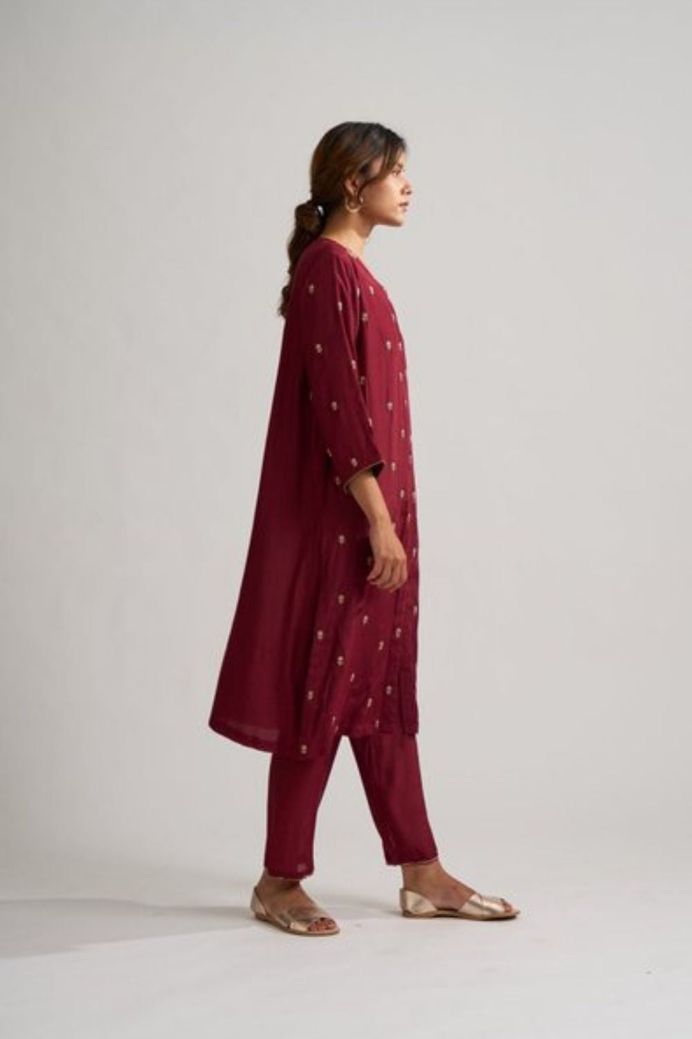 Rohita kurta set is a perfect blend of contemporary fashion and traditional roots. Its a two piece garment made in cotton silk. It's embellished with delicate hand embroidered buds of flowers. The motif is made with dabka and the intricacy of french knots made in zari.