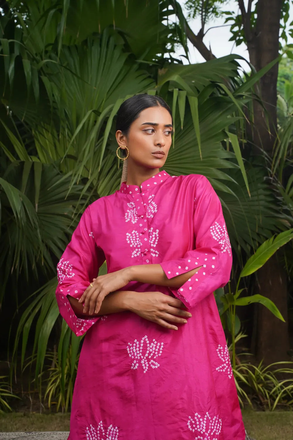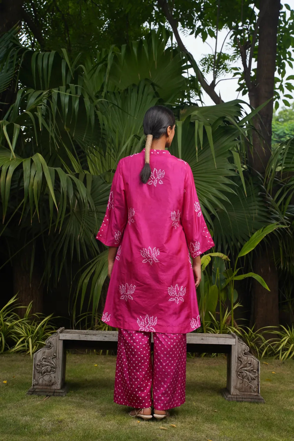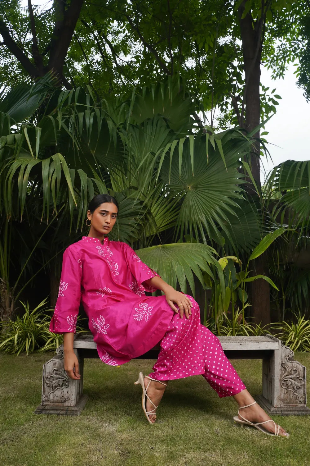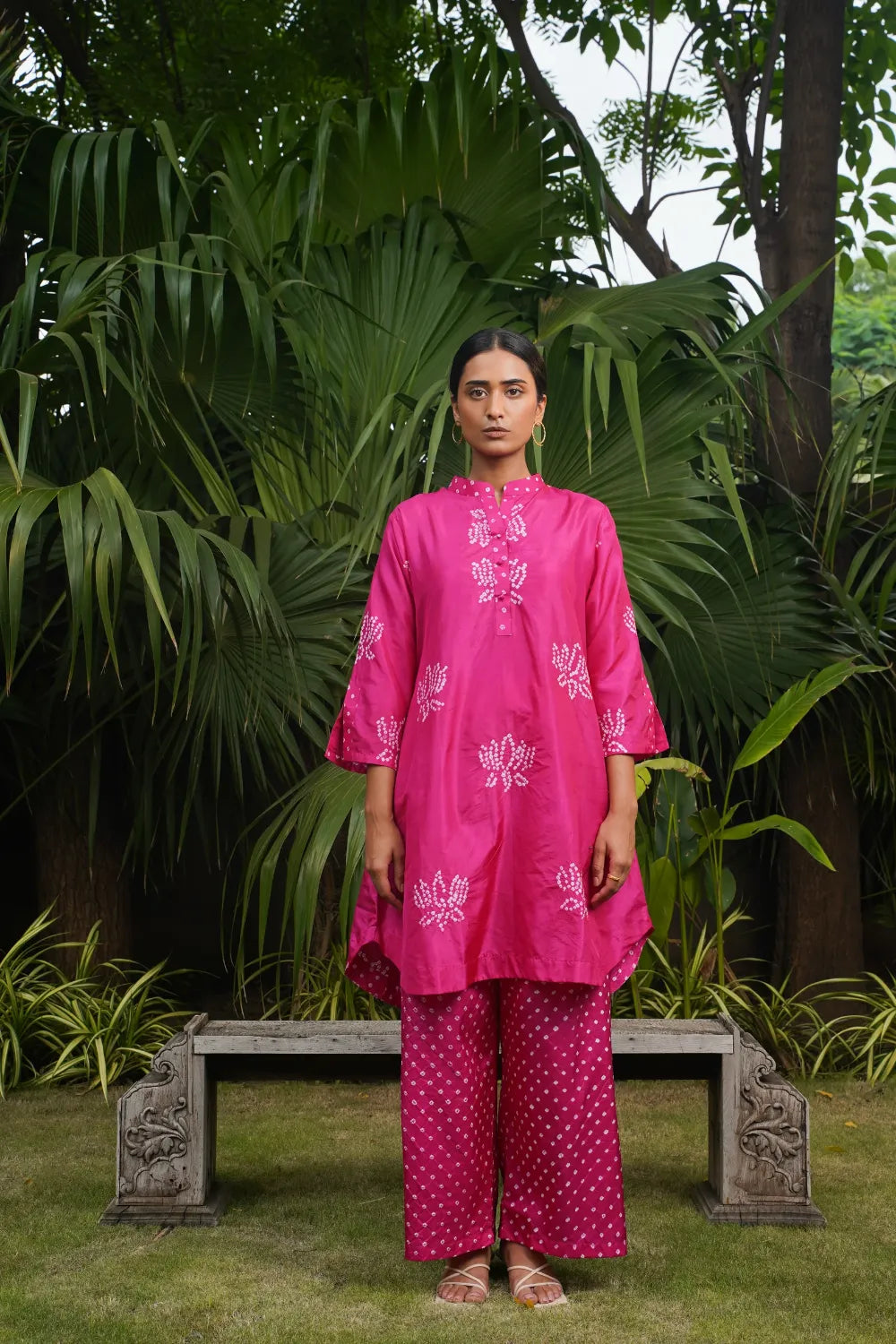 SHORT KURTA WITH CUSTOM LOTUS MOTIF IN BANDHANI PAIRED WITH PANTS