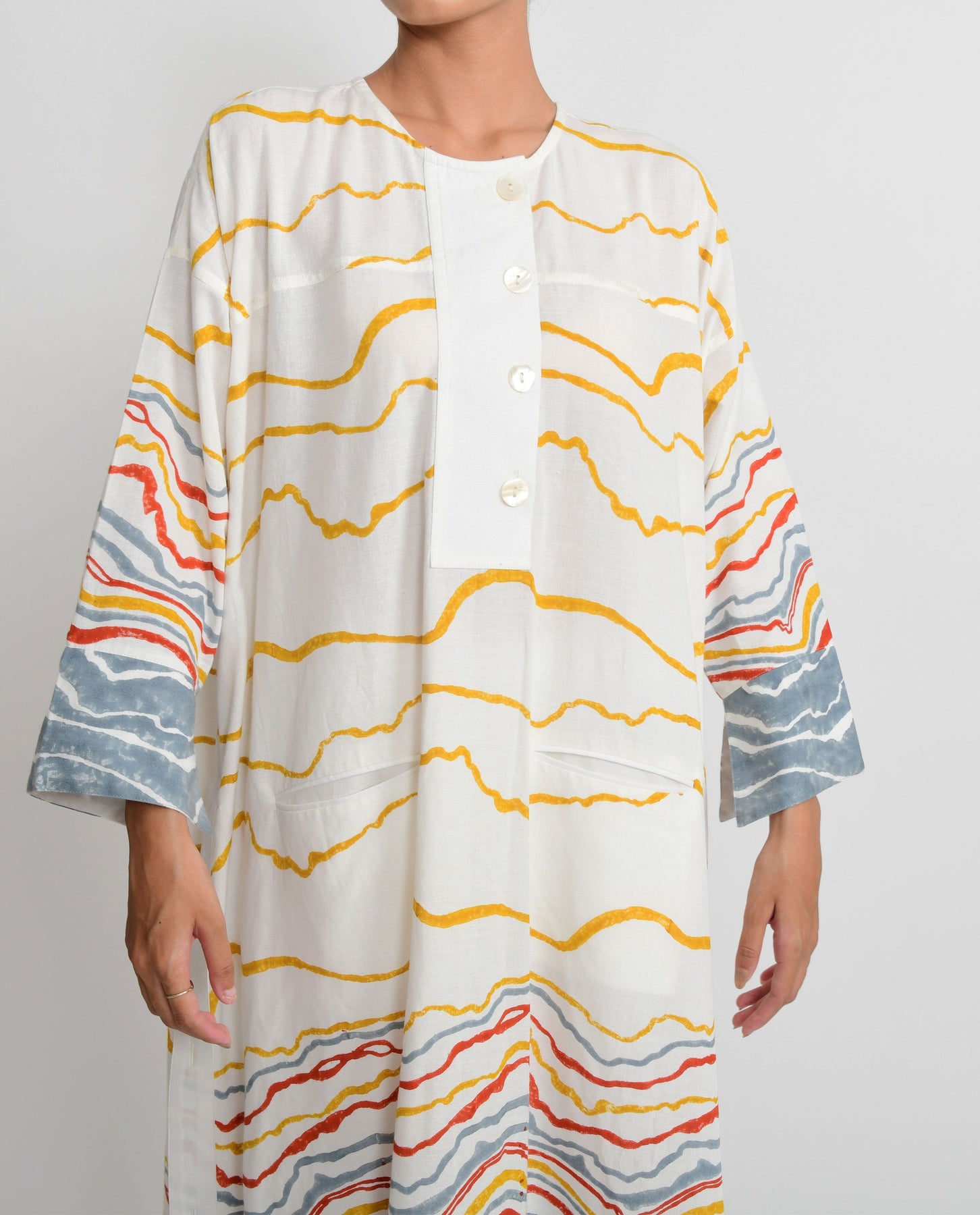 Hand spun indigenous cotton, blended with natural bamboo yarn & hand blocked to its beauty is perfect for summer and winter - an All season garment with a great fall.our favourite long side open dress with big shell buttons for closure on both sides with a white placket on its round neck . You can wear the pc with side open or closed . Team up with our white tape pants .Garment length " FRONT 44- BACK - 50