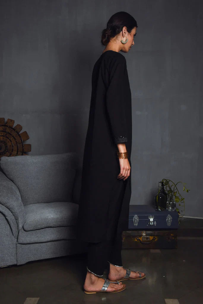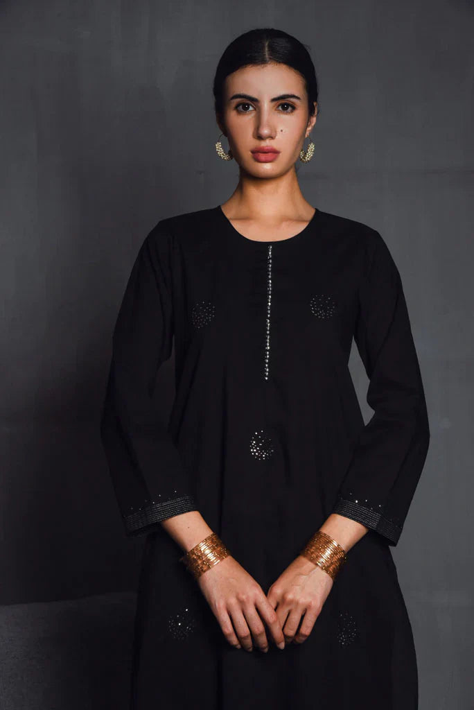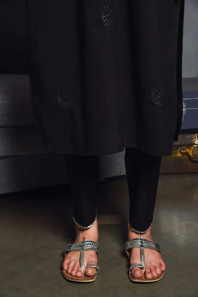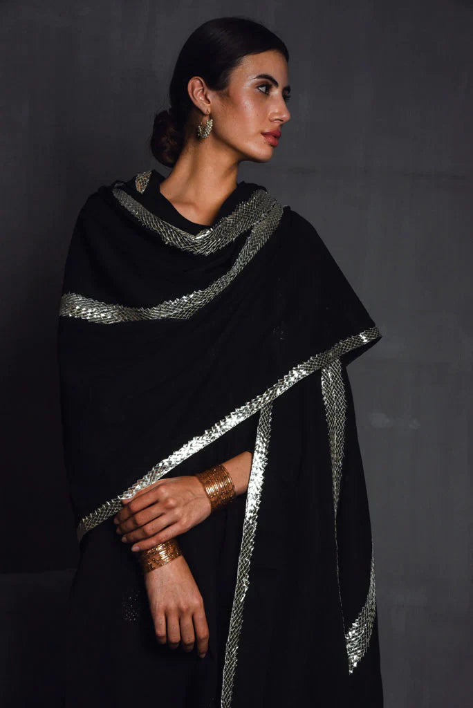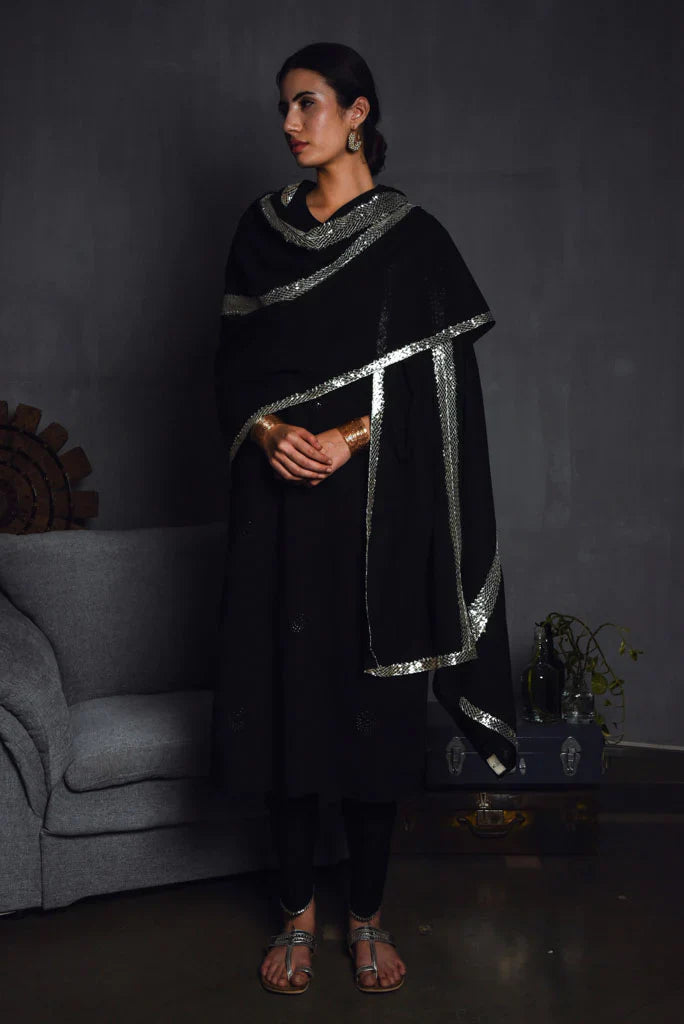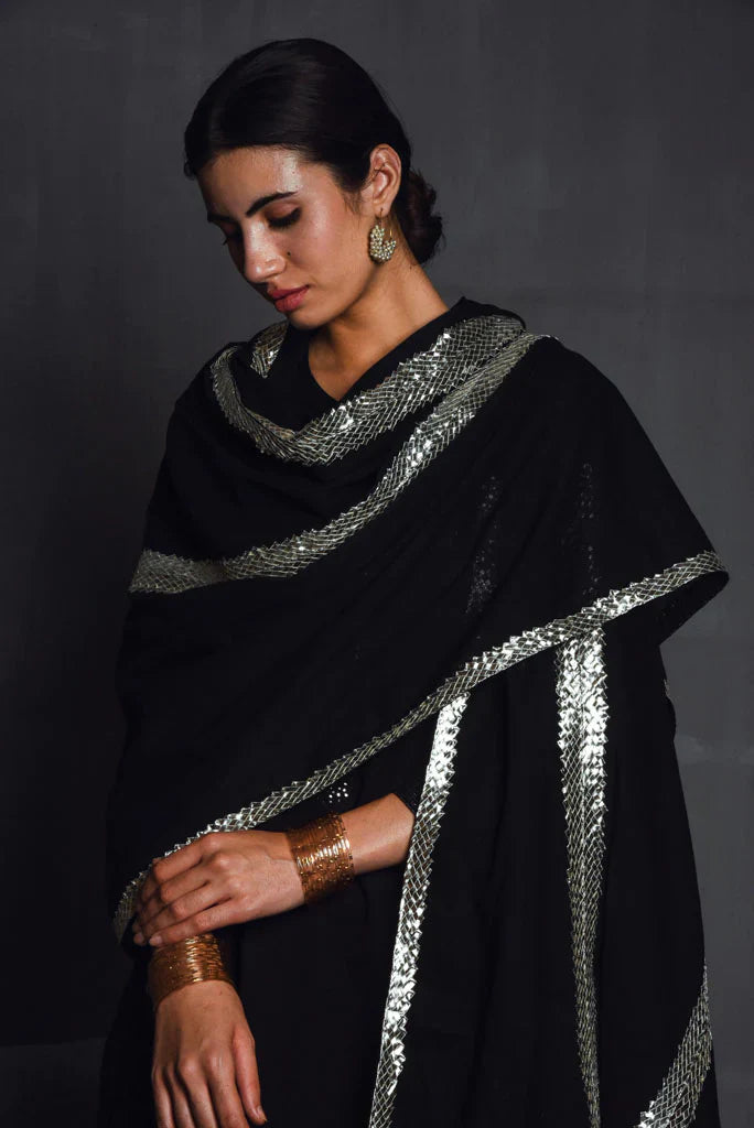 Cotton mul-mul, round edged long kurta, with hand hemmed silver ghungroos on the placcate and delicate silver "chaand" motif shadows emboirdered all over the front. Sleeve has mukaish work and monotone thread detailing. Dupatta is cotton mulmul with handmade silver chatai gota hand hemmed on it. Outfit is paired with an old fashioned narrow high salwar with bijiya edges.