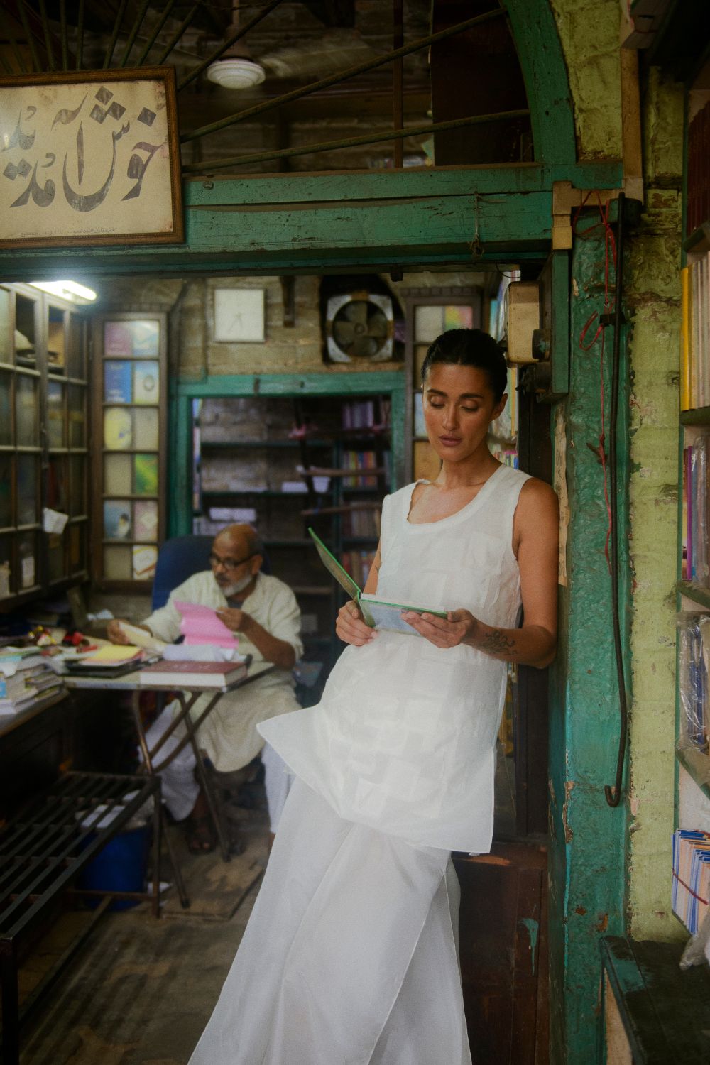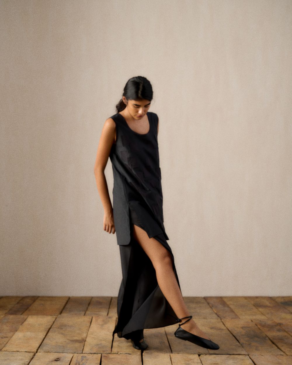 Sensual minimalism in motion, featuring silk appliqué work on a cotton-silk tunic, paired with airy, drawstring pure silk pants and delicate appliqué, lending it an understated elegance that moves effortlessly from day to night.