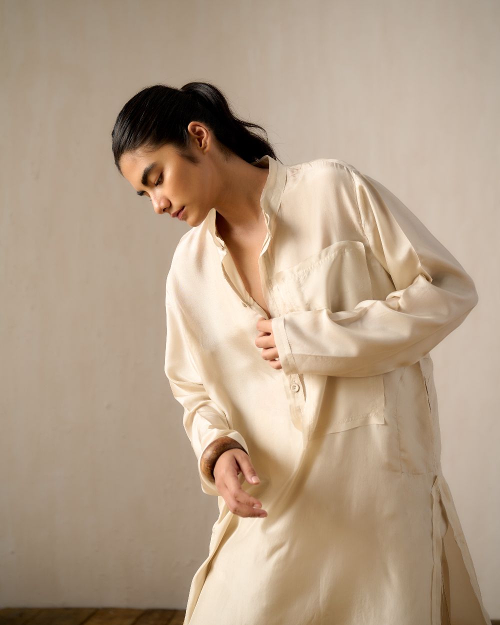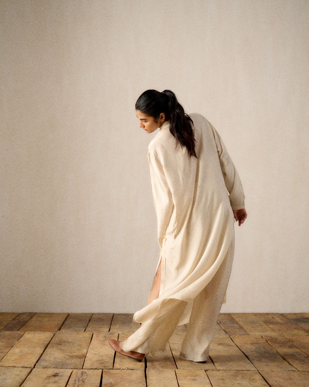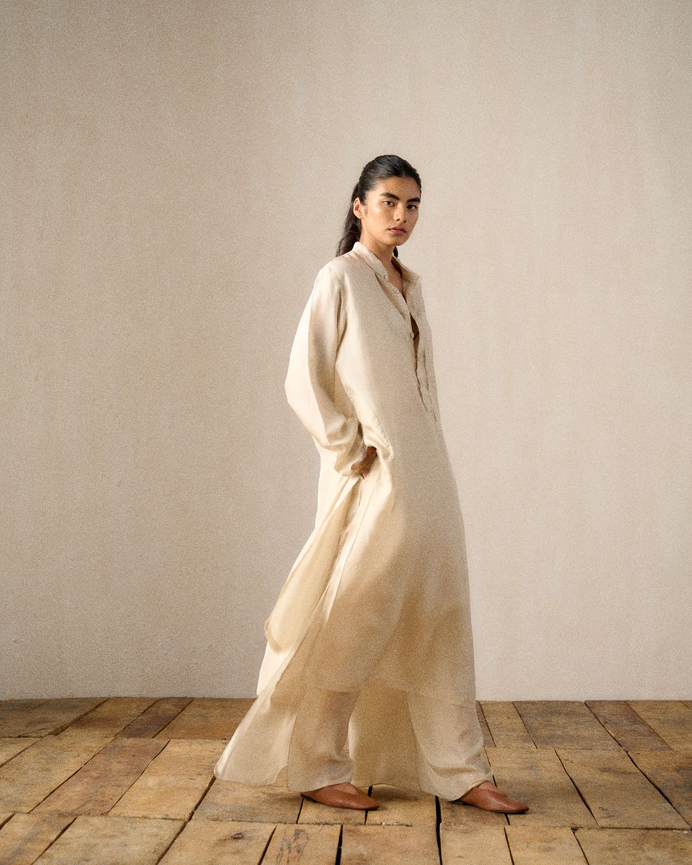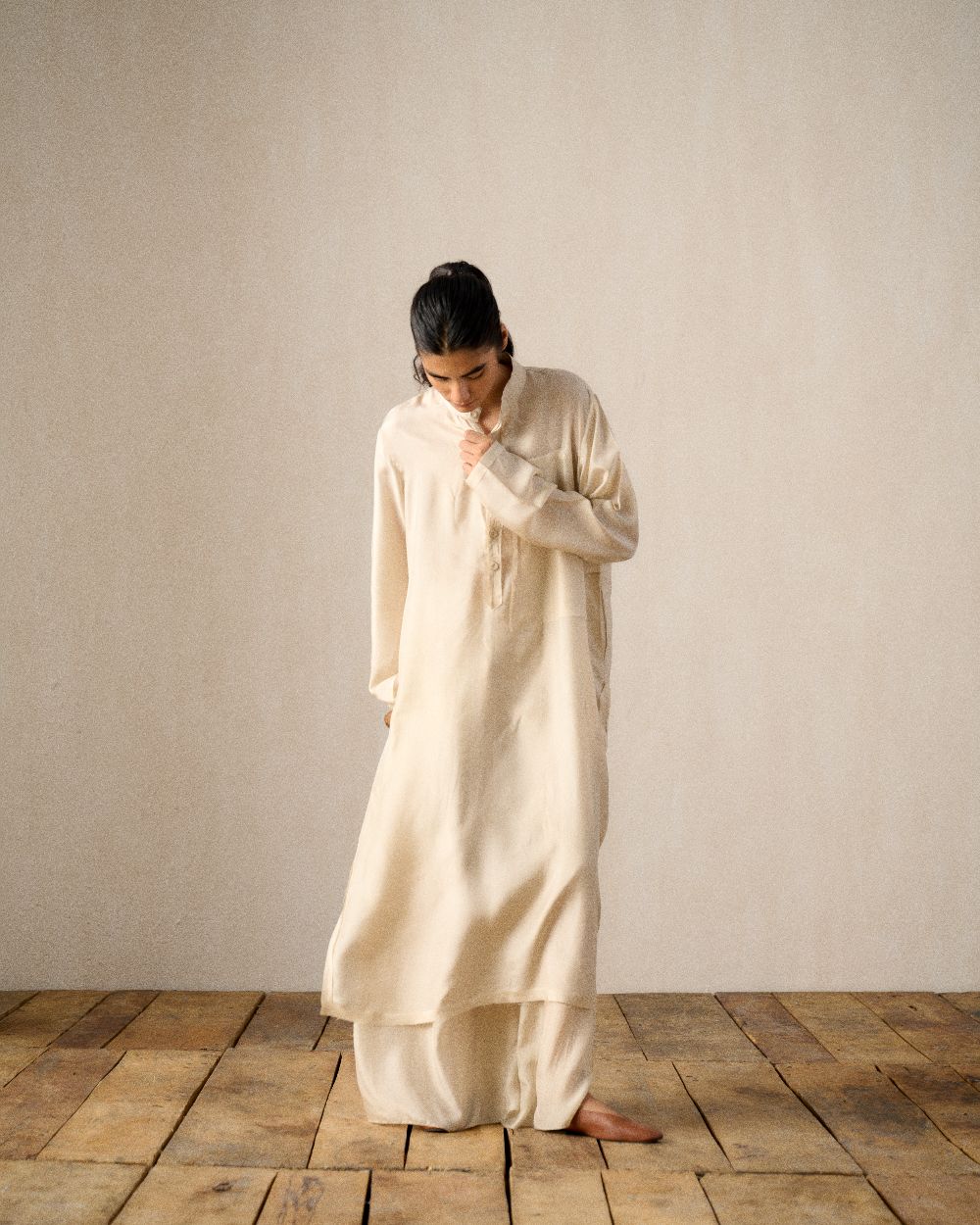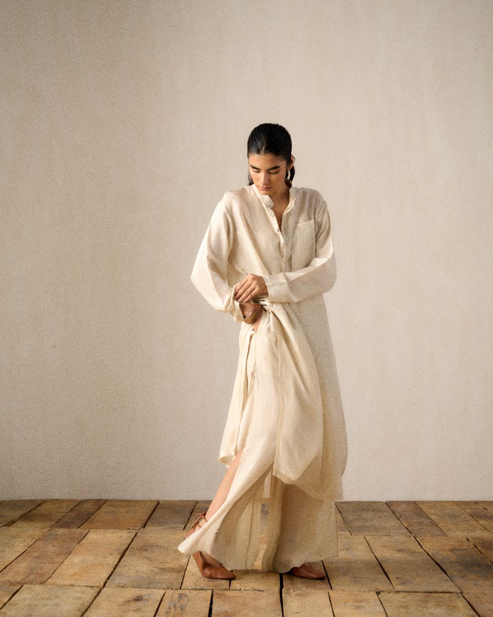 This kurta set is effortlessly sensual, draping fluidly over the body with grace. It balances artisanal detail with everyday ease, elegant enough to dress up, yet grounded enough for everyday luxury. A piece that flows seamlessly from day into night.