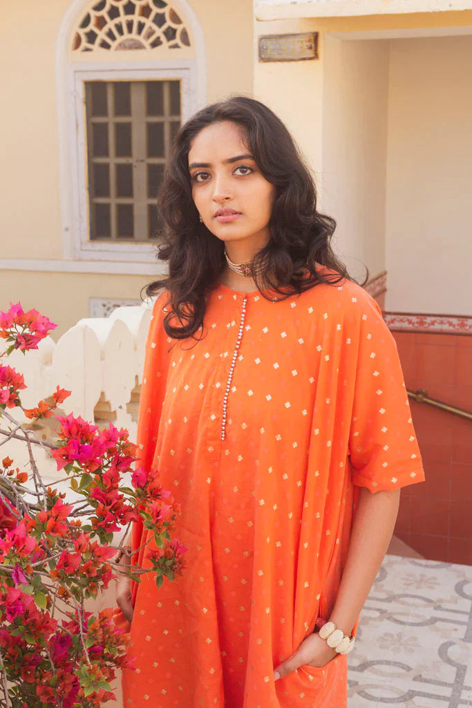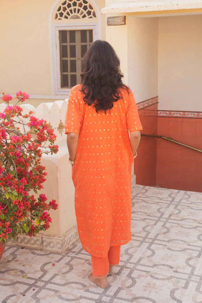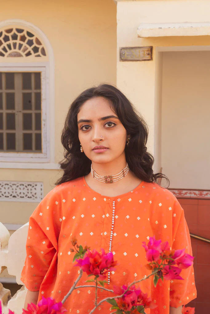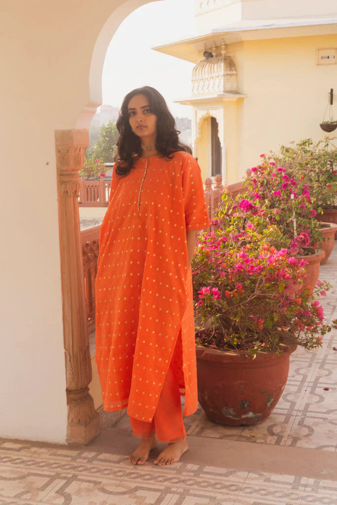 This set of 2 comes with jacquard cotton kaftan kurta with cotton Mul lining and it is offset with cotton silk pants in kasumal colour.Placatte is embellished with ghungroos. Pants are hand embroidered with golden scallops in gold. Pants are also lined with cotton mulmul.