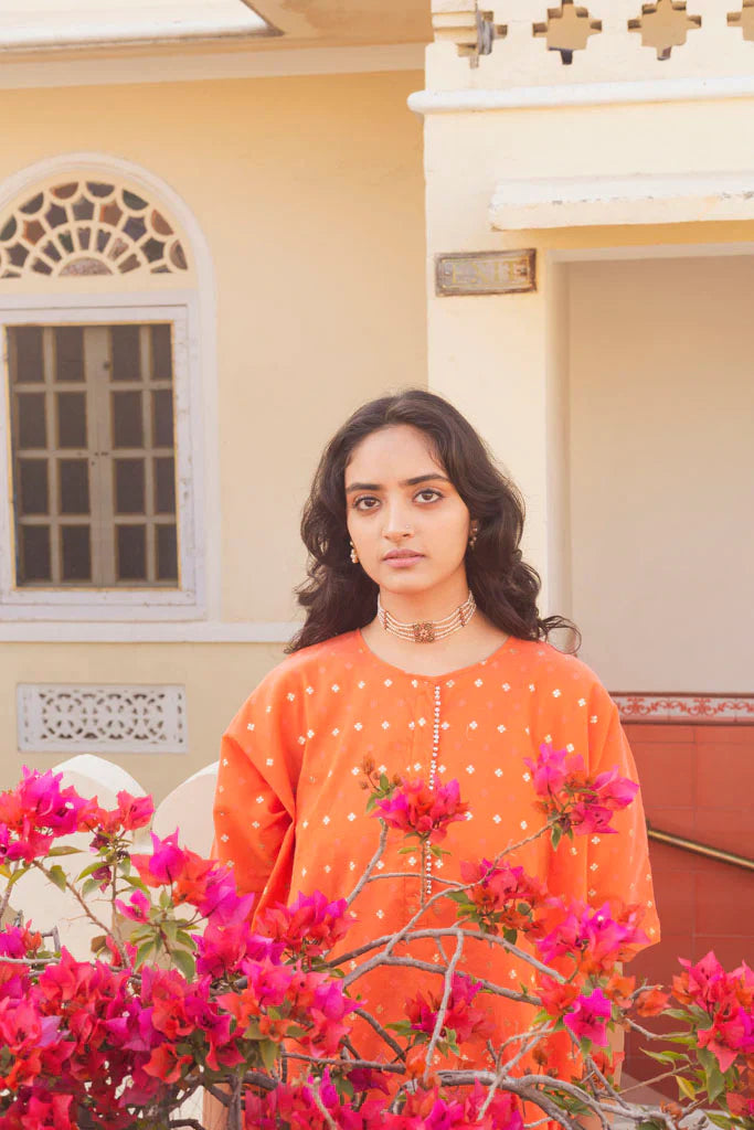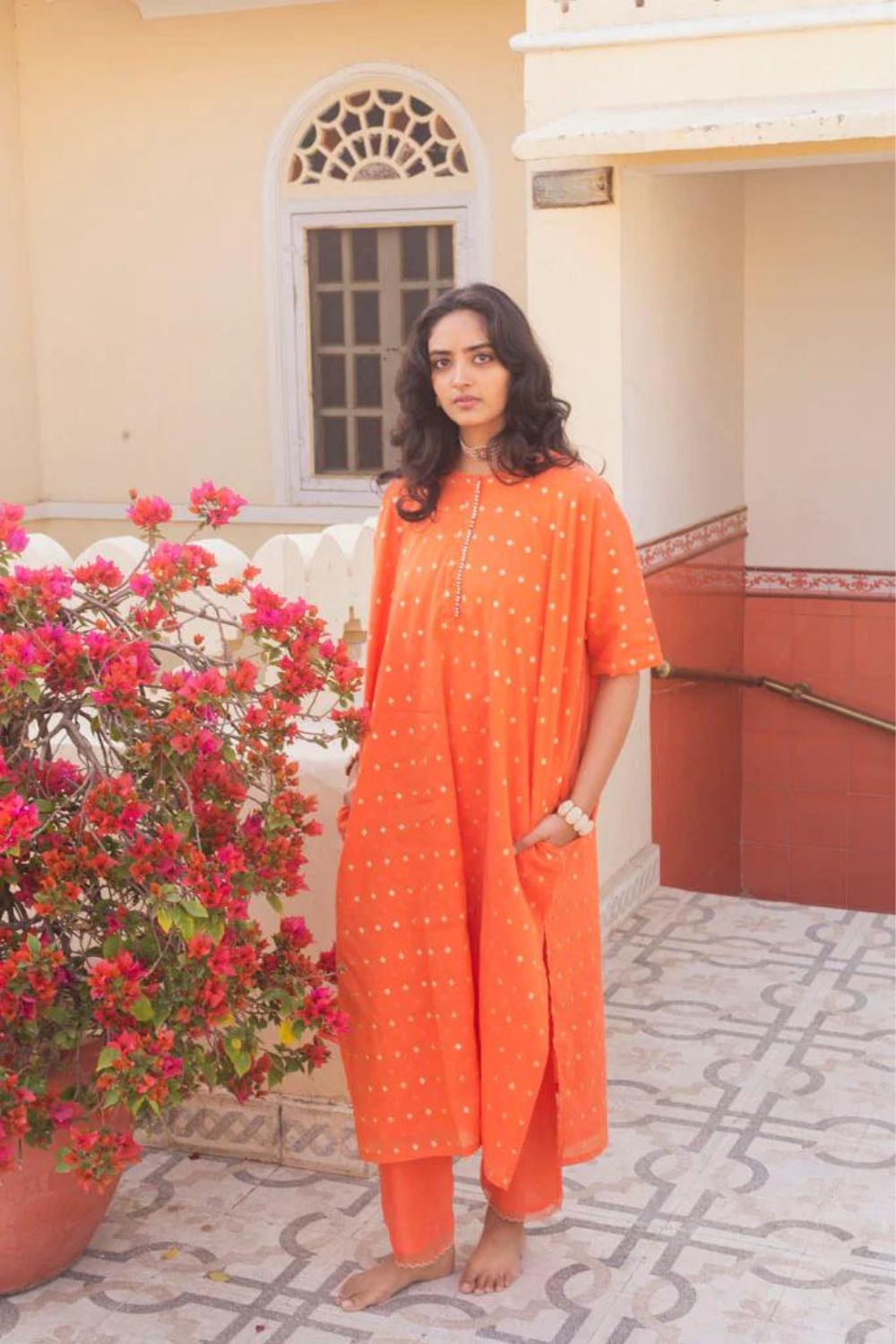 The silhouettes are simple but considered: relaxed cuts, thoughtful details, and fabrics that breathe — from handwoven cottons to delicately finished textiles rooted in Rajasthan’s craft culture. Colours stay close to the earth: muted florals, soft neutrals, and tones that age gracefully rather than fall out of season.