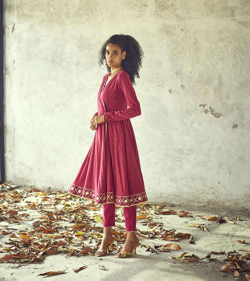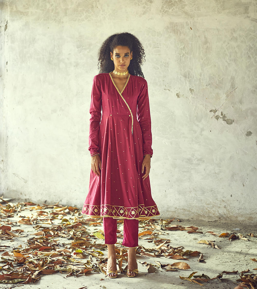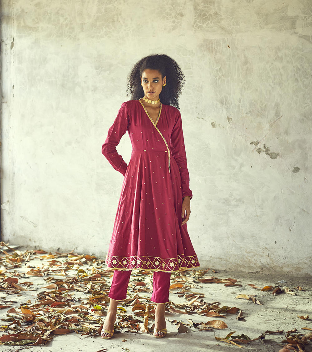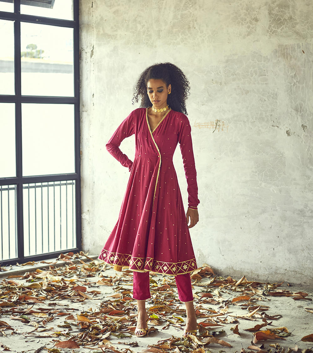 Our angoori kurta set, decorated with golden foil print all over and lace and gota work on the hems speaks for those starry nights of seclusion and peace. A fitted wrap torso with button fastening at the waist and ghera skirt add to the fun and festive mood of this outfit. Clubbed with a pair of narrow fit pants.