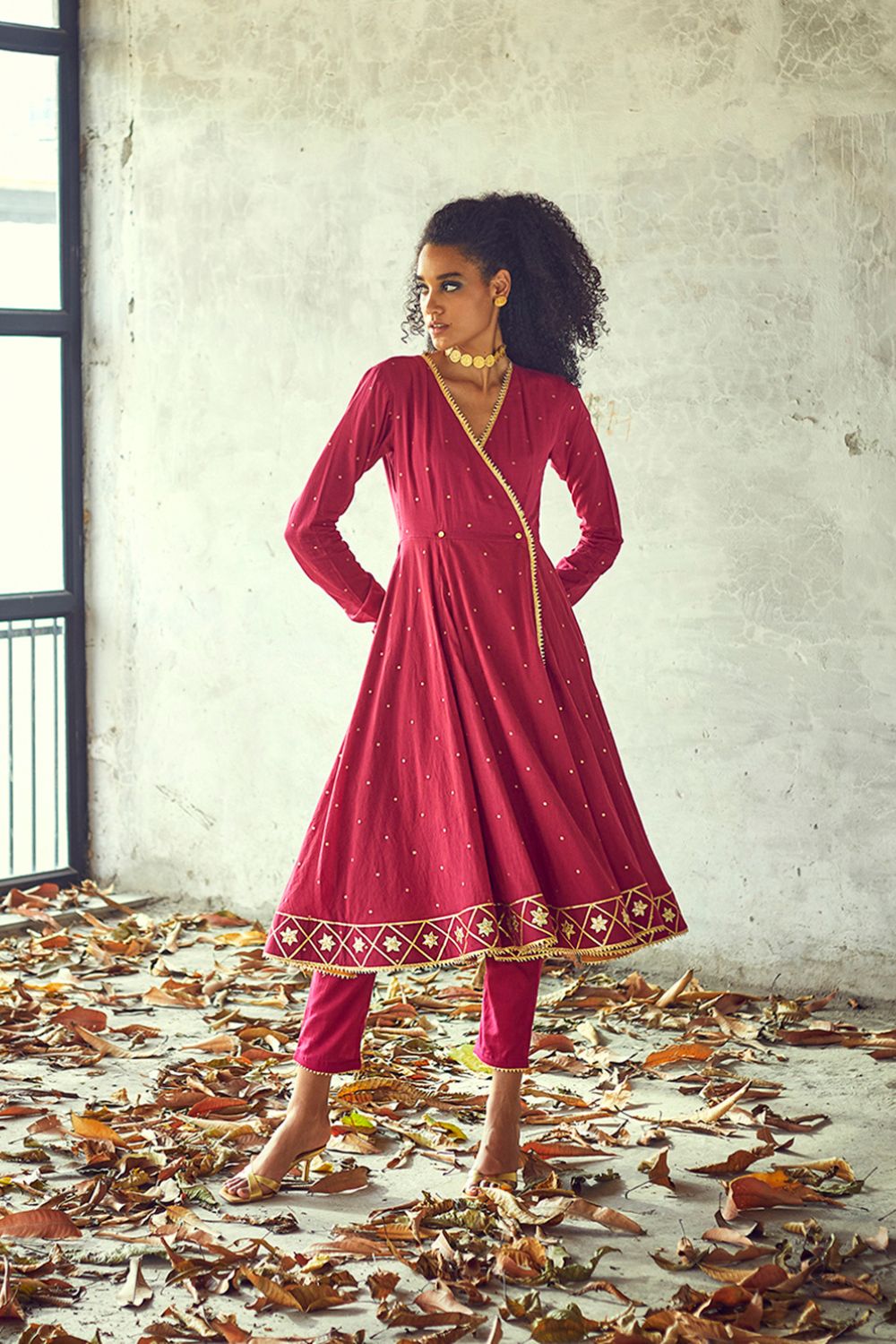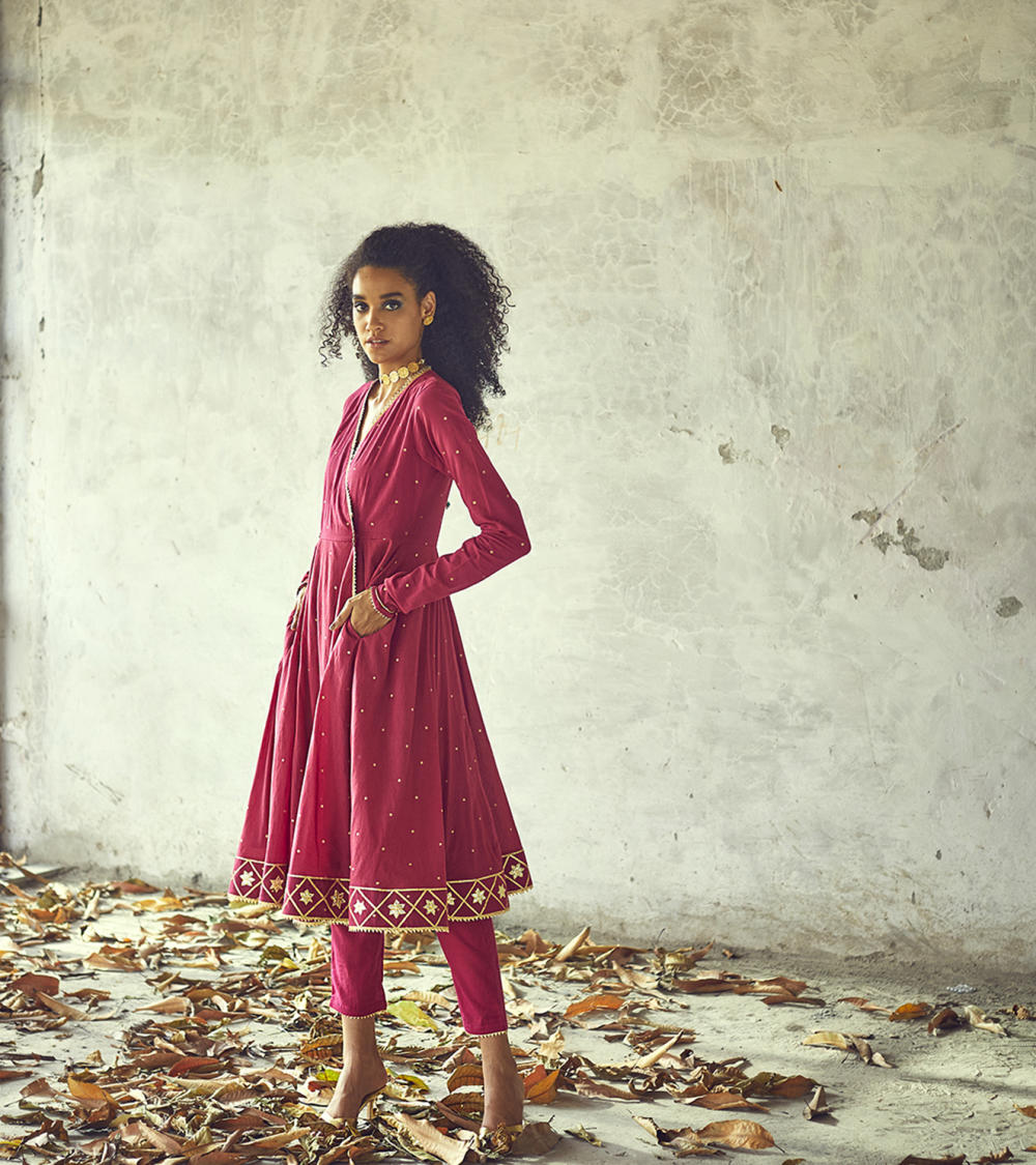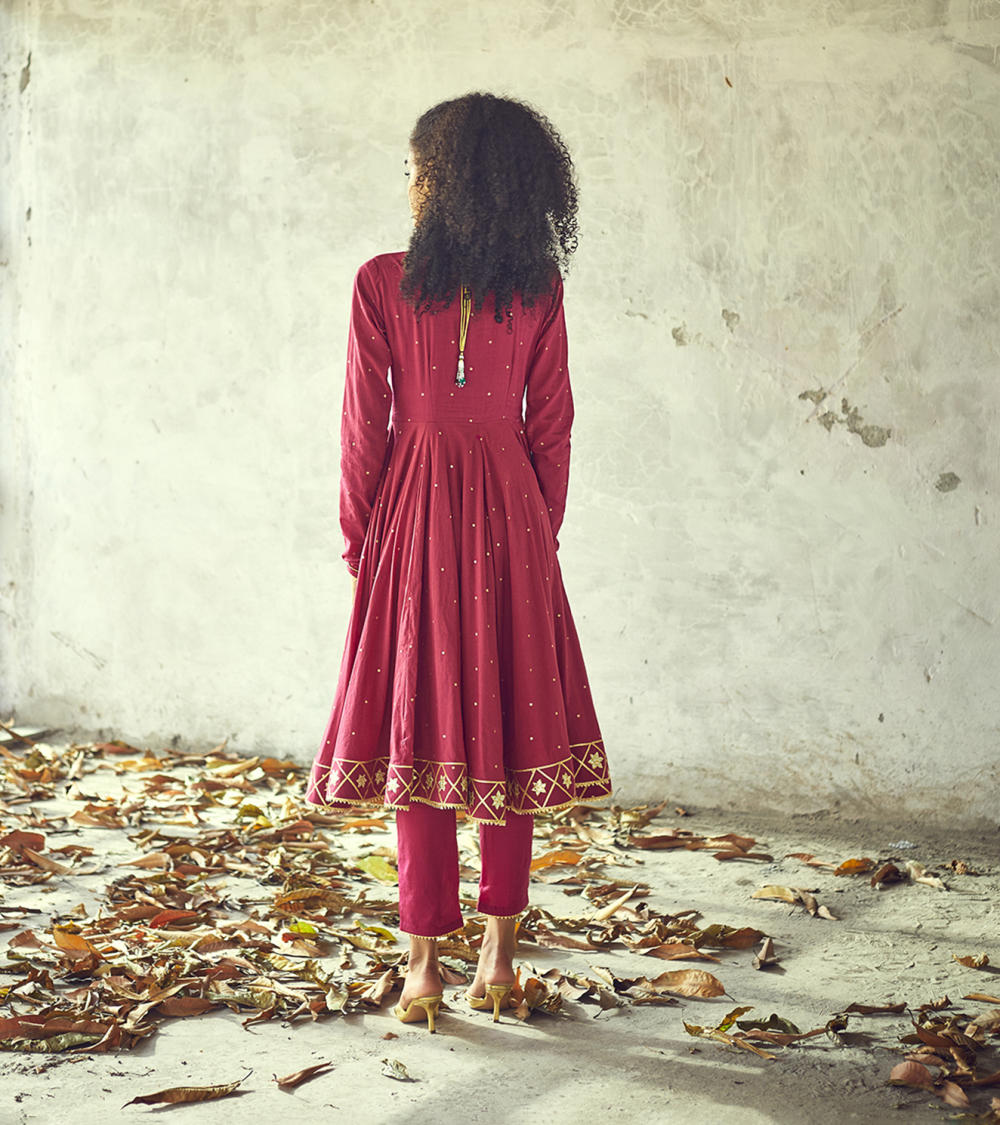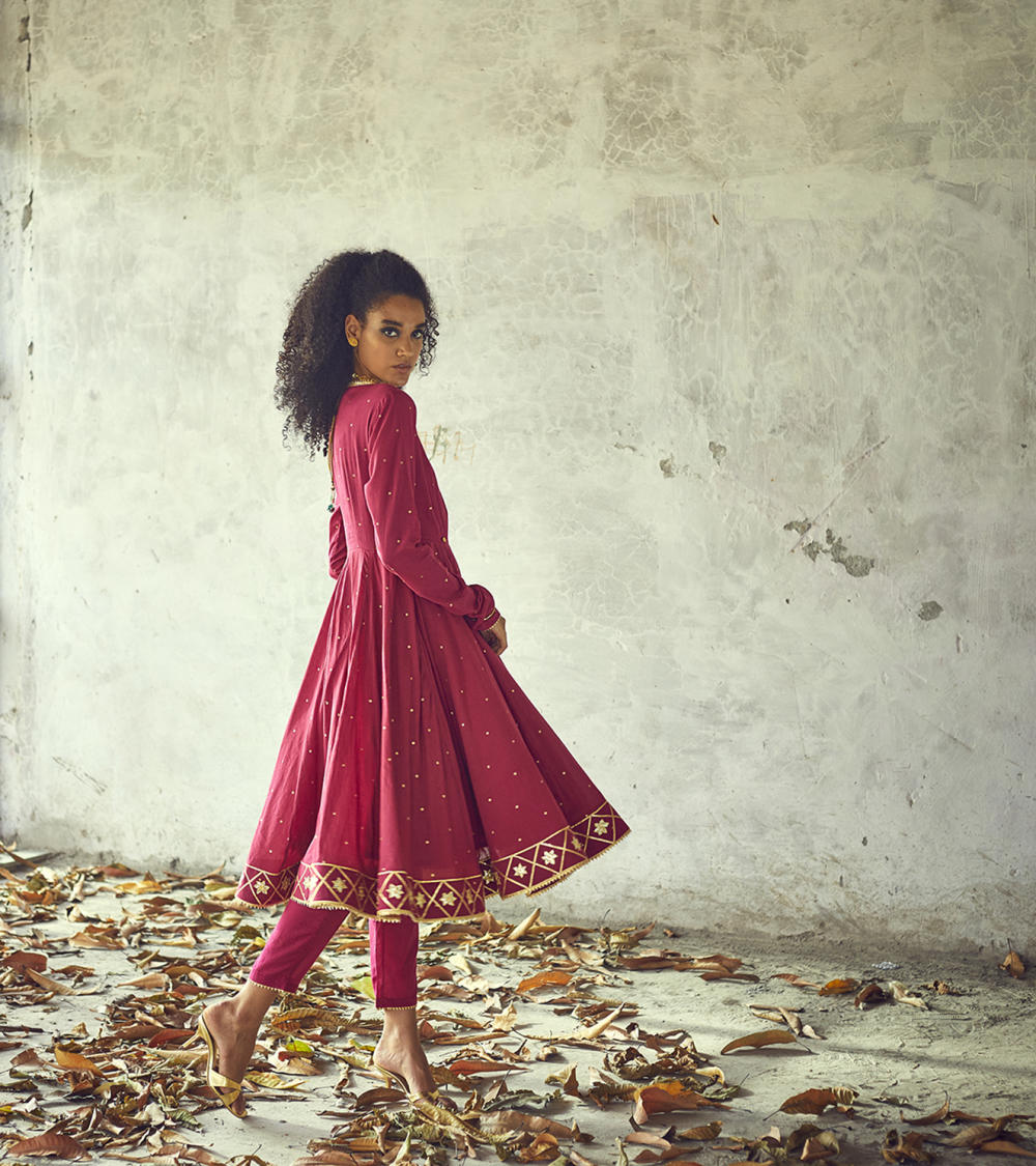 Our angoori kurta set, decorated with golden foil print all over and lace and gota work on the hems speaks for those starry nights of seclusion and peace. A fitted wrap torso with button fastening at the waist and ghera skirt add to the fun and festive mood of this outfit. Clubbed with a pair of narrow fit pants.