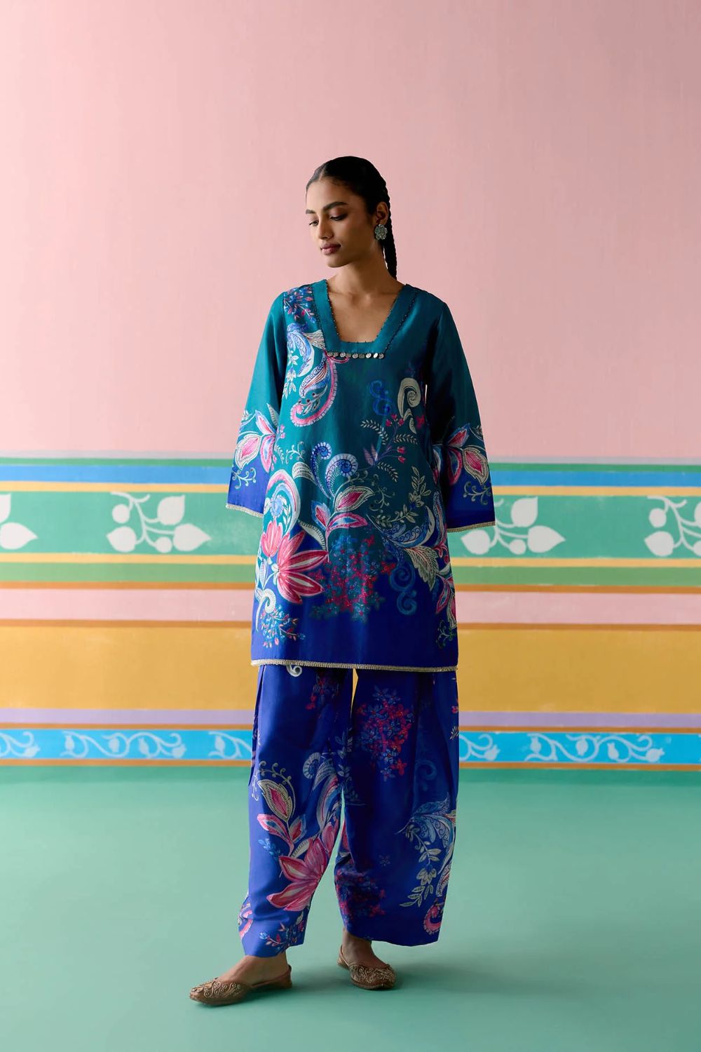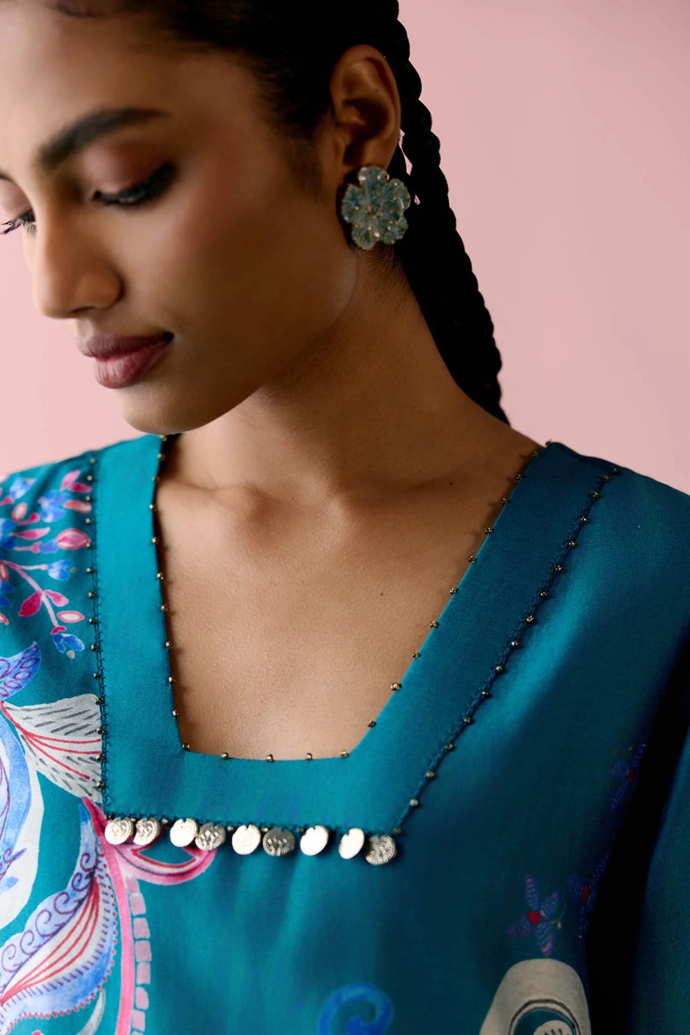 A graceful blend of charm and sophistication, the Teal Paisley Square Neck Kurta Set is designed to elevate your festive style.