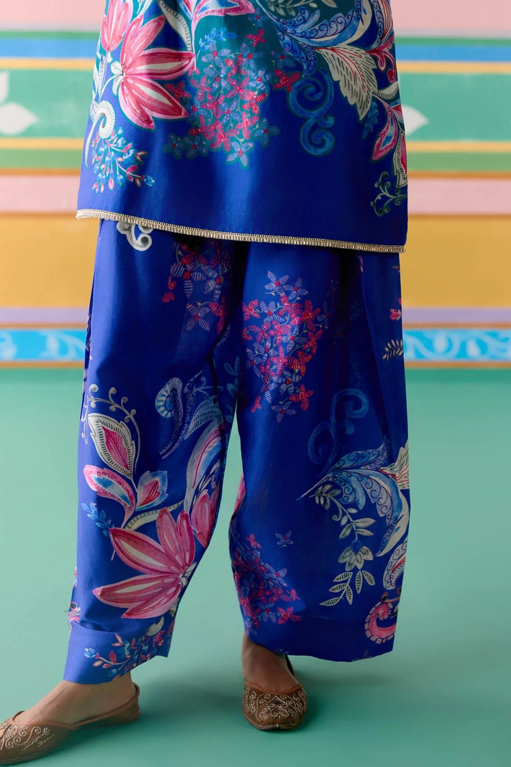 Tailored in airy Chanderi, the kurta is adorned with intricate lace detailing along the neckline, sleeves, and hem, finished with playful tassels for a hint of whimsy. The fully elasticated farsi-style pants offer ease of movement without compromising on elegance—making this set a perfect choice for both daytime festivities and evening soirees.
