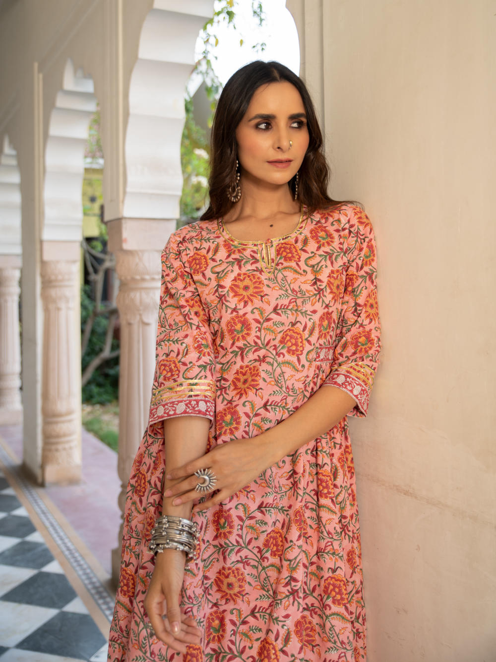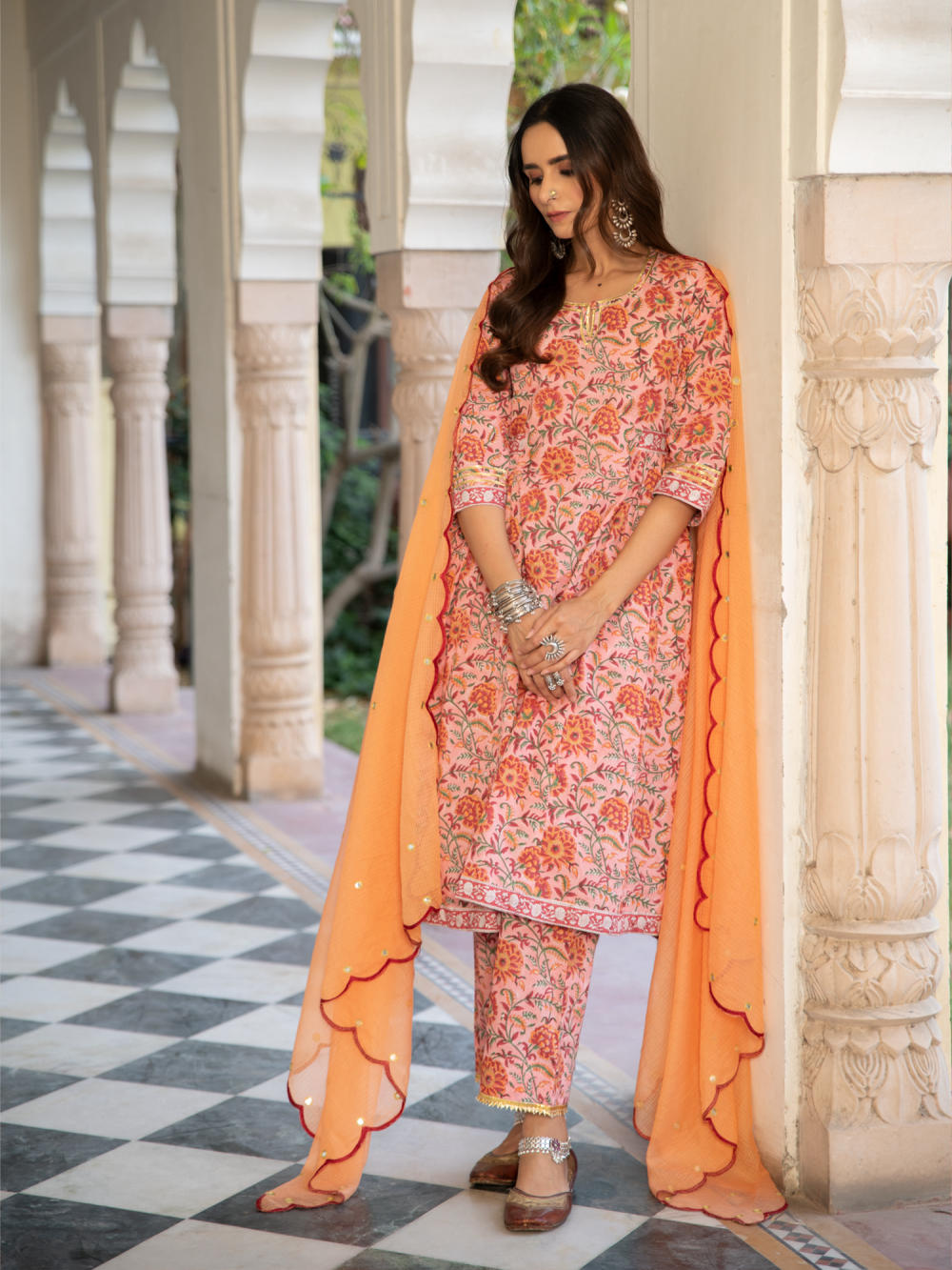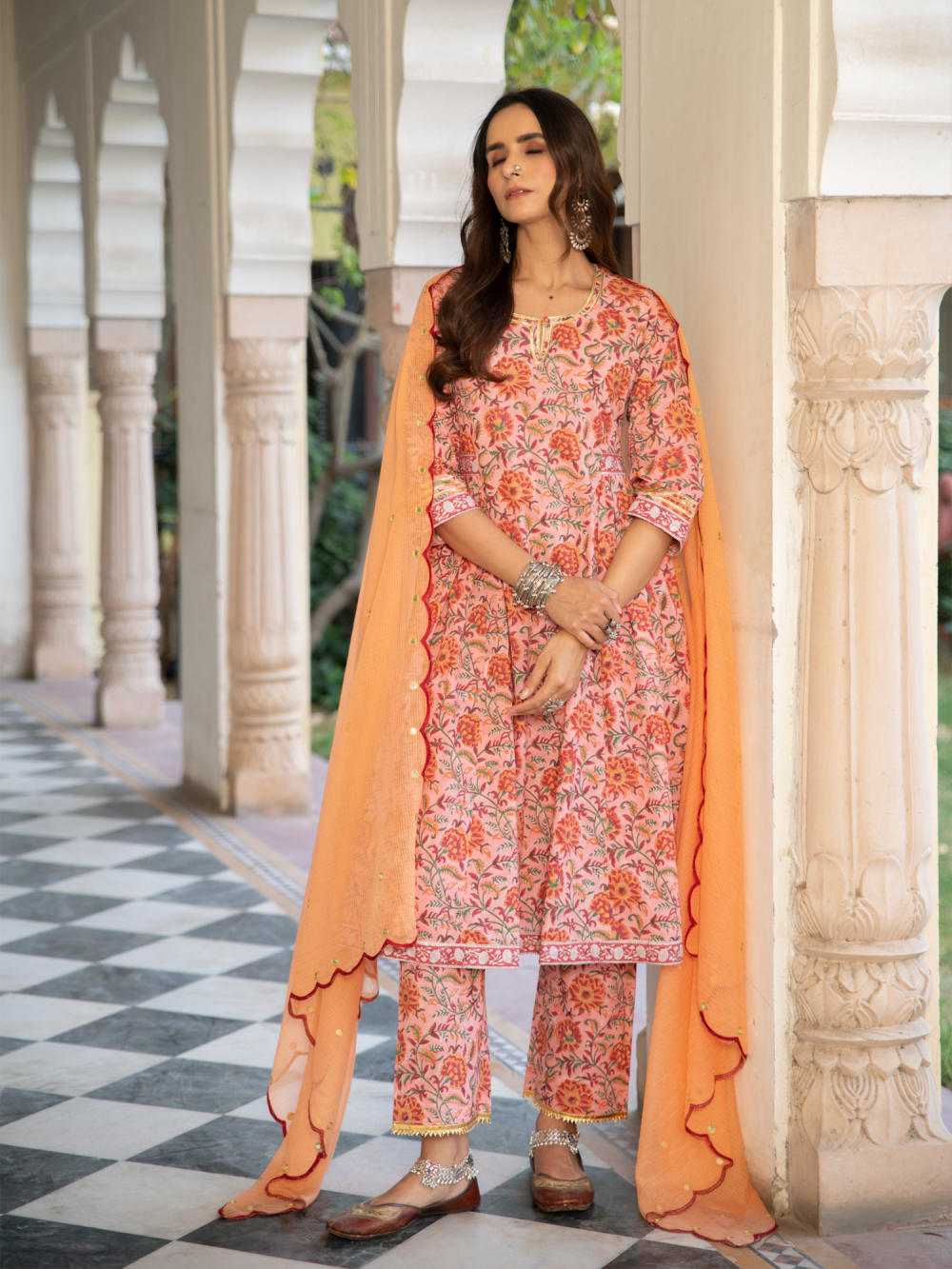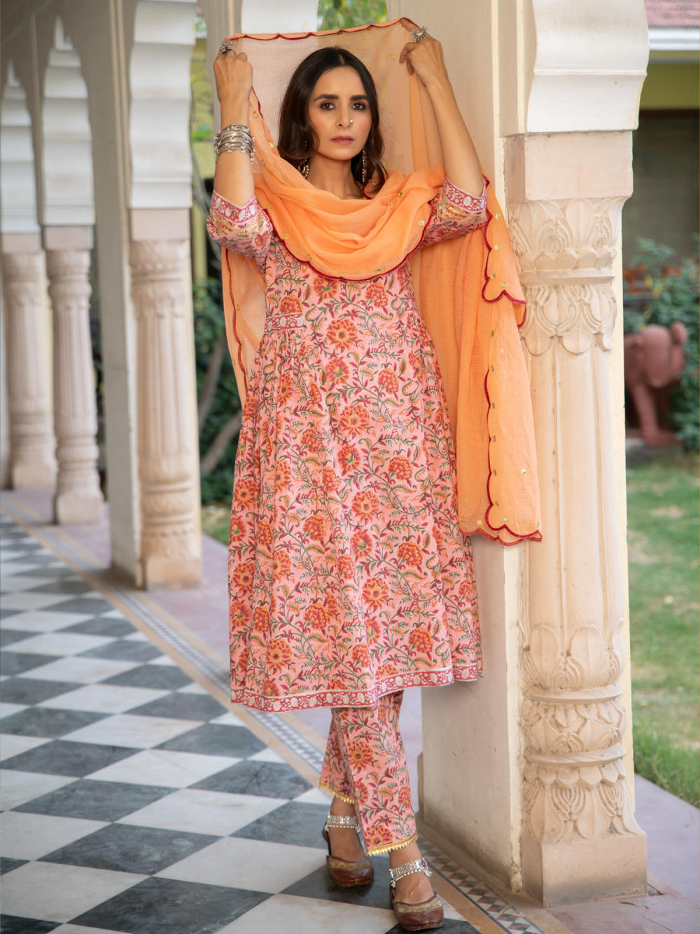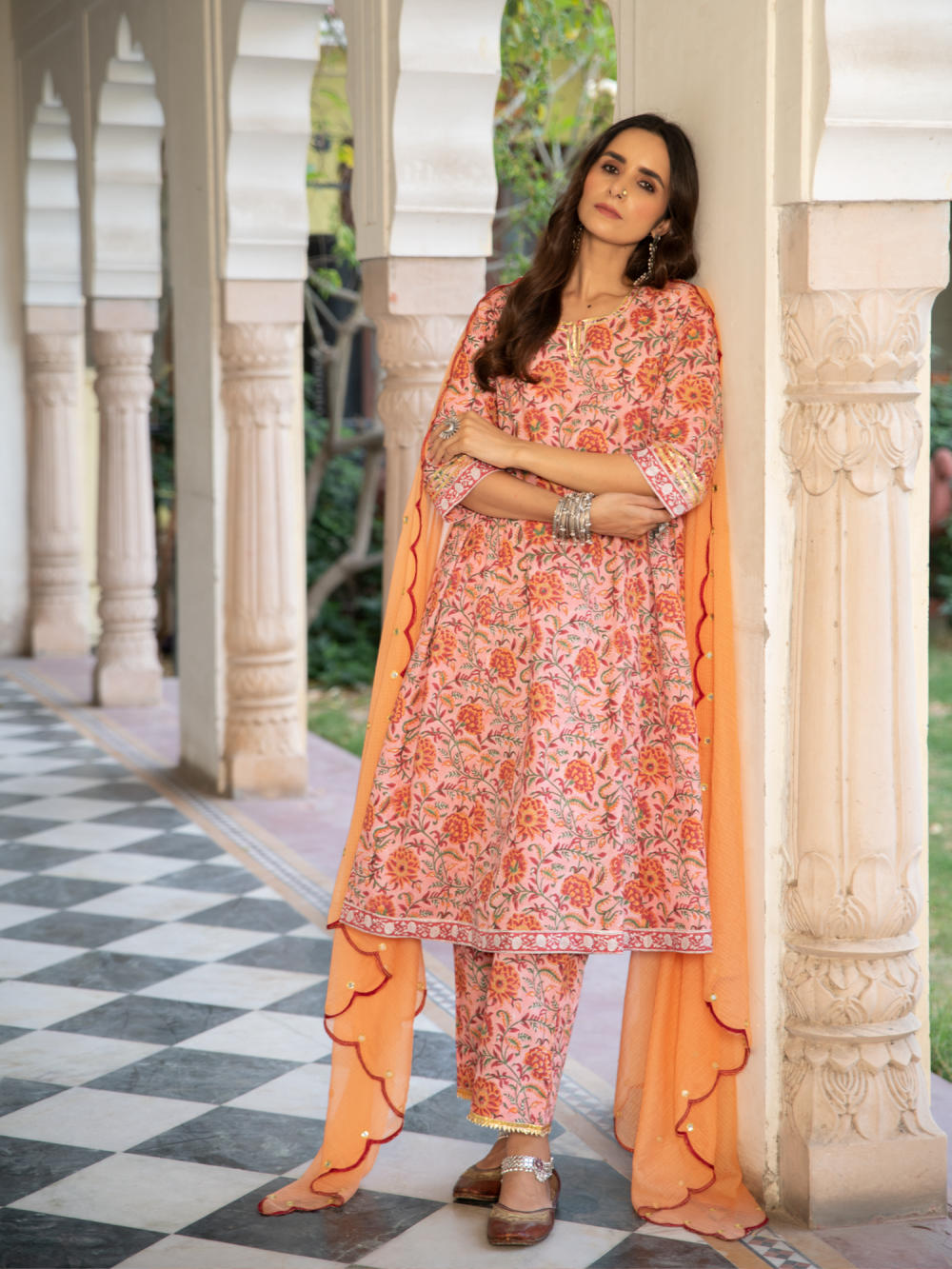 A poetic rendetion of a summer festive collection that makes you nostalgic, in classic luminous block prints. Handcrafted on a bed of fine cotton, mul and doria in hues of pastels. Perfect for light occasions. A set of 3 consists of kurta, pants & dupatta. KURTA: Summery florals combined with the most delicate silhouette inspired by the vintage bhopali peach kurta. This round neck, side gathered ghera kurta in cotton with loop button and gota detailing is a summer staple . Finished with hand printed border on the gather and ghera of the kurta. PANTS: Printed cotton pants finished with gota and bijiya. DUPATTA: Lota doriya dupatta with scalloped edges and mirror zari highlights