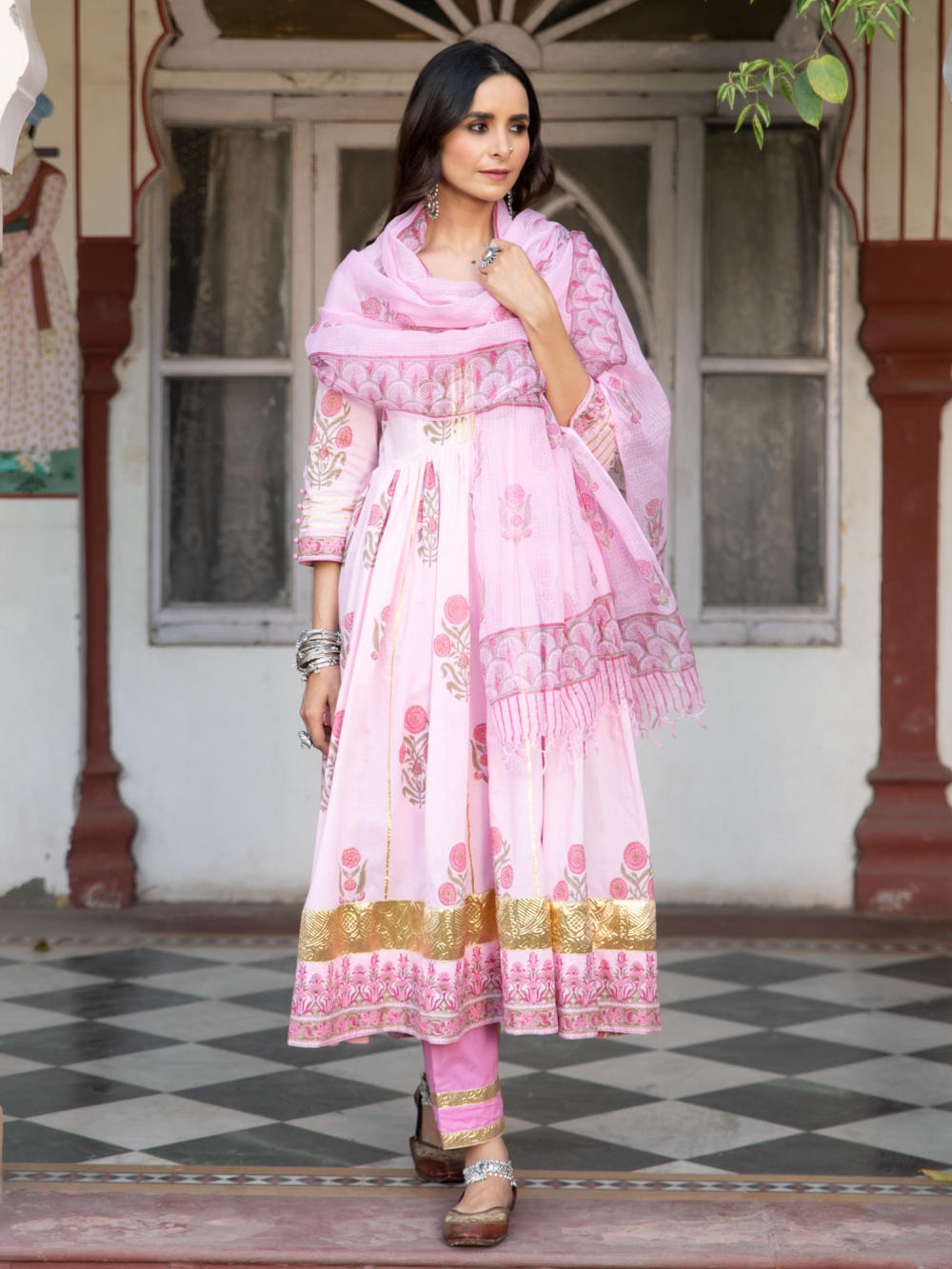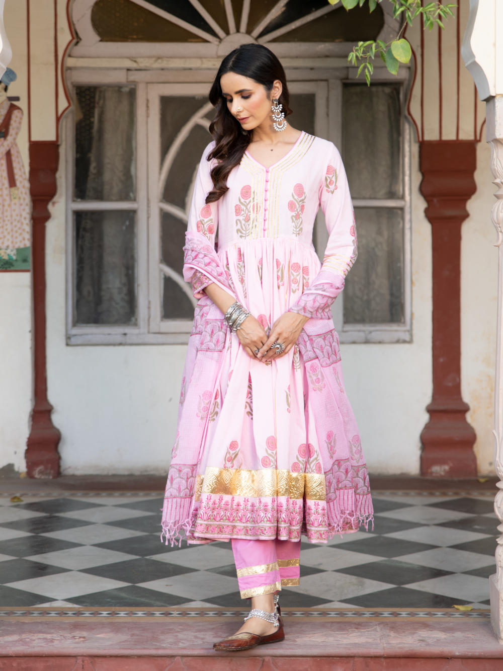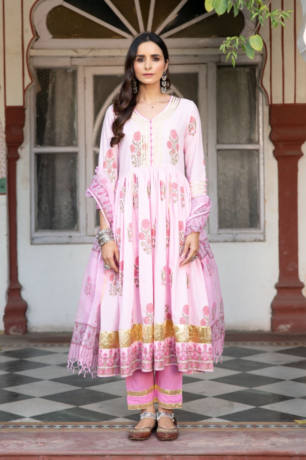 A poetic rendetion of a summer festive collection that makes you nostalgic, in classic luminous block prints. Handcrafted on a bed of fine cotton, mul and doria in hues of pastels. Perfect for light occasions. A set of 3 consists of kurta, staight pant & dupatta. KURTA: A gathered handprinted kurta with mughal buttas on an blush pink base. Complete with gota detailing, hand made buttons and lampi work. PANTS: Combined with pink straight pants, detailed with gota highlights. DUPATTA: Handblock printed kota doria dupatta