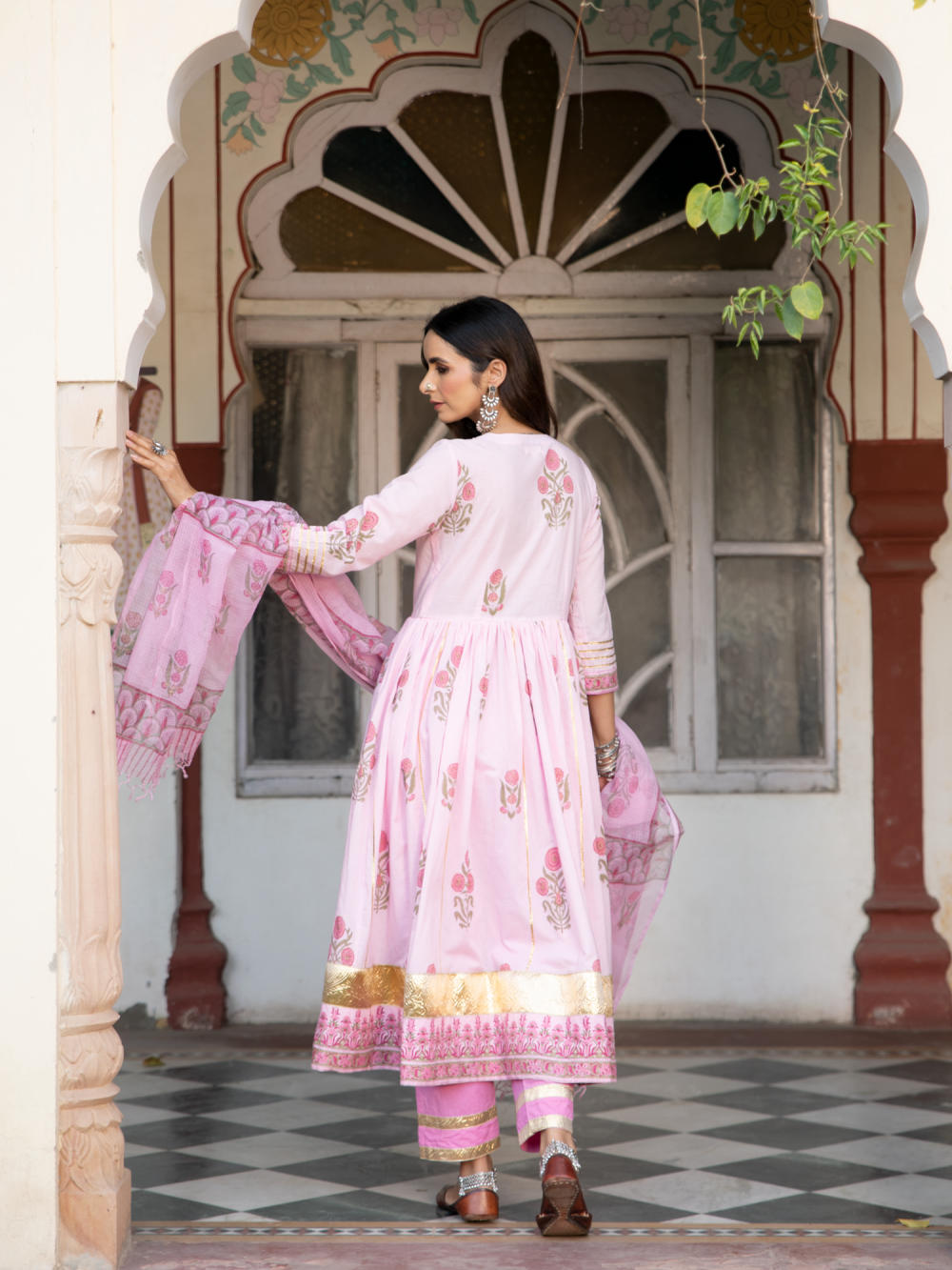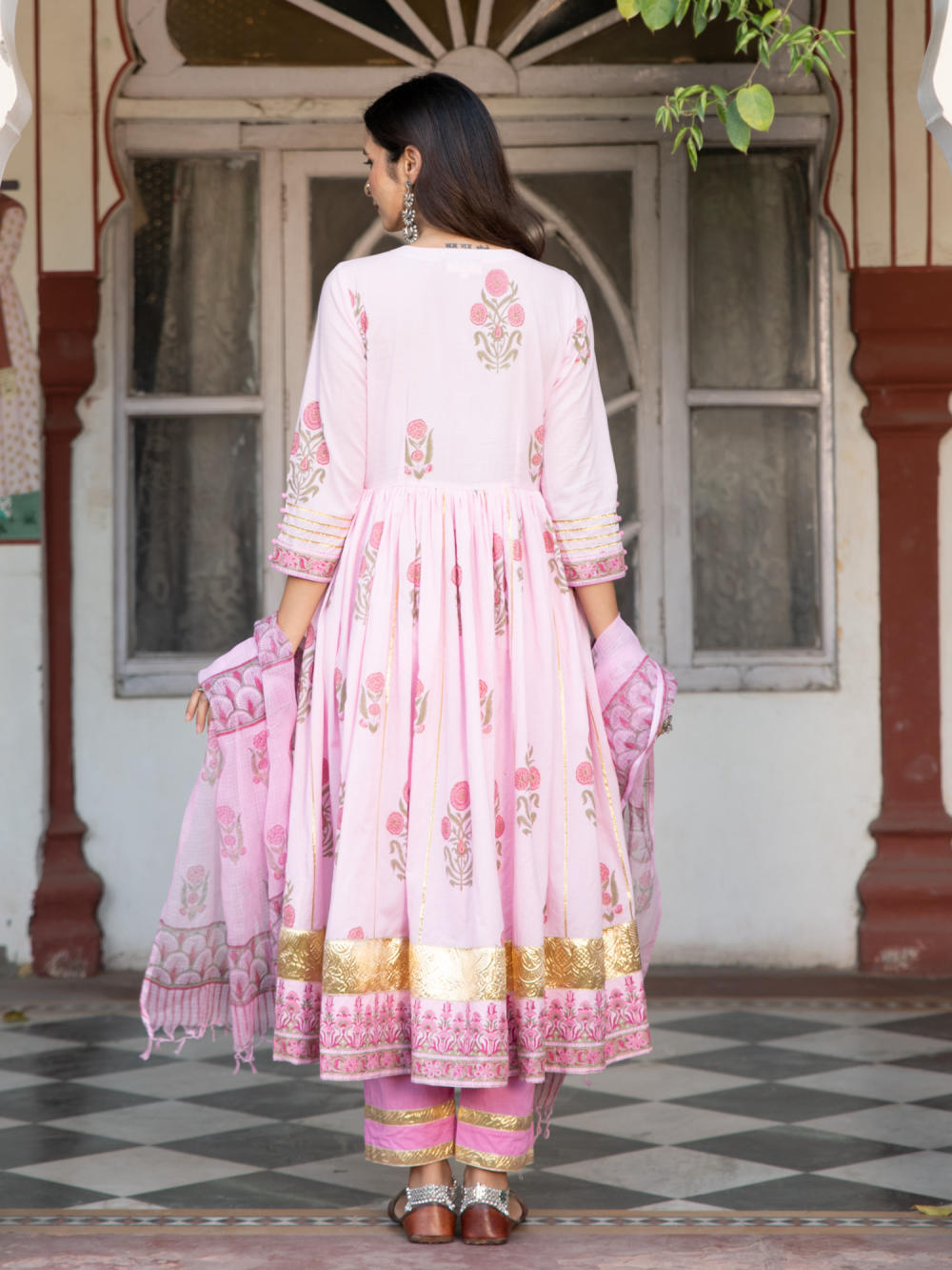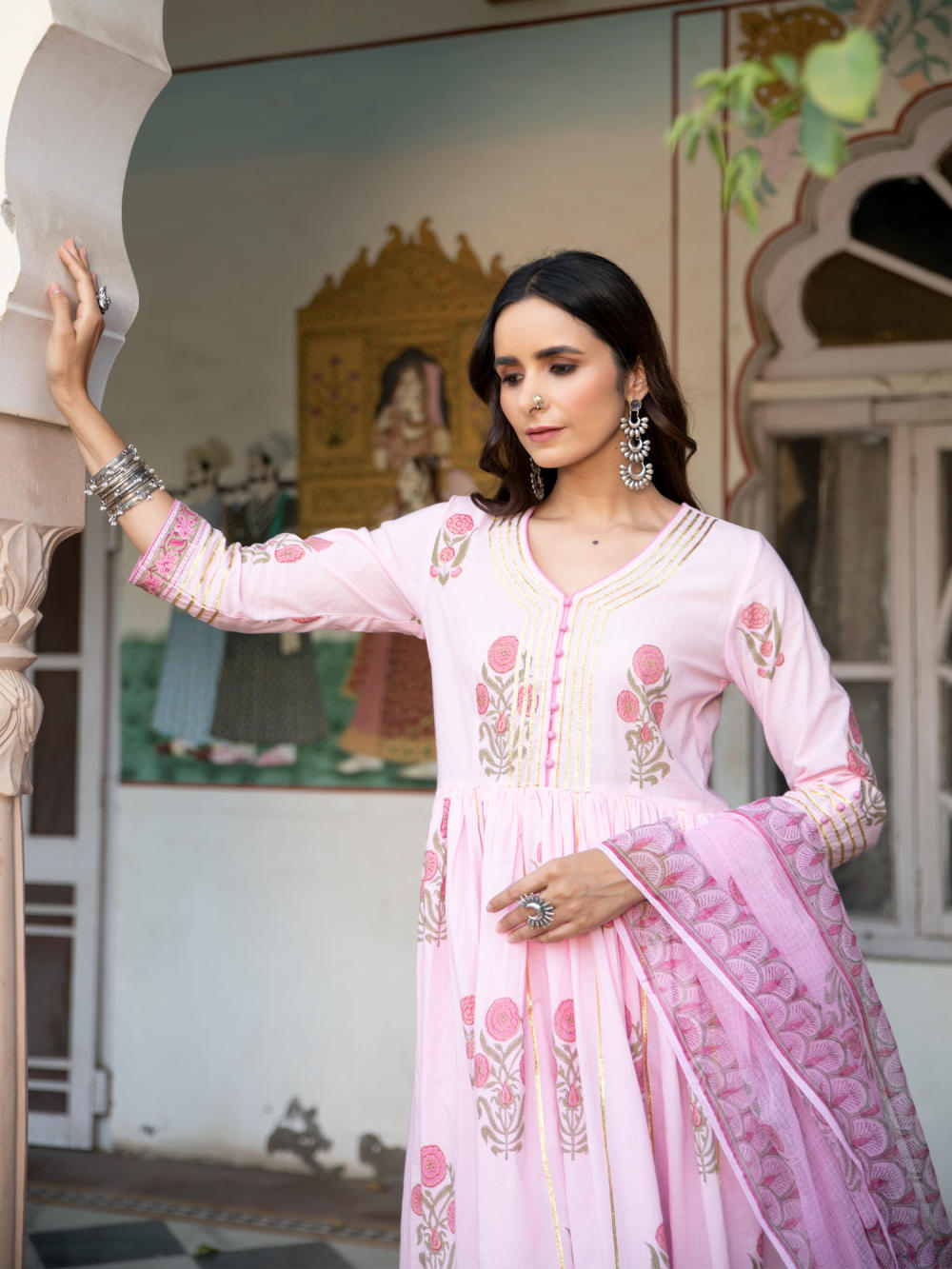 A poetic rendetion of a summer festive collection that makes you nostalgic, in classic luminous block prints. Handcrafted on a bed of fine cotton, mul and doria in hues of pastels. Perfect for light occasions. A set of 3 consists of kurta, staight pant & dupatta. KURTA: A gathered handprinted kurta with mughal buttas on an blush pink base. Complete with gota detailing, hand made buttons and lampi work. PANTS: Combined with pink straight pants, detailed with gota highlights. DUPATTA: Handblock printed kota doria dupatta