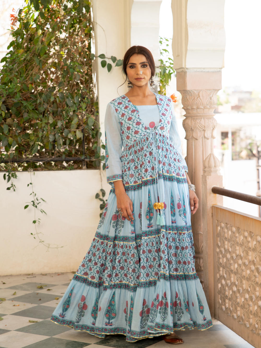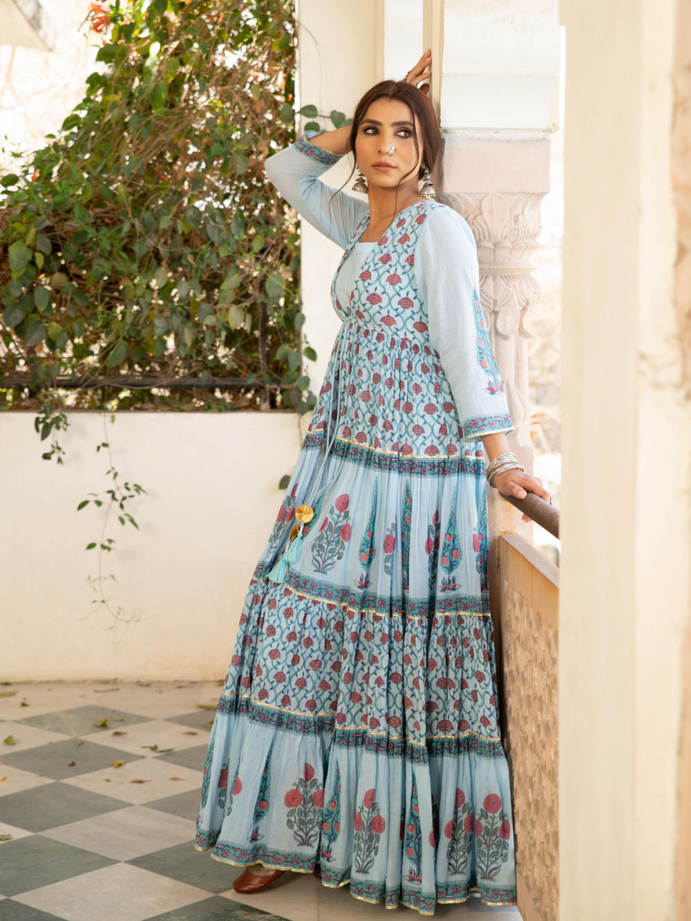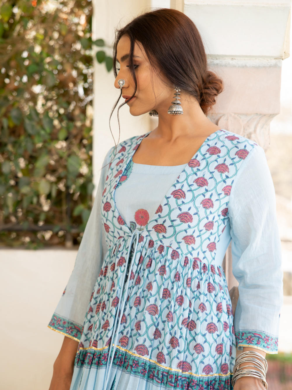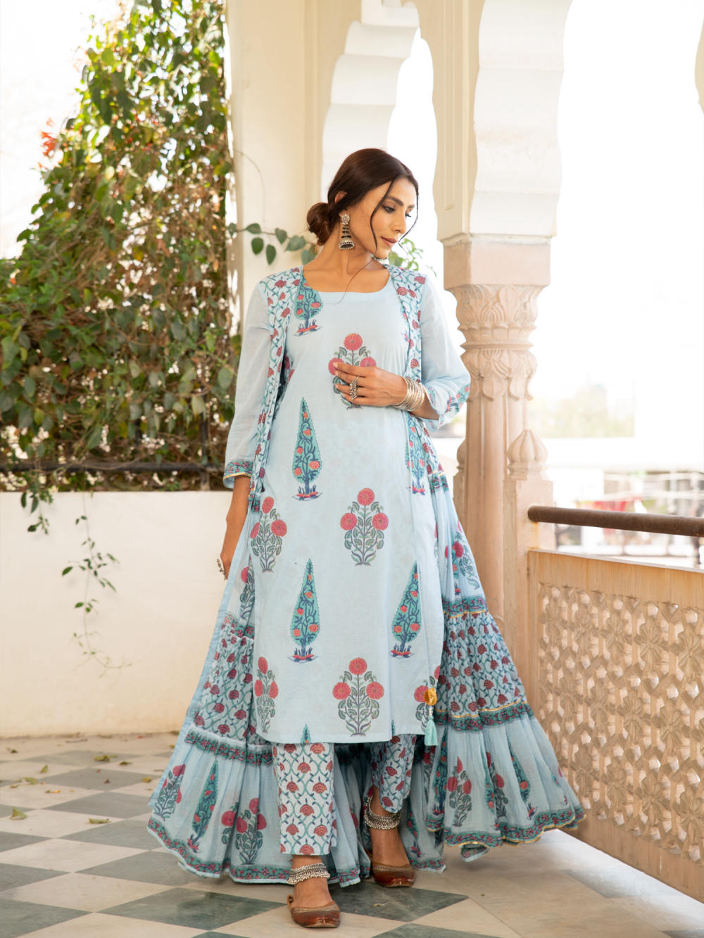 A poetic rendetion of a summer festive collection that makes you nostalgic, in classic luminous block prints. Handcrafted on a bed of fine cotton, mul and doria in hues of pastels. Perfect for light occasions. A set of 3 consists of overlay/jama, inner and pants. JACKET: A sky blue flowly tiered mughal block print jama in floral Chinar and phool butta with mughal jaal. INNER: A simple A-line inner complete with printed buttas. PANTS: Sky blue straight fit cotton pants in jaal print.