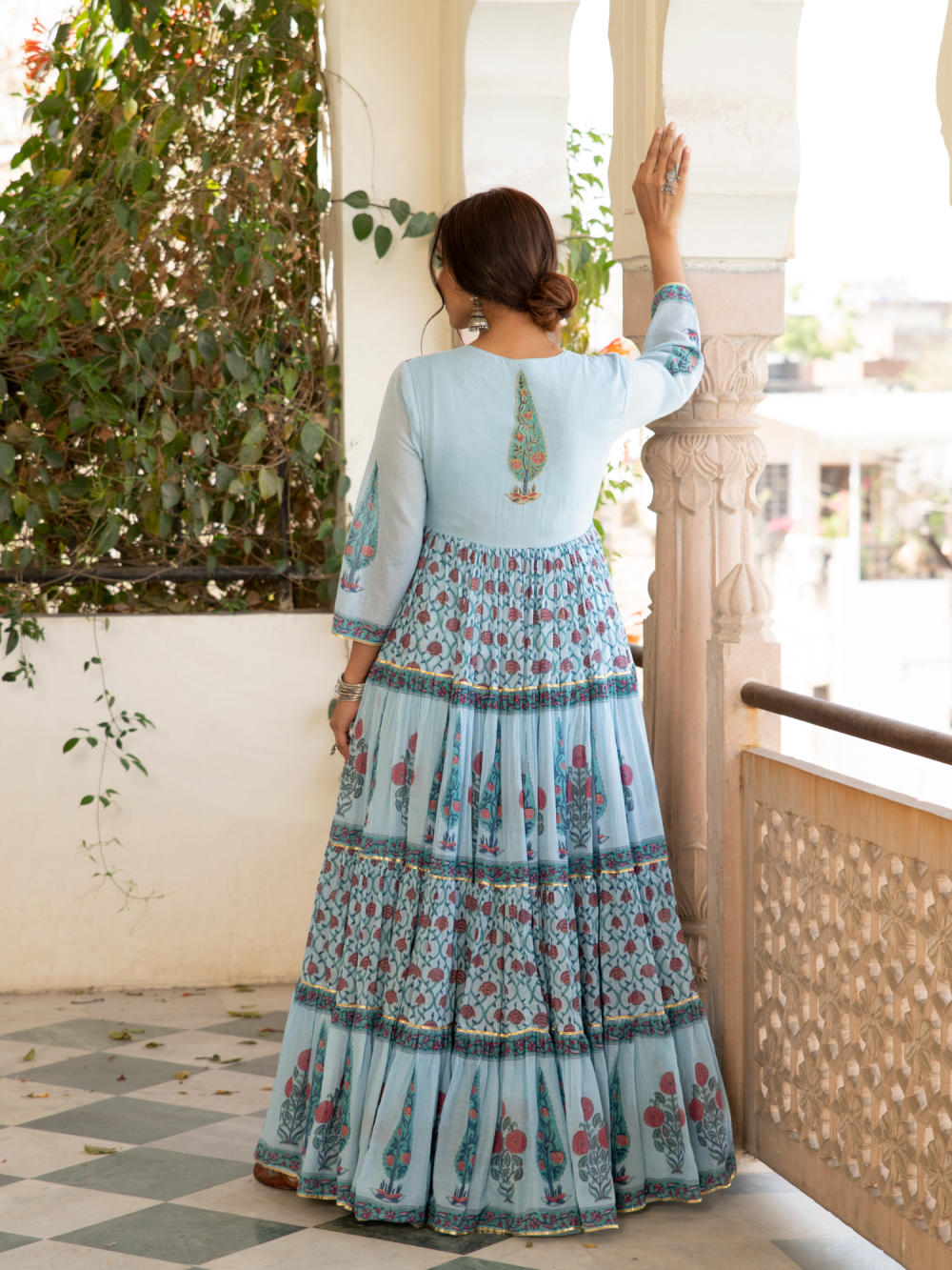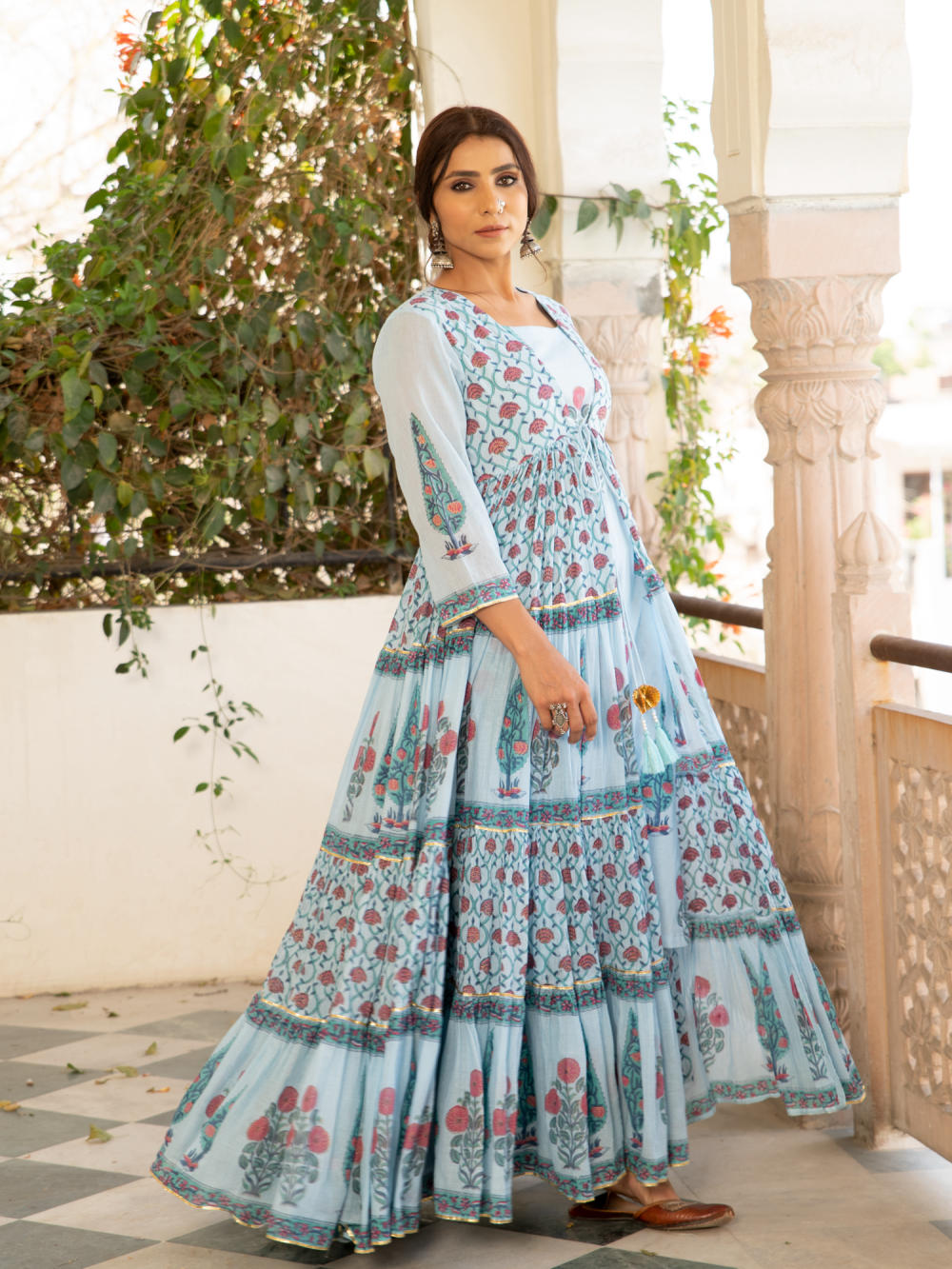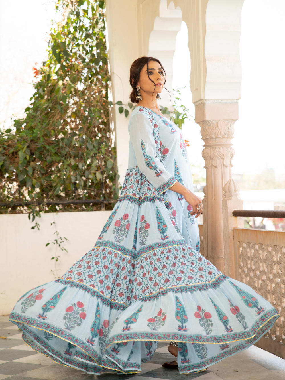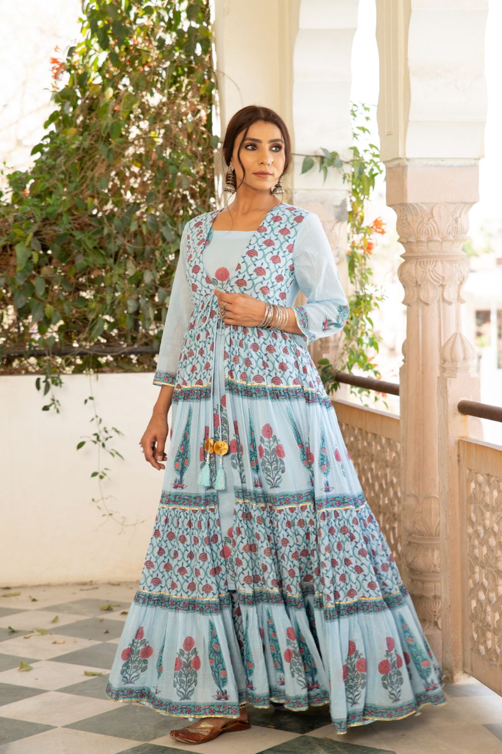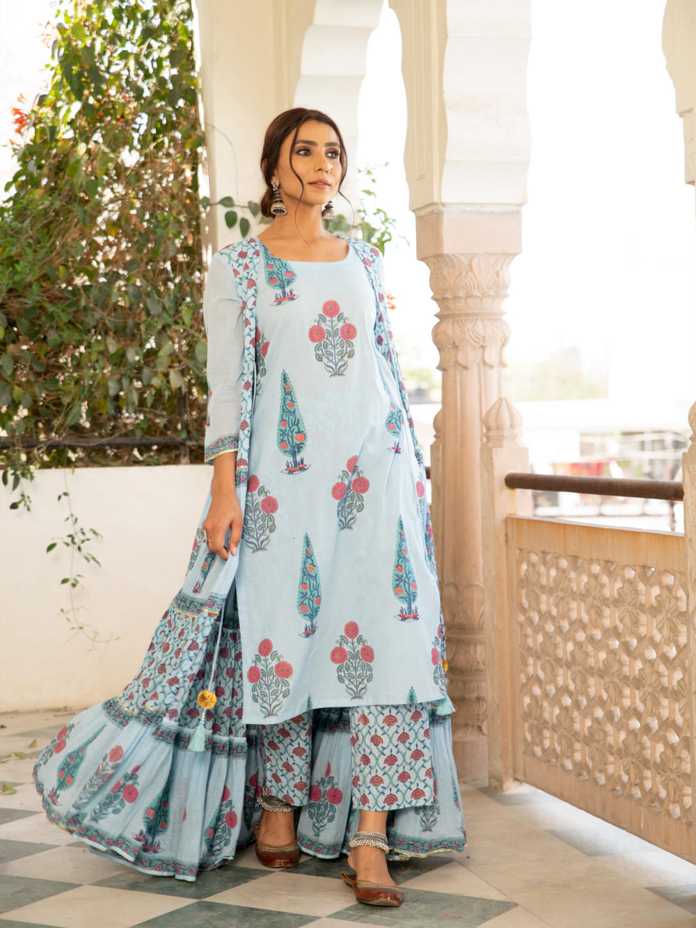A poetic rendetion of a summer festive collection that makes you nostalgic, in classic luminous block prints. Handcrafted on a bed of fine cotton, mul and doria in hues of pastels. Perfect for light occasions. A set of 3 consists of overlay/jama, inner and pants. JACKET: A sky blue flowly tiered mughal block print jama in floral Chinar and phool butta with mughal jaal. INNER: A simple A-line inner complete with printed buttas. PANTS: Sky blue straight fit cotton pants in jaal print.