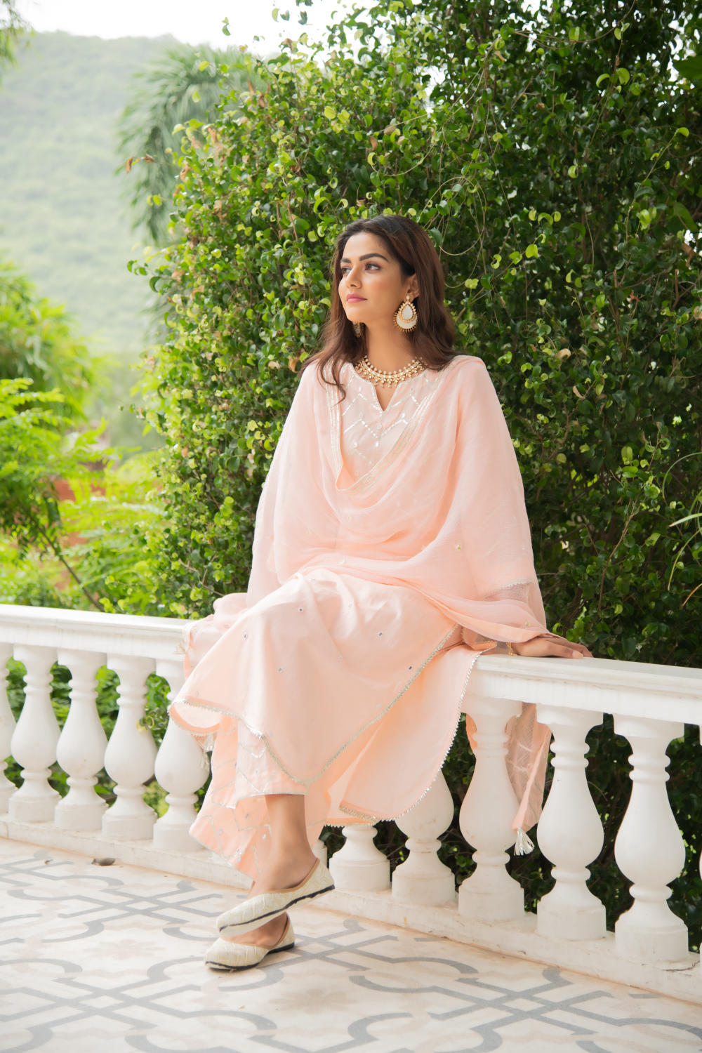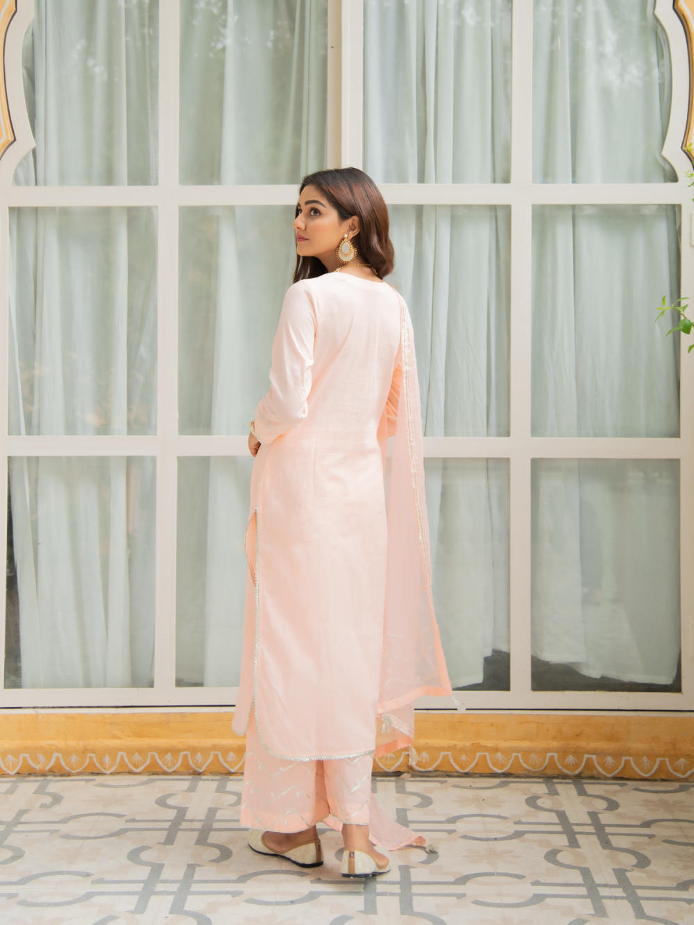 Set of 3 consists of kurta, palazzo and dupatta. Noor, bringing the magic of festivities straight to your closet in shades of pastels. Delicately adorned with mirror & gota detailing.
