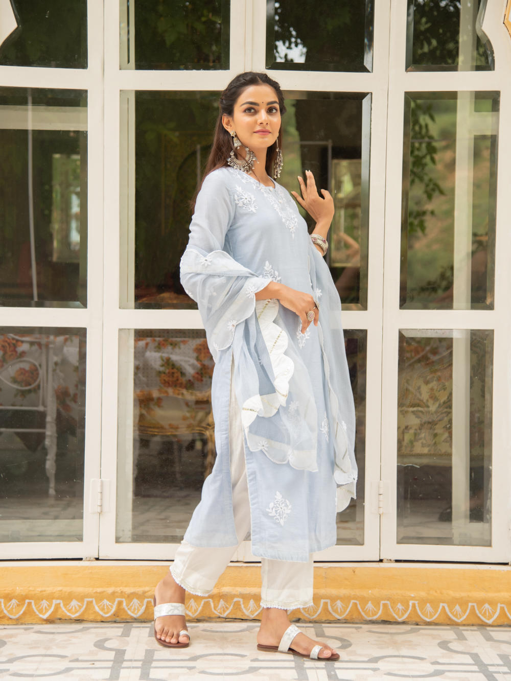 KURTI: A elegant powder blue chanderi kurti with kasida mirror and thread work on the neckline, sleeves & hemline.