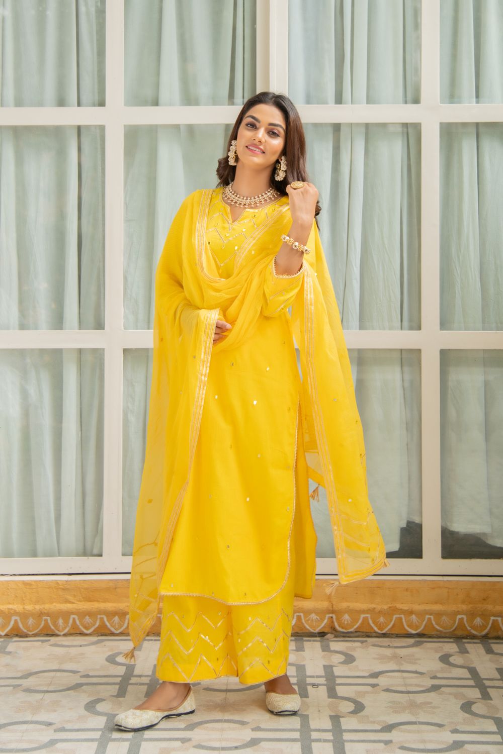 KURTI: A minimal straight fit cheerful yellow kurti with gota &mirror detailing on the neckline, sleeves & hemline.