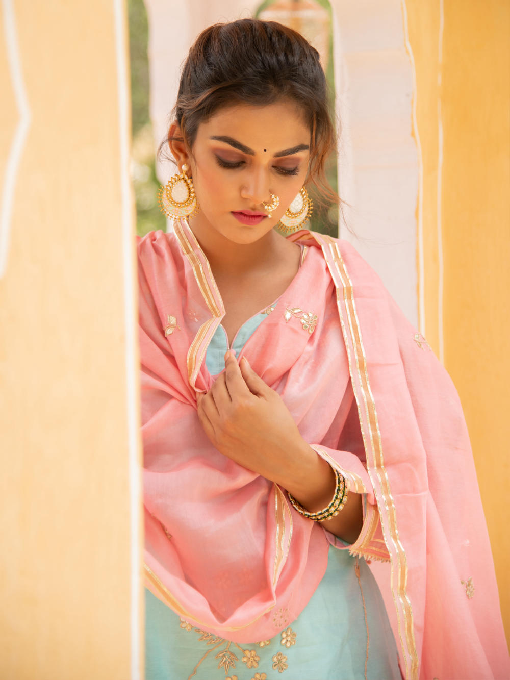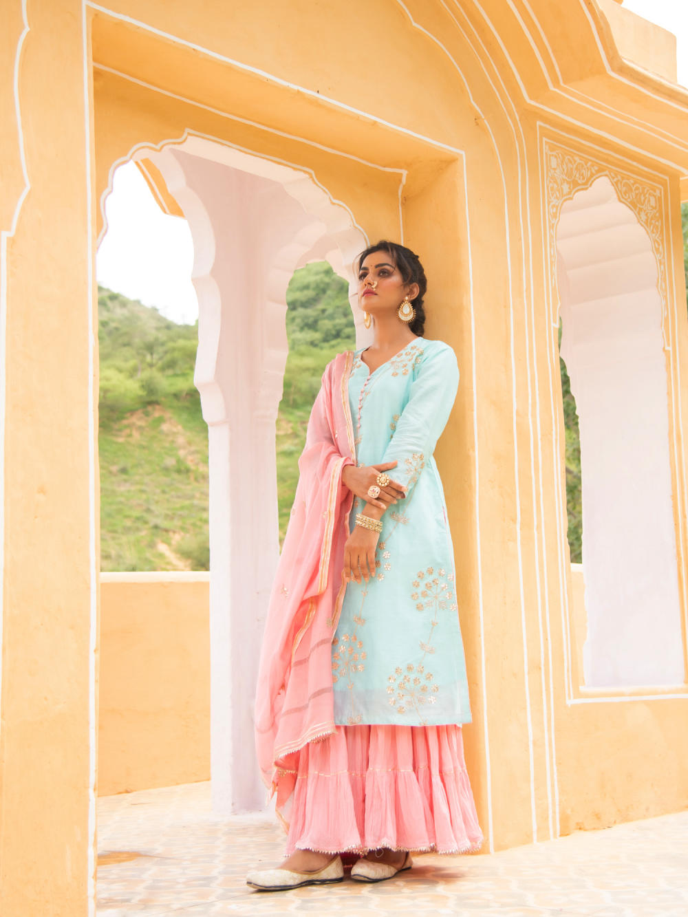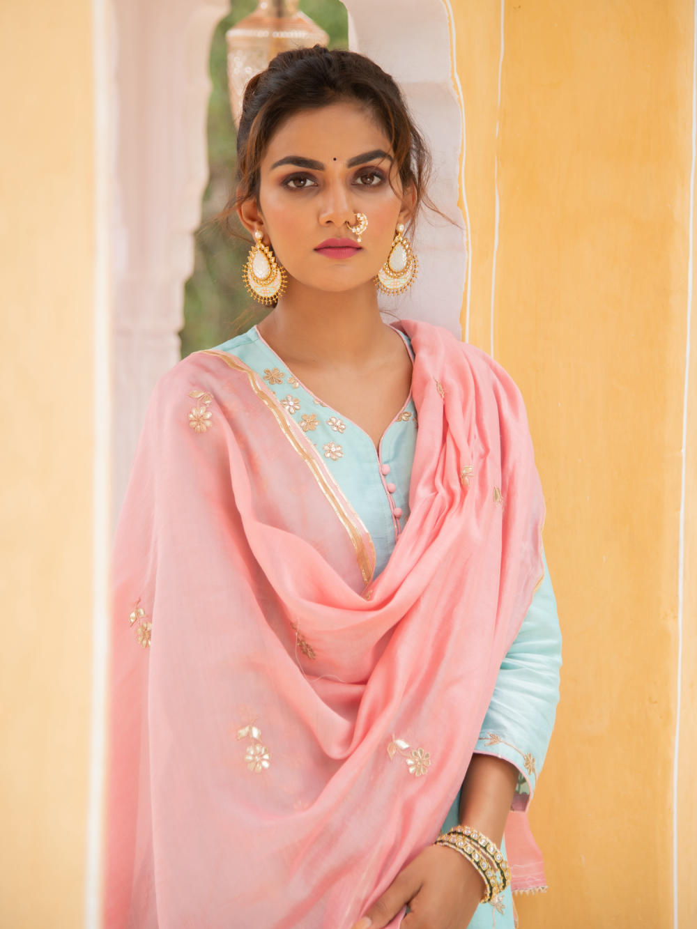 KURTI: A pastel medley powder blue chanderi kurta with heavy gota jhaal detailing on the neckline, sleeves & hemline.
