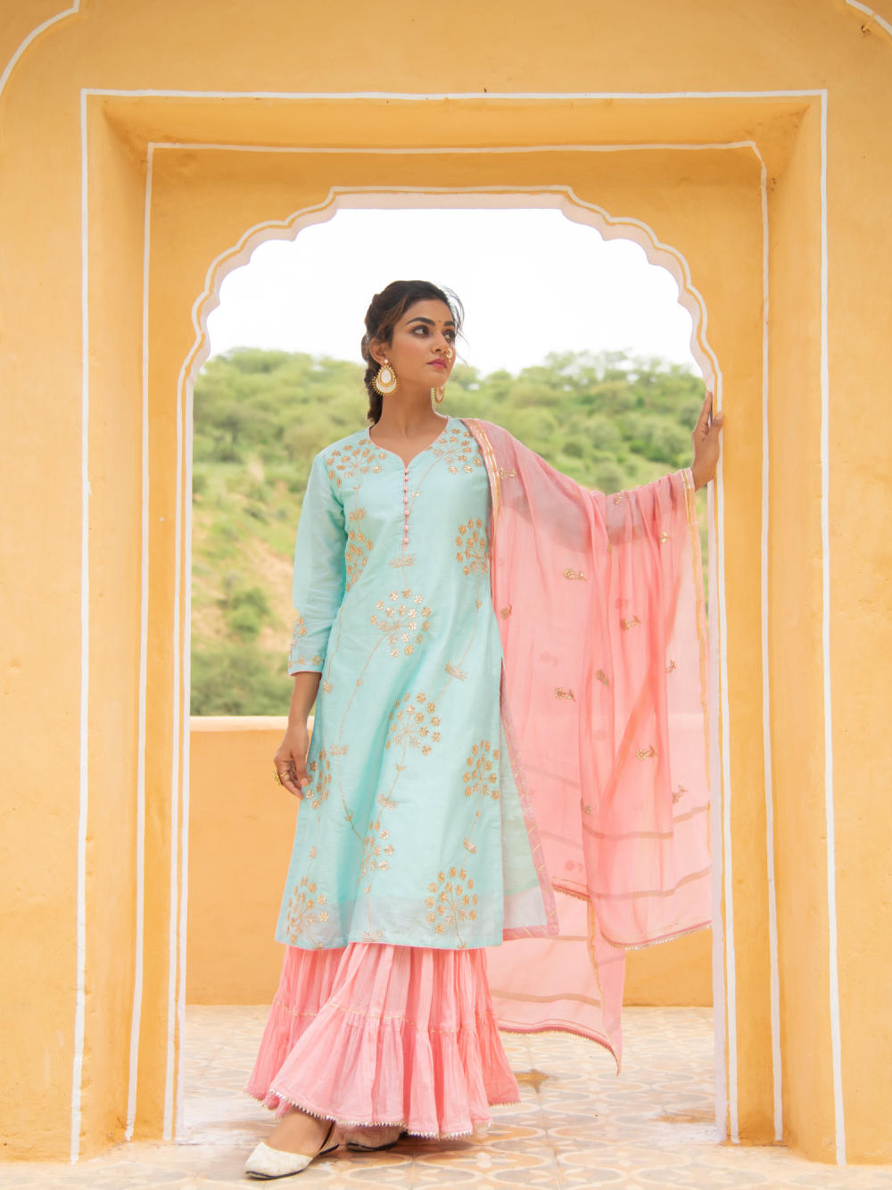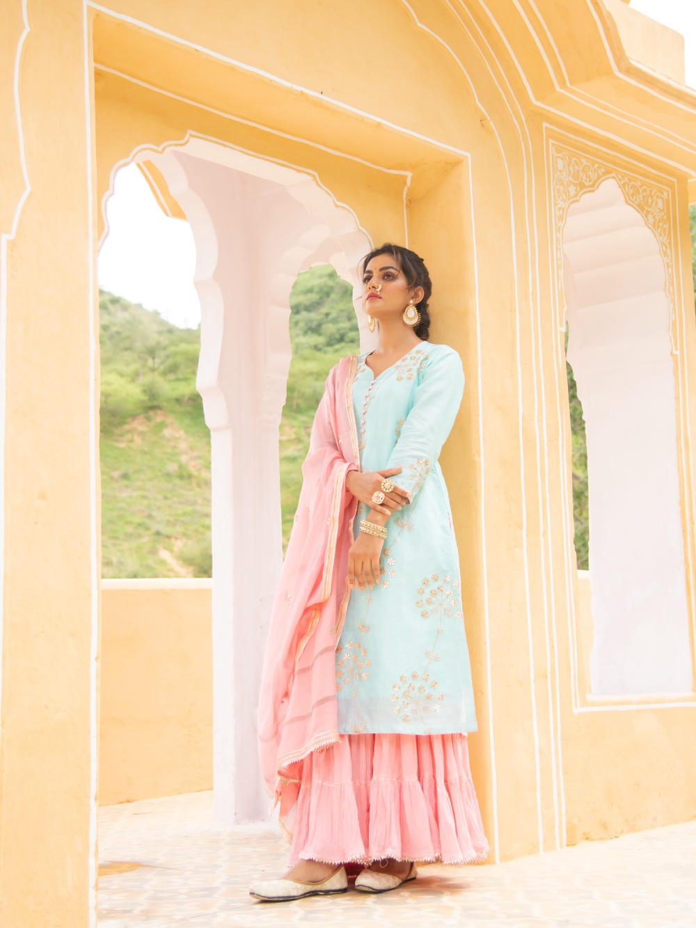 Set of 3 consists of kurta, sharara and dupatta Noor, bringing the magic of festivities straight to your closet in shades of pastels.