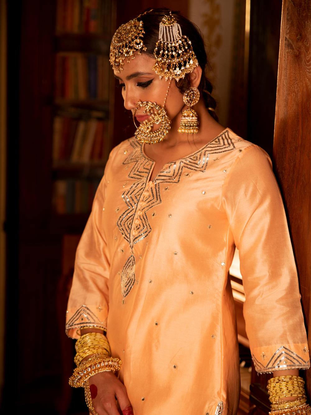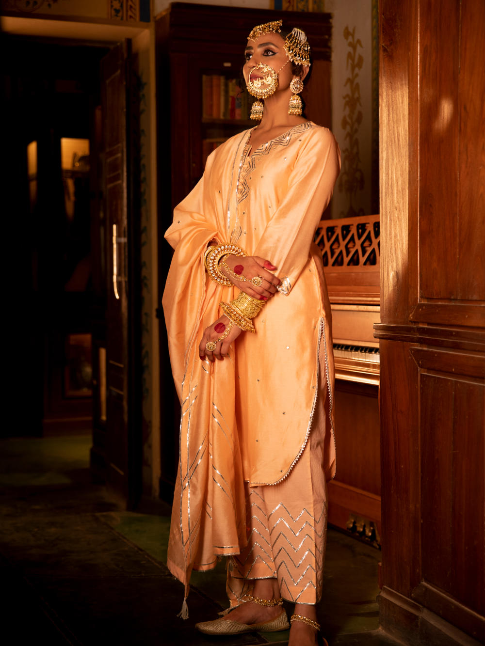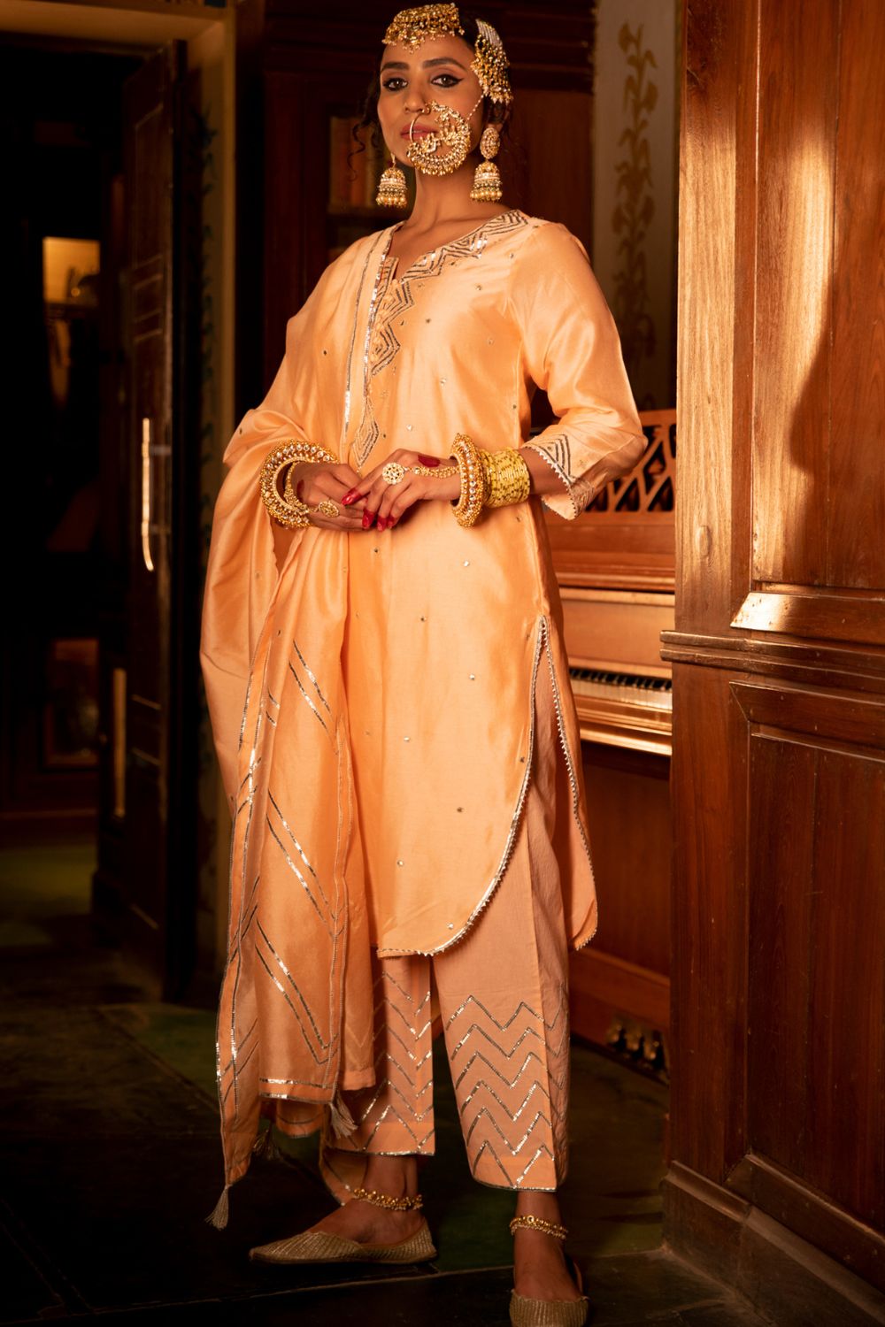 Enter the world of luxurious & regal clothing with Sahiba. Celebrate the grandeur of beauty, celebrations, dressing up and womanhood with vintage textiles and silhouettes. Set of 3 consists of kurta, pants and dupatta. KURTA: A pink chanderi silk kurta is detailed with silver gota embroidery . DUPATTA: A pink chanderi silk dupatta is detailed with hand embroidered gota dhari work and tassels. PANTS: Combined with pink cotton pants with gota embroidery