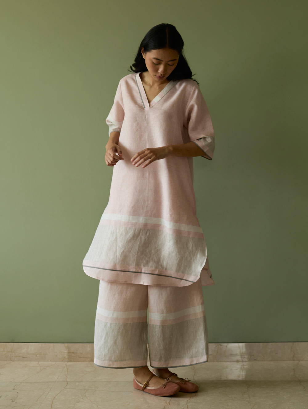 Kurta - This timeless versatile kurta is designed in our bespoke handwoven soft metallic border linen with a grey selvedge. The Iva Kurta has pockets and is accented with a metallic border at the hemline with a woven grey edging placed at the hemline, neckline and sleeves. The Iva works for all occasions and is one of our year-round favourites.