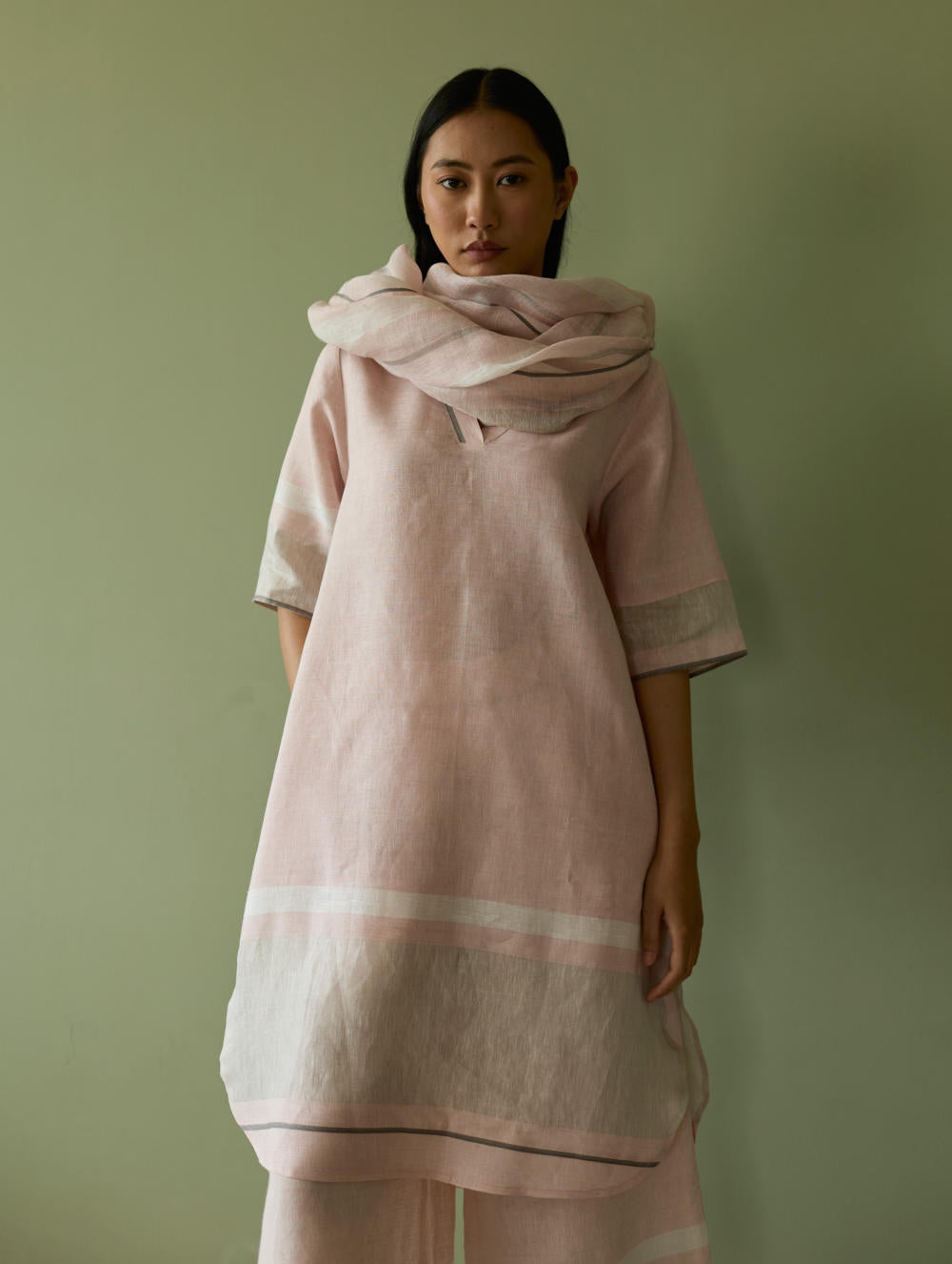 Dupatta - Soft handwoven pure linen dupatta with metallic border, featuring a mix of ivory and grey contrast stripes, adding depth and character to the minimalist blush palette. The dupatta is finished with intricate hand beadwok detailing on the edges.