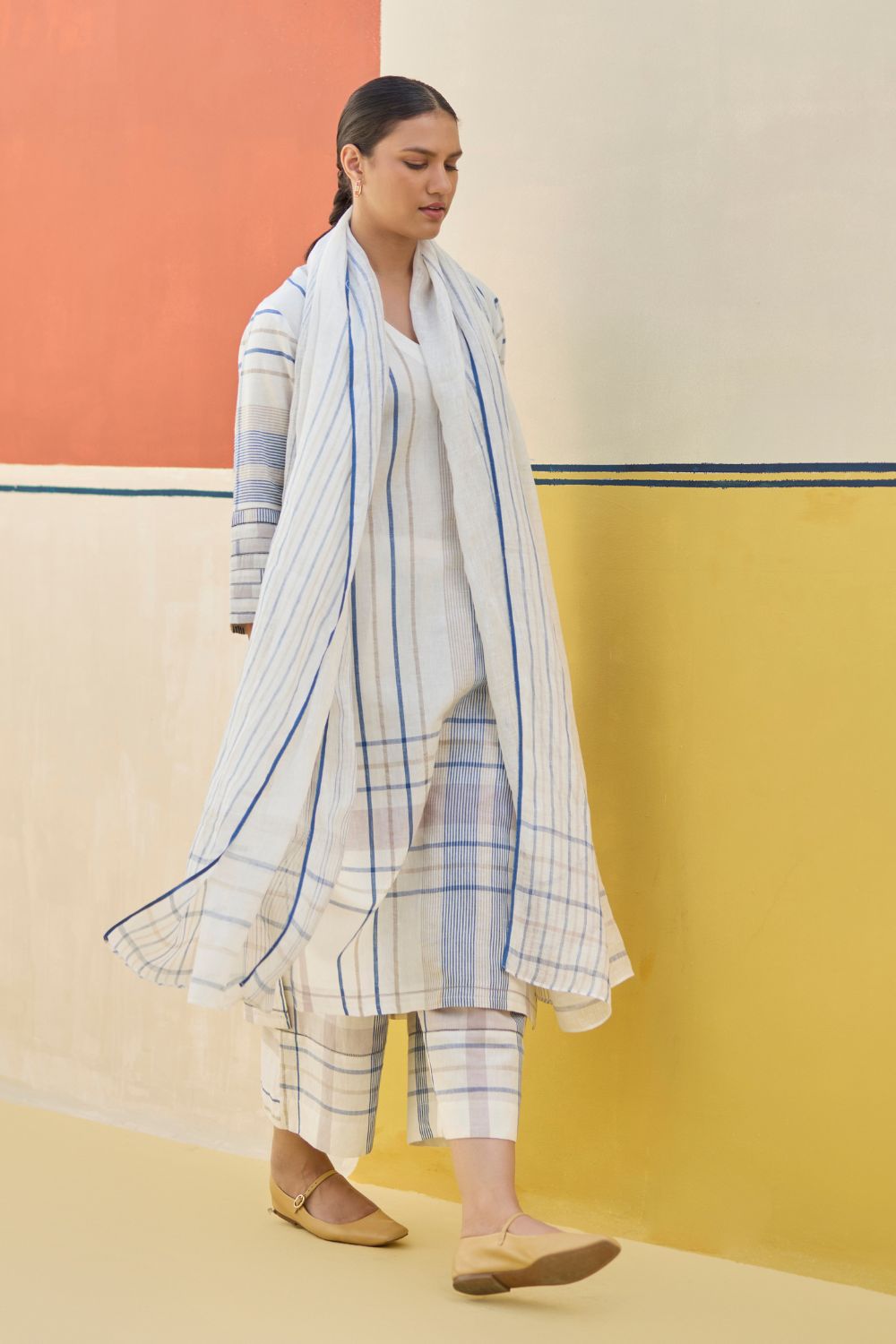 Kurta- A classic v-neck kurta in our soft handloom linen cotton blend woven in an abstract check and stripe pattern, finished with multiple hand-made jaali stitch lines on the sleeves and hem in pop colored threads. Pant- Our classic culottes, meticulously handcrafted from abstract handllom linen cotton woven checks and stripes. Featuring flattering pleats at the waistband, comfortable pockets, an elasticated back for comfort and an intricate jaali (mesh) detail in a vibrant pop color at the hem. Dupatta- A soft hand-woven dupatta with a multi-coloured stripe border in contrast colours on beautiful flowing sheer linen.