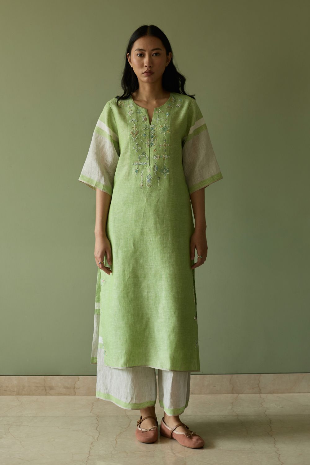 Kurta - A signature Manan kurta crafted from our soft handwoven metallic border linen with a soft grey selvedge. Hand-embroidered with intricate motifs, along the neckline and side slits, inspired by the timeless age-old Tangalia weave. The hand-embroidery is brought to life through meticulous multi-coloured french knots in threads and fine beadwork, creating a subtle pattern of texture and colour. Wear Vira with our flared pants for a statement, yet comfortable look.