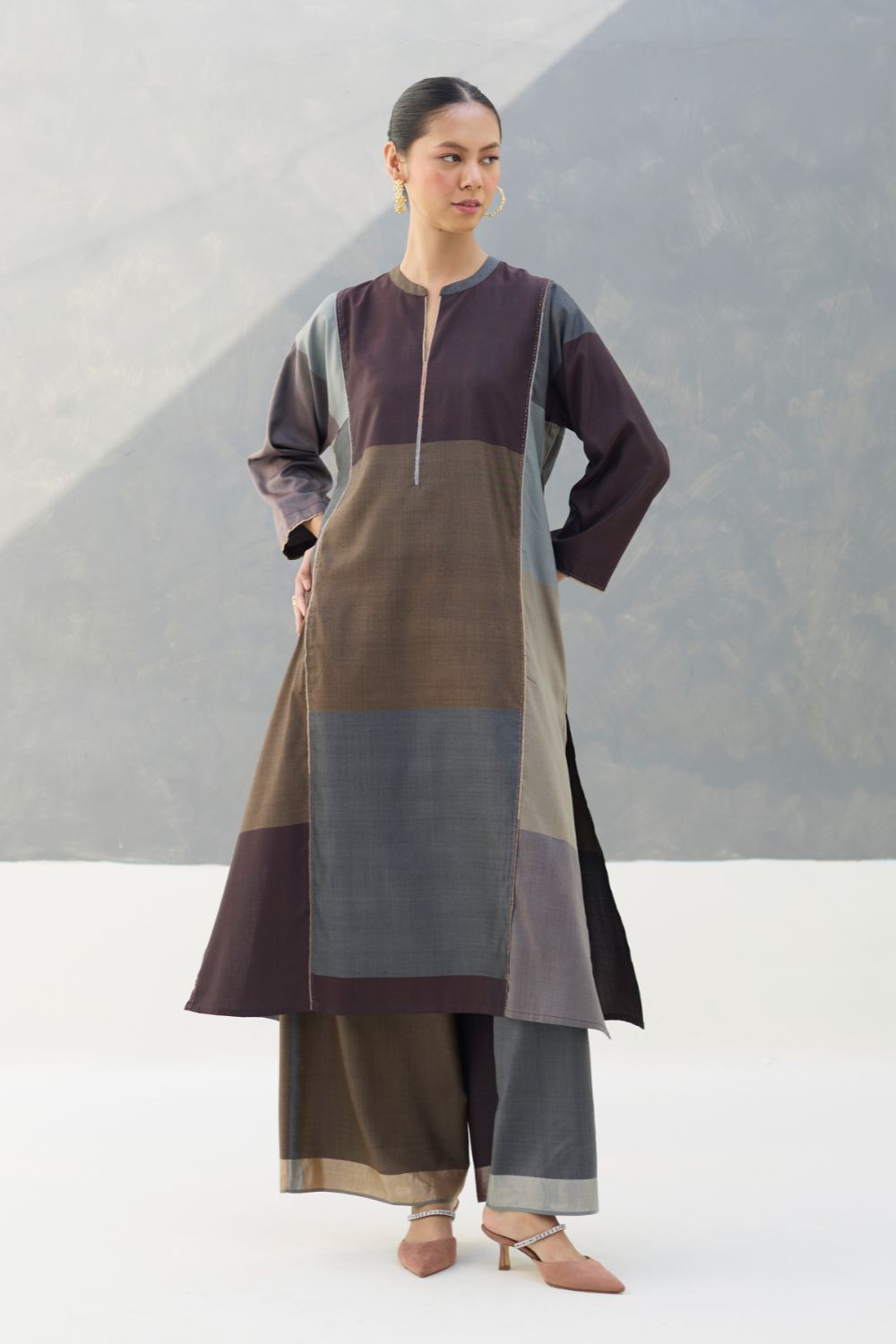 Kurta - This classic angrakha kurta is handcrafted in our soft eri (ahimsa) silk featuring a unique woven colour block pattern in 4-5 colours.The silhouette is accented with metallic woven piping throughout the side panels, adding a sharp, contrast element. Contrast hand-kantha stitch detailing is added along the front panels and at the sleeve hems, while the front neckline is finished with a thoughtful contrast-colour jaali detail. The kurta is designed for functionality and style, and is designed with comfortable pockets. Pant - The versatile culotte is crafted in our soft handloom eri (ahimsa) silk, woven as an oversized colour-block check pattern in 4-5 shades. Designed for comfort and functionality, the culottes include a back elasticated waistband with an inside drawstring for an adjustable fit, as well as comfortable pockets. The piece is intricately finished with a subtle woven metallic border at the hem.