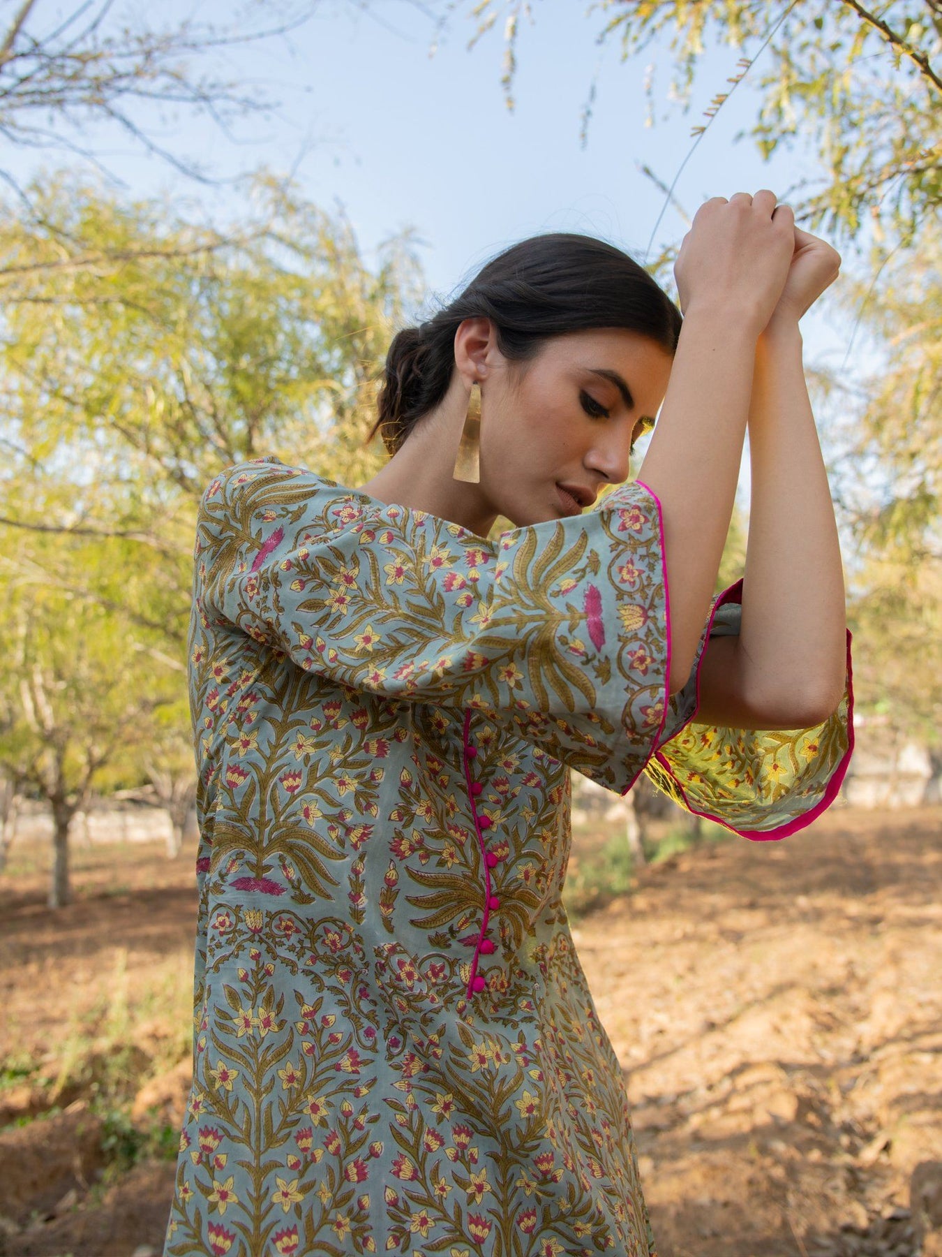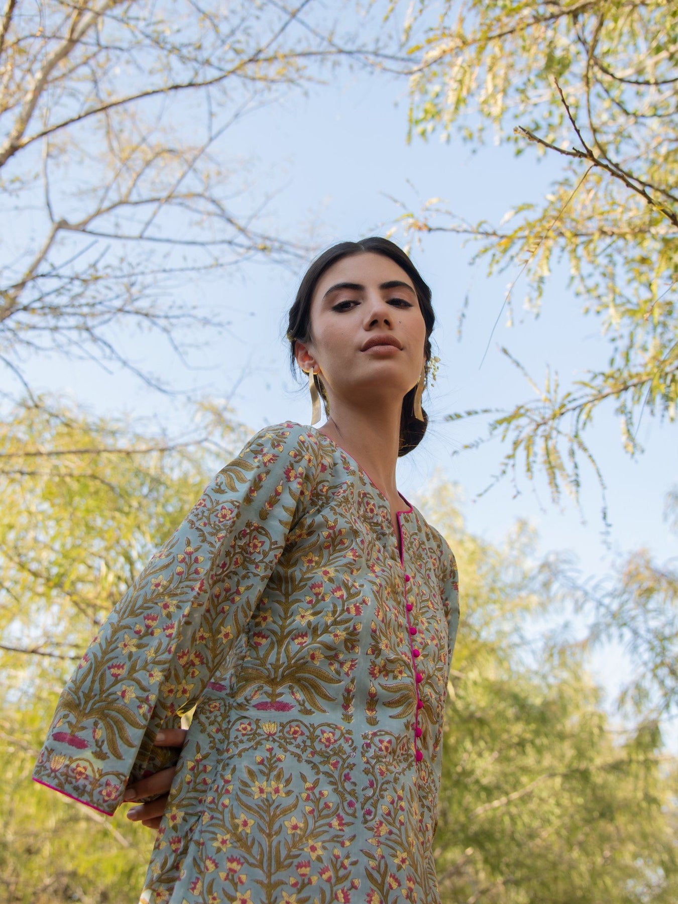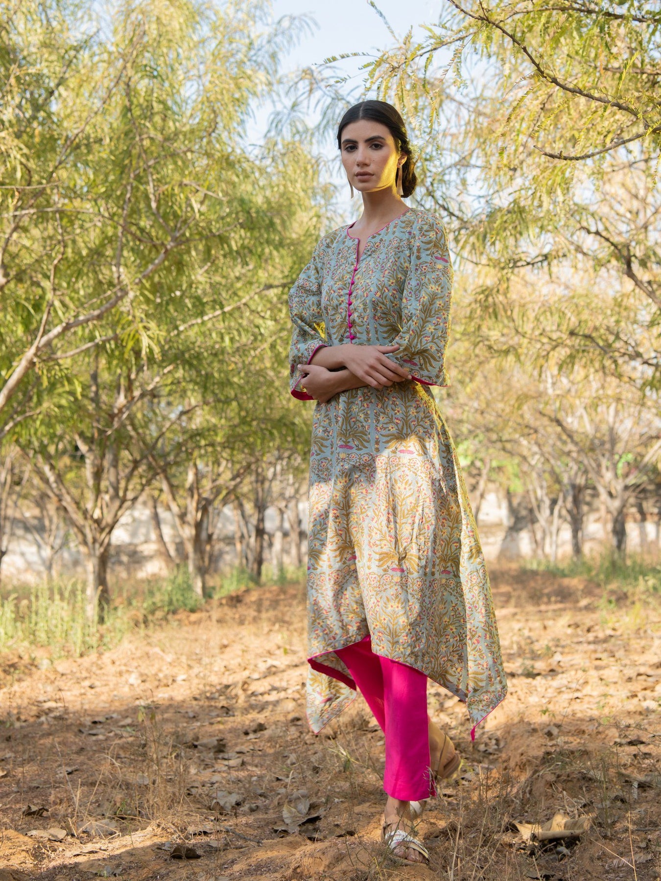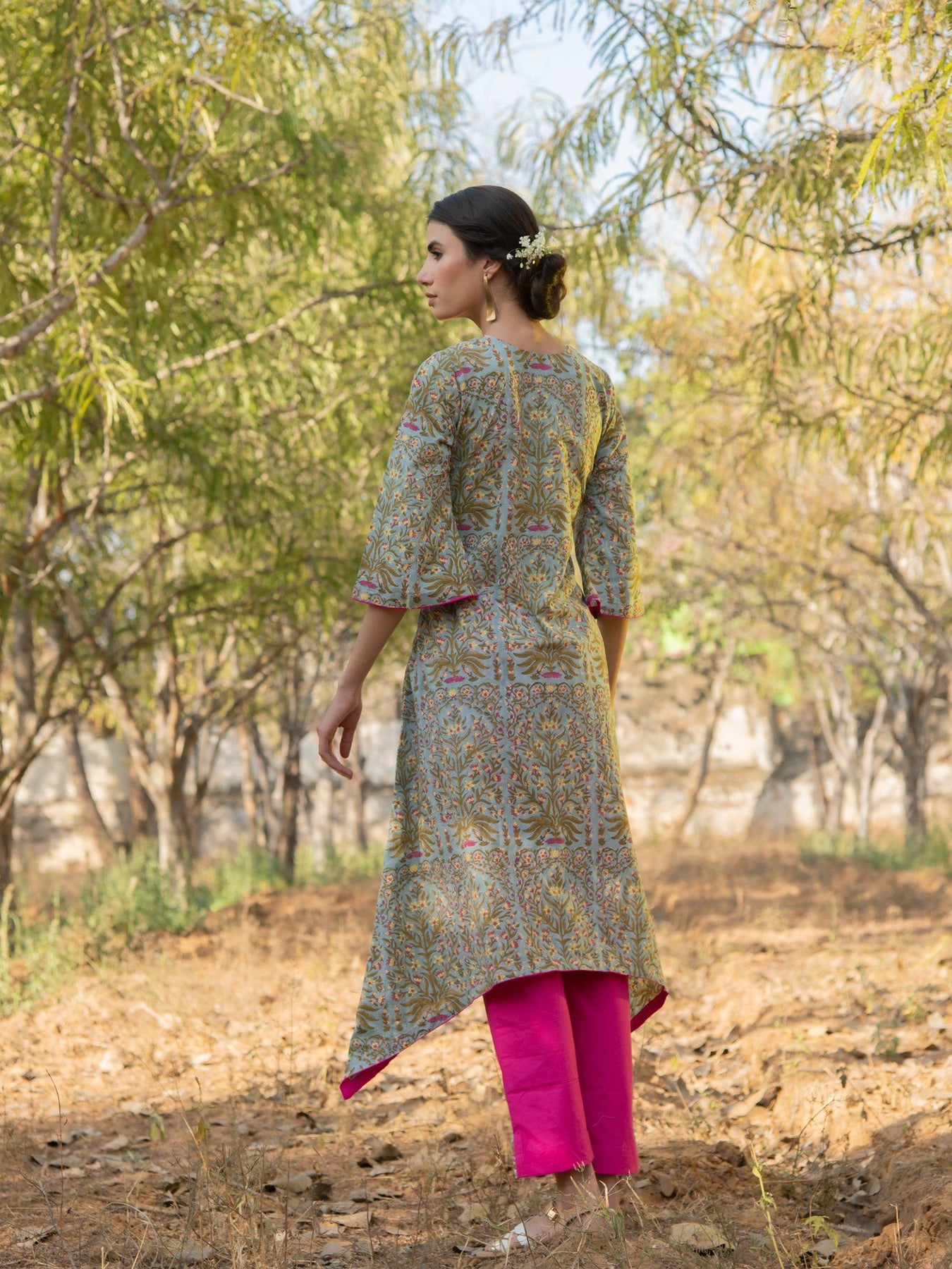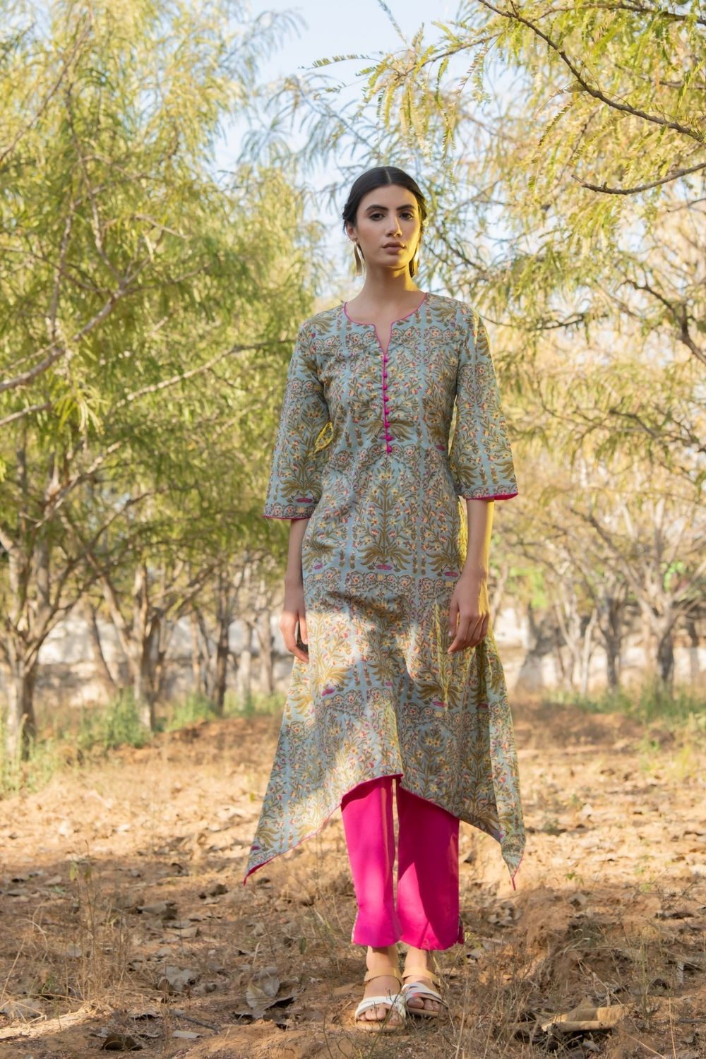 Pretty Mughal floral jaal on a summery cotton base. This asymmetrical hem kurta set is effortlessly stylish and perfect for the scorching summer heat.