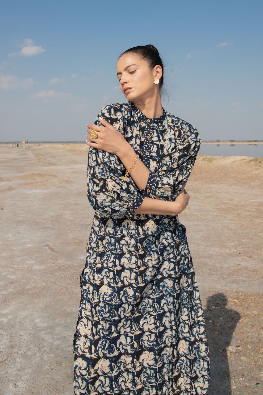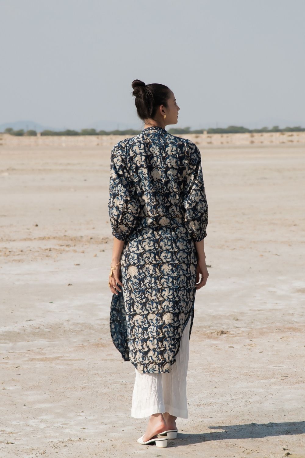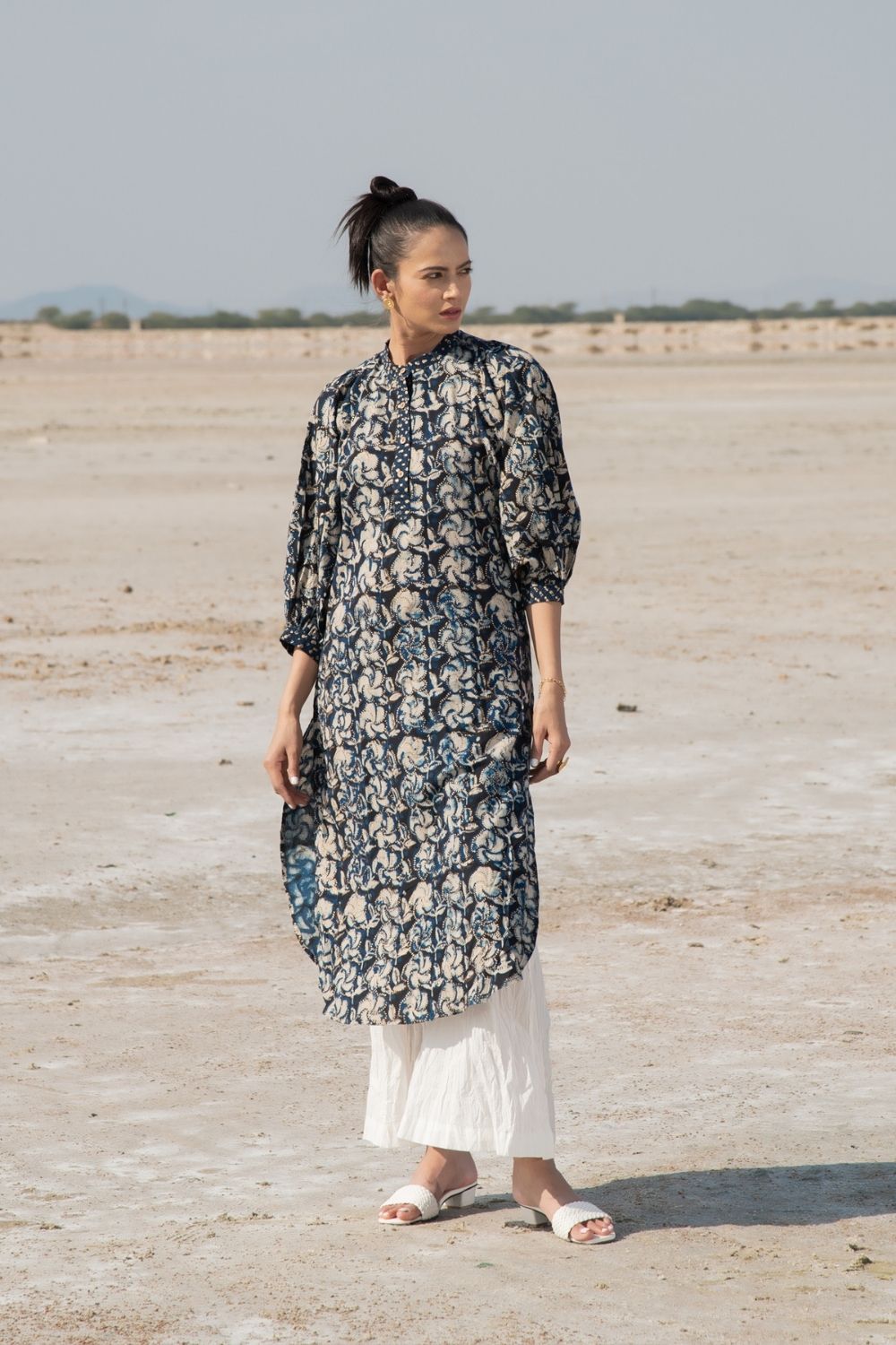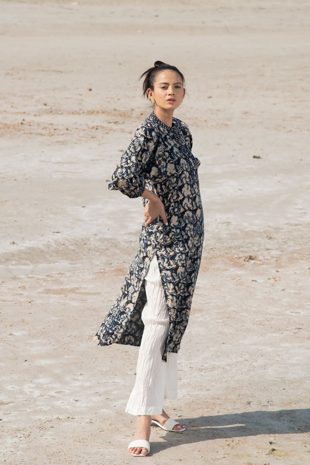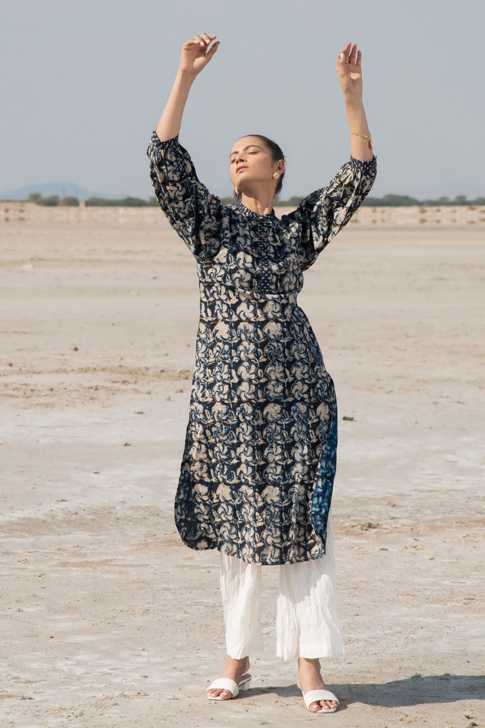 Inspired by the Singaporean orchid flower, the handblock print on this piece is stunning. A straight kurta complete with exaggerated kaftan sleeves, this outfit is a quintessential Indian piece. Comes with flared crush pants in cotton.