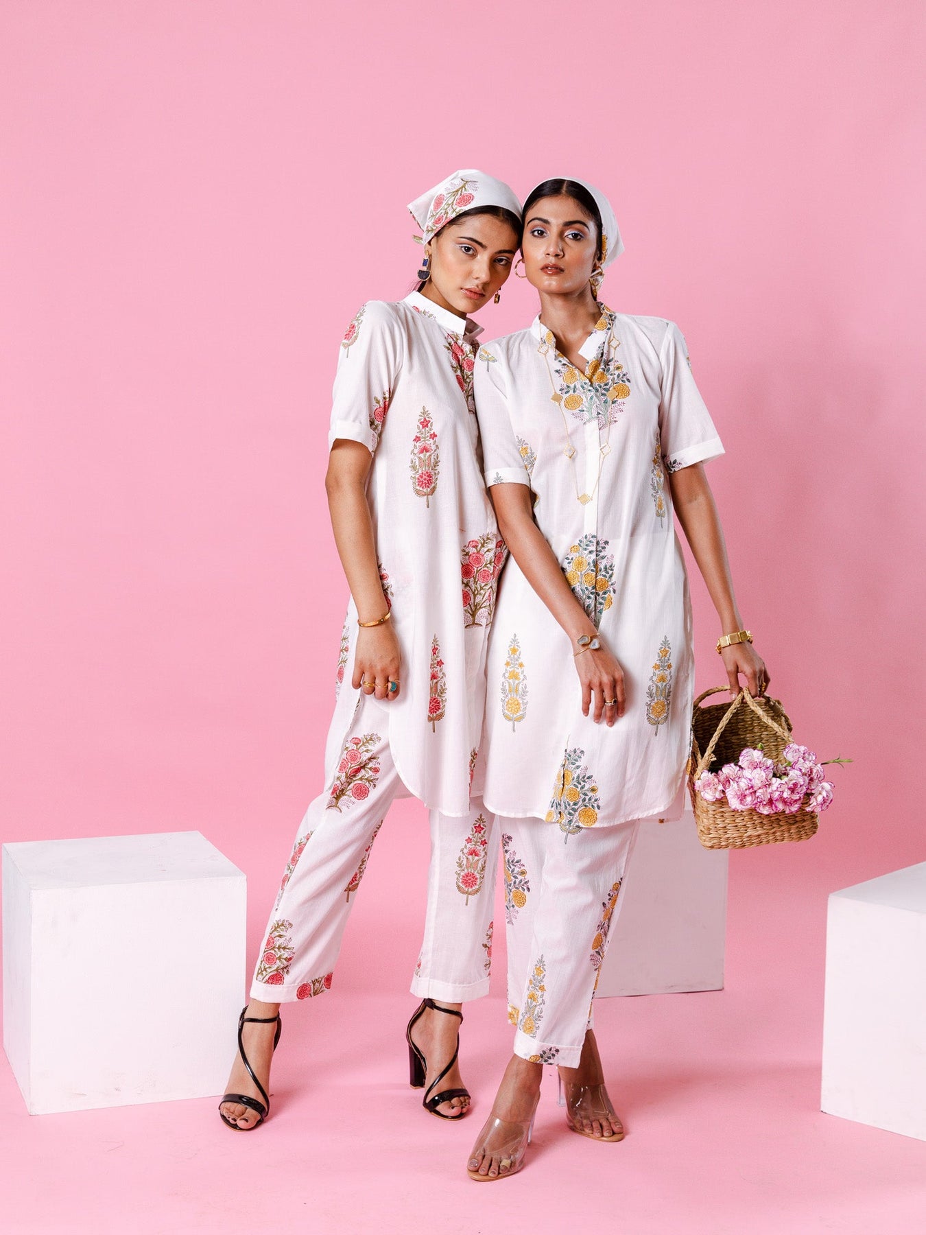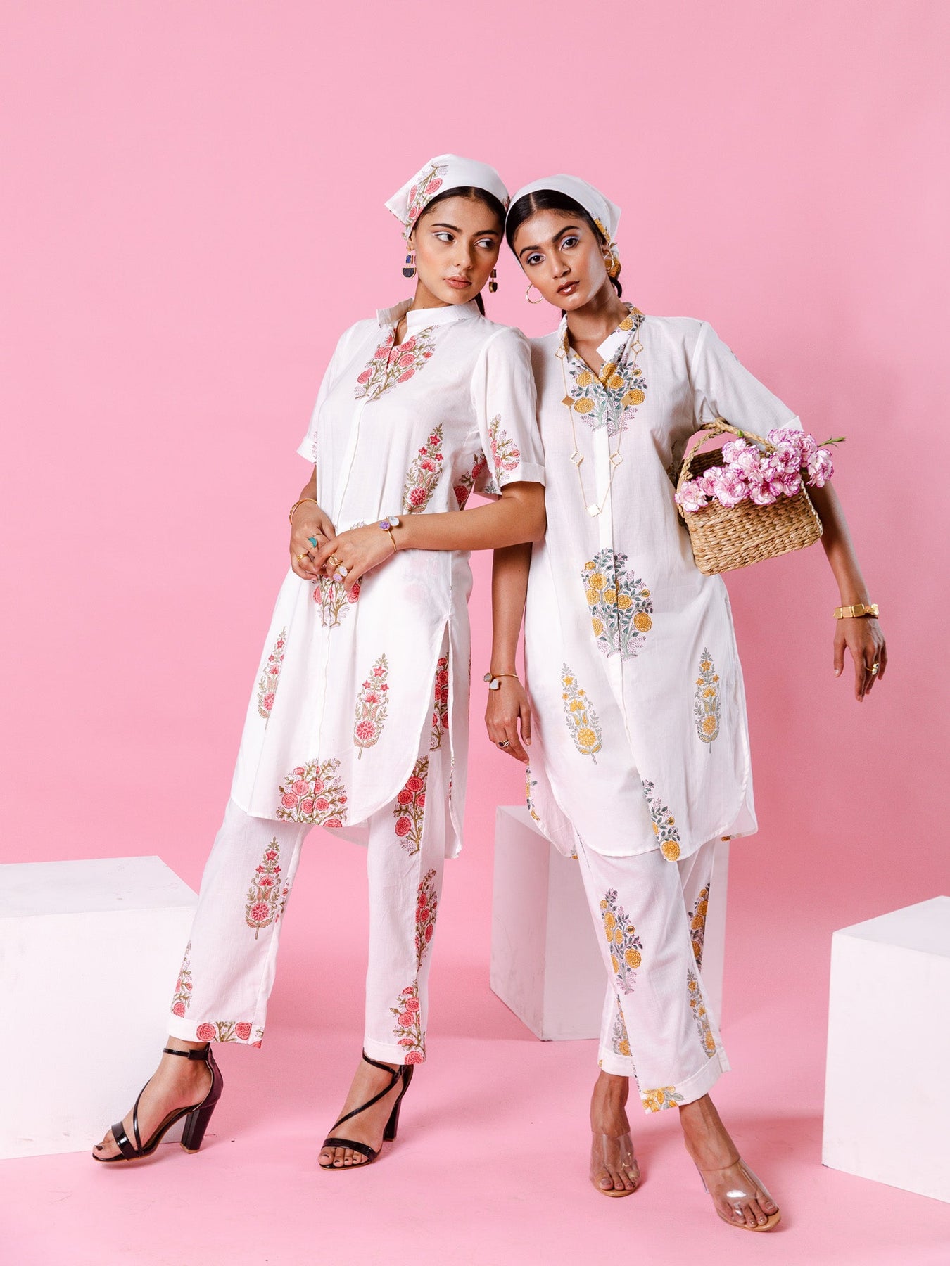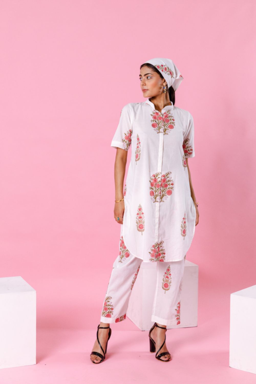 Delilah - Bright like the summer sun and beautiful like the first dawn of spring. Our forever essential co-ords for made for balmy summer. Florals on ivory remind us of English summers. This set consists of a hand-block printed tunic paired with matching trousers,