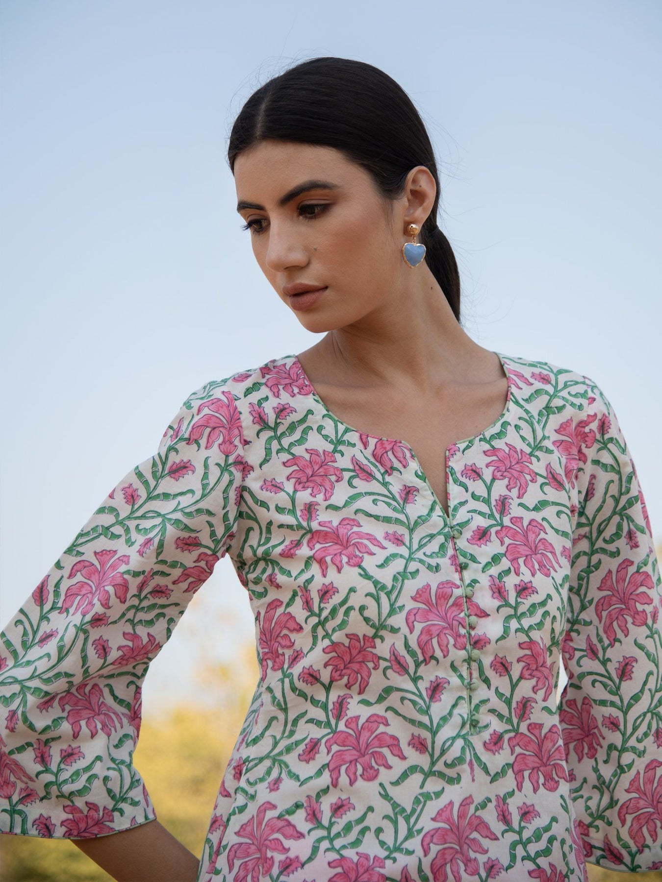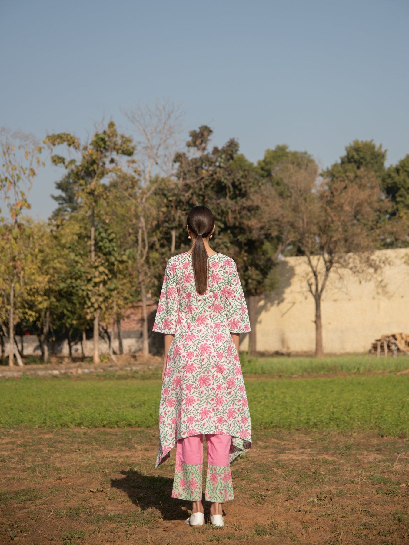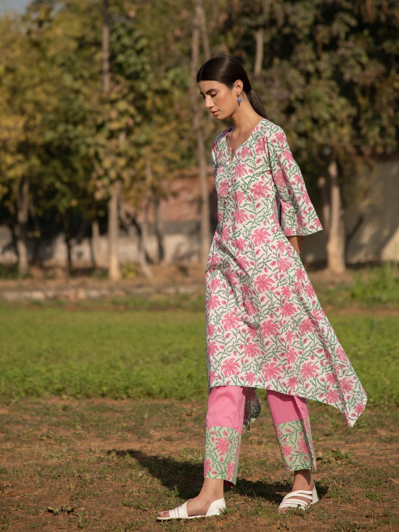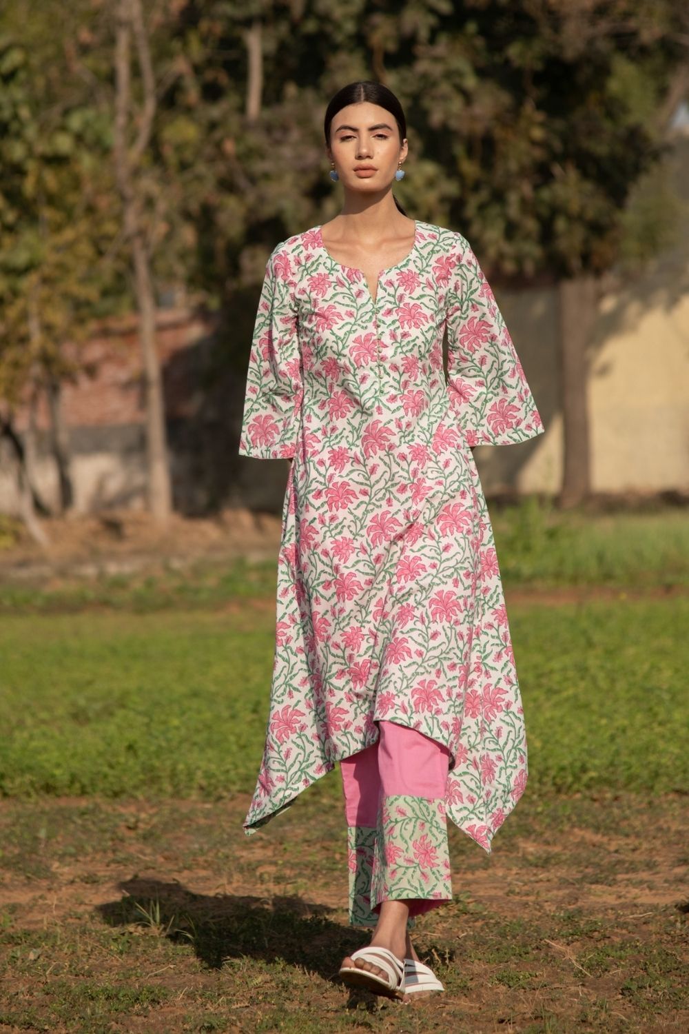 Pretty florals on a summery cotton base. This asymmetrical hem kurta set is effortlessly stylish and perfect for the scorching summer heat.